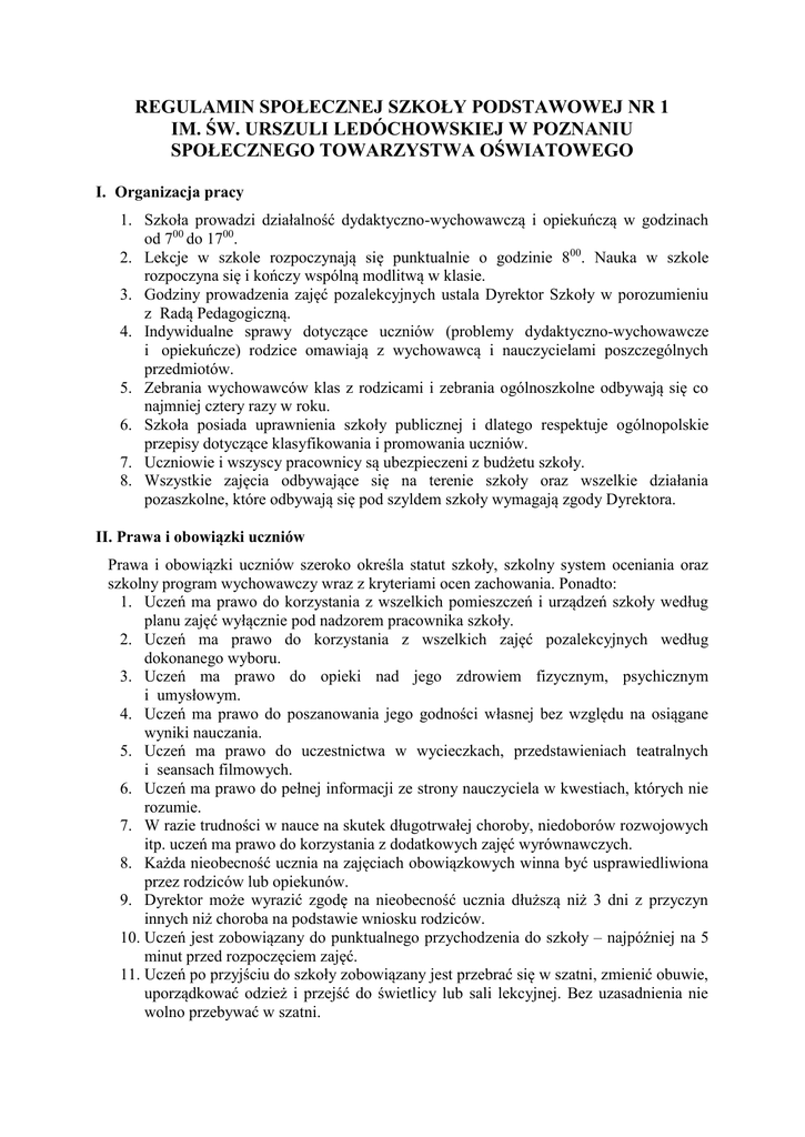REGULAMIN SPOŁECZNEJ SZKOŁY PODSTAWOWEJ NR 1 IM. ŚW. URSZULI LEDÓCHOWSKIEJ W POZNANIU SPOŁECZNEGO TOWARZYSTWA OŚWIATOWEGO I. Organizacja pracy 1. Szkoła prowadzi działalność dydaktyczno-wychowawczą i opiekuńczą w godzinach od 700 do 1700. 2. Lekcje w szkole rozpoczynają się punktualnie o godzinie 800. Nauka w szkole rozpoczyna się i kończy wspólną modlitwą w klasie. 3. Godziny prowadzenia zajęć pozalekcyjnych ustala Dyrektor Szkoły w porozumieniu z Radą Pedagogiczną. 4. Indywidualne sprawy dotyczące uczniów (problemy dydaktyczno-wychowawcze i opiekuńcze) rodzice omawiają z wychowawcą i nauczycielami poszczególnych przedmiotów. 5. Zebrania wychowawców klas z rodzicami i zebrania ogólnoszkolne odbywają się co najmniej cztery razy w roku. 6. Szkoła posiada uprawnienia szkoły publicznej i dlatego respektuje ogólnopolskie przepisy dotyczące klasyfikowania i promowania uczniów. 7. Uczniowie i wszyscy pracownicy są ubezpieczeni z budżetu szkoły. 8. Wszystkie zajęcia odbywające się na terenie szkoły oraz wszelkie działania pozaszkolne, które odbywają się pod szyldem szkoły wymagają zgody Dyrektora. II. Prawa i obowiązki uczniów Prawa i obowiązki uczniów szeroko określa statut szkoły, szkolny system oceniania oraz szkolny program wychowawczy wraz z kryteriami ocen zachowania. Ponadto: 1. Uczeń ma prawo do korzystania z wszelkich pomieszczeń i urządzeń szkoły według planu zajęć wyłącznie pod nadzorem pracownika szkoły. 2. Uczeń ma prawo do korzystania z wszelkich zajęć pozalekcyjnych według dokonanego wyboru. 3. Uczeń ma prawo do opieki nad jego zdrowiem fizycznym, psychicznym i umysłowym. 4. Uczeń ma prawo do poszanowania jego godności własnej bez względu na osiągane wyniki nauczania. 5. Uczeń ma prawo do uczestnictwa w wycieczkach, przedstawieniach teatralnych i seansach filmowych. 6. Uczeń ma prawo do pełnej informacji ze strony nauczyciela w kwestiach, których nie rozumie. 7. W razie trudności w nauce na skutek długotrwałej choroby, niedoborów rozwojowych itp. uczeń ma prawo do korzystania z dodatkowych zajęć wyrównawczych. 8. Każda nieobecność ucznia na zajęciach obowiązkowych winna być usprawiedliwiona przez rodziców lub opiekunów. 9. Dyrektor może wyrazić zgodę na nieobecność ucznia dłuższą niż 3 dni z przyczyn innych niż choroba na podstawie wniosku rodziców. 10. Uczeń jest zobowiązany do punktualnego przychodzenia do szkoły – najpóźniej na 5 minut przed rozpoczęciem zajęć. 11. Uczeń po przyjściu do szkoły zobowiązany jest przebrać się w szatni, zmienić obuwie, uporządkować odzież i przejść do świetlicy lub sali lekcyjnej. Bez uzasadnienia nie wolno przebywać w szatni. 12. W czasie przerw międzylekcyjnych wolno przebywać na korytarzu szkolnym, jednakże w trosce o bezpieczeństwo zakazuje się biegania po korytarzu i schodach. 13. W czasie pobytu w szkole uczeń ma obowiązek podporządkować się poleceniom nauczycieli i pracowników szkoły i szanować mienie szkoły. 14. W szkole przynależność do wspólnoty uczniów podkreśla jednolity częściowy strój codzienny, którego wzór ustala Zarząd SKT nr 15 STO po zasięgnięciu opinii Rady Pedagogicznej, Rady Rodziców i Samorządu Uczniowskiego. 15. Strój jednolity obejmuje jedynie górną część stroju (koszulkę z krótkim lub długim rękawem oraz bluzę); w odniesieniu do pozostałych części stroju obowiązuje stosowny, adekwatny do sytuacji ubiór. a. Dziewczęta mogą nosić zarówno spódnice do kolan, jak i spodnie (długie lub do wysokości kolan) w stonowanych kolorach; niedozwolone jest noszenie krótkich szortów lub spodenek gimnastycznych, poza lekcjami wychowania fizycznego. b. Chłopców obowiązują długie spodnie o klasycznym kroju w stonowanych kolorach. W okresie letnim spodnie mogą być nieco krótsze, ale o długości do kolan; niedozwolone jest noszenie krótkich szortów lub spodenek gimnastycznych, poza lekcjami wychowania fizycznego. 16. Jednolity strój szkolny obowiązuje ucznia przez cały czas pobytu w szkole (oprócz zajęć sportowych) oraz podczas wyjść odbywających się w czasie lekcji. 17. Uczniowie są zwolnieni z obowiązku noszenia jednolitego stroju szkolnego w dniach ogłoszonych przez Dyrektora Szkoły. Stroje noszone w te dni nie mogą naruszać zasad przyjętych w szkole. 18. Ewentualny jednorazowy brak jednolitego stroju szkolnego powinien być usprawiedliwiony pisemnie przez rodziców (prawnych opiekunów). 19. W czasie świąt szkolnych, uroczystości i innych wyjątkowych wydarzeń w życiu szkoły obowiązuje strój galowy i tarcza szkolna. Przez strój galowy należy rozumieć: a. dla dziewcząt: biała bluzka i granatowa lub czarna spódnica (nie krótsza niż do kolan) oraz niesportowe obuwie; b. dla chłopców: biała koszula i granatowe lub czarne spodnie (niesportowe) oraz niesportowe obuwie. 20. Możliwość korzystania uczniów z biblioteki, sali gimnastycznej i świetlicy określają odrębne regulaminy. 21. Obowiązuje zakaz samodzielnego opuszczania szkoły przez ucznia. a. W przypadku, gdy rodzice zezwolą dziecku na samodzielny powrót do domu, są zobowiązani złożyć na ręce wychowawcy pisemne oświadczenie o wzięciu odpowiedzialności za zdrowie i życie swojego dziecka. Oświadczenie znajduje się w dokumentacji szkoły. Oświadczenie odnawia się na początku każdego roku szkolnego. b. W przypadku nagłej konieczności opuszczenia szkoły w czasie zajęć rodzice zobowiązani są do pozostawienia informacji w sekretariacie. 22. Na boisku szkolnym obowiązuje zakaz chodzenia po drzewach, zaczepiania osób postronnych i samowolnego oddalania się z terenu, na którym uczeń przebywa. 23. Obowiązuje zakaz wykorzystywania telefonów komórkowych oraz innych elektronicznych środków łączności, rejestrowania audio i video podczas zajęć dydaktycznych z wyjątkiem sytuacji, w których korzystanie z takich urządzeń je