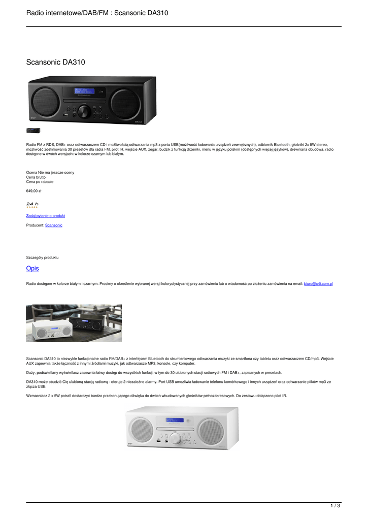 Radio internetowe/DAB/FM : Scansonic DA310 Scansonic DA310 Radio FM z RDS, DAB+ oraz odtwarzaczem CD i możliwością odtwarzania mp3 z portu USB(możliwość ładowania urządzeń zewnętrznych), odbiornik Bluetooth, głośniki 2x 5W stereo, możliwość zdefiniowania 30 presetów dla radia FM, pilot IR, wejście AUX, zegar, budzik z funkcją drzemki, menu w języku polskim (dostępnych więcej języków), drewniana obudowa, radio dostępne w dwóch wersjach: w kolorze czarnym lub białym. Ocena Nie ma jeszcze oceny Cena brutto Cena po rabacie 649,00 zł Zadaj pytanie o produkt Producent: Scansonic Szczegóły produktu Opis Radio dostępne w kolorze białym i czarnym. Prosimy o określenie wybranej wersji kolorystystycznej przy zamówieniu lub o wiadomość po złożeniu zamówienia na email: [email protected] Scansonic DA310 to niezwykle funkcjonalne radio FM/DAB+ z interfejsem Bluetooth do strumieniowego odtwarzania muzyki ze smartfona czy tabletu oraz odtwarzaczem CD/mp3. Wejście AUX zapewnia także łączność z innymi źródłami muzyki, jak odtwarzacze MP3, konsole, czy komputer. Duży, podświetlany wyświetlacz zapewnia łatwy dostęp do wszystkich funkcji, w tym do 30 ulubionych stacji radiowych FM i DAB+, zapisanych w presetach. DA310 może obudzić Cię ulubioną stacją radiową - oferuje 2 niezależne alarmy. Port USB umożliwia ładowanie telefonu komórkowego i innych urządzeń oraz odtwarzanie plików mp3 ze złącza USB. Wzmacniacz 2 x 5W potrafi dostarczyć bardzo przekonującego dźwięku do dwóch wbudowanych głośników pełnozakresowych. Do zestawu dołączono pilot IR. 1/3 Radio internetowe/DAB/FM : Scansonic DA310 Co to jest DAB+? DAB+ to standard cyfrowego radia, pozwalający cieszyć się najwyższej jakości dźwiękiem. Cyfrowe radio DAB+ służy do transmisji cyfrowej dźwięku w jakości porównywalnej z płytą CD oraz towarzyszącej przekazowi, grafiki oglądanej na kolorowym wyświetlaczu radia DAB. Ze względu na niższe koszty emisji dla nadawcy, możliwość transmisji zdjęć oraz bardzo dobrą jakość, cyfrowe radio w niedalekiej przyszłości zastąpi analogowe. W Polsce wprowadzane jest oficjalnie od 1 października 2013. Obecnie sygnał cyfrowy jest dostępny już w 18 miastach: Warszawie, Katowicach, Wrocławiu, Białystoku, Bydgoszczy, Gdańsku, Kielcach, Krakowie, Łodzi, Koszalinie, Lublinie, Opolu, Poznaniu, Olsztynie, Rzeszowie, Zielonej Górze oraz Toruniu i Szczecinie. Dzięki temu radio cyfrowe dociera do blisko 54 procent ludności naszego kraju, a do 2020 swoim zasięgiem obejmie całą Polskę. Rozgłośnie DAB+ są także dostępne w większości krajów Unii Europejskiej. Obecny skład multipleksu DAB+ : Polskie Radio Program 1, Polskie Radio Program 2, Polskie Radio Program 3, Polskie Radio Program 4, Radio Rytm, Polskie Radio 24, Radio Poland, Radio Dzieciom, Radio RDC (tylko w Warszawie), Radio Merkury (tylko w Poznaniu), Radio PIK (tylko w Bygdoszczy), program regionalny. Więcej o DAB+: Link 1 Link 2 Specyfikacja techniczna Radio DAB, DAB+ Radio FM z RDS (PLL) Zakres częstotliwości: DAB: 174-239 MHz, FM: 87.5-108 MHz Odbiornik Bluetooth Odtwarzacz CD i mp3 z USB 30 presetów stacji radiowych do ustawienia Wielofunkcyjny wyświetlacz matrycowy Głośniki stereo 2 x 5 W Zegar oraz podwójny alarm Funkcja Sleep Port USB do podłączenia pamięci USB oraz ładowania urządzeń zewnętrznych Wejście Aux Pilot IR Drewniana obudowa Kolor: Czarny lub biały, wysoki połysk Pobór mocy: 28W Pobór mocy w trybie czuwania ECO: <1W Wymiary: 350 mm (szer.) x 120 mm (wys.) x 190 mm (głęb.) Masa: 2,9kg English DA310 FM/DAB+, CD & Bluetooth Stereo System Loaded with features DA310 delivers whatever chosen programmed stereo in high quality sound. FM/DAB+/CD players with MP3, plus possibility of easy connection to your smartphone, tablet or any other Bluetooth device you might store music on. Features DAB+ radio FM Radio (PLL) Stereo CD Player MP3 Player Bluetooth for streaming Preset 30 favorite station Dual Alarm and Clock Sleep function Full function IR Remote control Materials Cabinet: Wood Finish: Glossy white, Glossy black Technical information Loudspeakers: 2 x 5 WATT RMS Input: AUX Jack Earphone Jack USB port for MP3 playback USB 5 Volt, 1000 mA for charging 2/3 Radio internetowe/DAB/FM : Scansonic DA310 Full function Matrix display Automatic DAB synchronised realtime clock Frequency range: DAB: 174-239 MHz, FM: 87.5-108 MHz Power Consumption: 28W Power Consumption ECO Standby: <1W Dimension: 350 mm (szer.) x 120 mm (głęb.) x 190 mm (wys.) Weight: 2,9kg BAR-CODE 5705656475701 BLACK BAR-CODE 5705656475718 WHITE Pliki do pobrania Instrukcja obsługi w jęz. polskim [tutaj] 3/3 Powered by TCPDF (www.tcpdf.org)