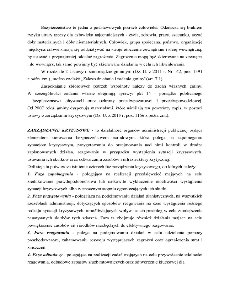 Bezpieczeństwo to jedna z podstawowych potrzeb człowieka. Odznacza się brakiem ryzyka utraty rzeczy dla człowieka najcenniejszych - życia, zdrowia, pracy, szacunku, uczuć dóbr materialnych i dóbr niematerialnych. Człowiek, grupa społeczna, państwo, organizacje międzynarodowe starają się oddziaływać na swoje otoczenie zewnętrzne i sferę wewnętrzną, by usuwać a przynajmniej oddalać zagrożenia. Zagrożenia mogą być skierowane na zewnątrz i do wewnątrz, tak samo powinny być skierowane działania w celu ich likwidowania. W rozdziale 2 Ustawy o samorządzie gminnym (Dz. U. z 2011 r. Nr 142, poz. 1591 z późn. zm.), można znaleźć „Zakres działania i zadania gminy”(art. 7.1). Zaspokajanie zbiorowych potrzeb wspólnoty należy do zadań własnych gminy. W szczególności zadania własne obejmują sprawy: pkt 14 - porządku publicznego i bezpieczeństwa obywateli oraz ochrony przeciwpożarowej i przeciwpowodziowej. Od 2007 roku, gminy dysponują materiałami, które uściślają ten powyższy zapis, w postaci ustawy o zarządzaniu kryzysowym (Dz. U. z 2013 r, poz. 1166 z późn. zm.). ZARZĄDZANIE KRYZYSOWE - to działalność organów administracji publicznej będąca elementem kierowania bezpieczeństwem narodowym, która polega na zapobieganiu sytuacjom kryzysowym, przygotowaniu do przejmowania nad nimi kontroli w drodze zaplanowanych działań, reagowaniu w przypadku wystąpienia sytuacji kryzysowych, usuwaniu ich skutków oraz odtwarzaniu zasobów i infrastruktury krytycznej. Definicja ta potwierdza istnienie czterech faz zarządzania kryzysowego, do których należy: 1. Faza zapobiegania - polegająca na realizacji przedsięwzięć mających na celu zredukowanie prawdopodobieństwa lub całkowite wykluczenie możliwości wystąpienia sytuacji kryzysowych albo w znacznym stopniu ograniczających ich skutki. 2. Faza przygotowania - polegająca na podejmowaniu działań planistycznych, na wszystkich szczeblach administracji, dotyczących sposobów reagowania na czas wystąpienia różnego rodzaju sytuacji kryzysowych, umożliwiających wpływ na ich przebieg w celu zmniejszenia negatywnych skutków tych zdarzeń. Faza ta obejmuje również działania mające na celu powiększenie zasobów sił i środków niezbędnych do efektywnego reagowania. 3. Faza reagowania - polega na podejmowaniu działań w celu udzielenia pomocy poszkodowanym, zahamowaniu rozwoju występujących zagrożeń oraz ograniczenia strat i zniszczeń. 4. Faza odbudowy - polegająca na realizacji zadań mających na celu przywrócenie zdolności reagowania, odbudowę zapasów służb ratowniczych oraz odtworzenie kluczowej dla funkcjonowania danego obszaru infrastruktury energetycznej, paliwowej, telekomunikacyjnej, transportowej oraz funkcjonowania innych ważnych usług, np. dostarczania wody. Uzupełnieniem definicji zarządzania kryzysowego jest określenie sytuacja kryzysowa, przez którą należy rozumieć sytuację wpływająca negatywnie na poziom bezpieczeństwa ludzi, mienia w znacznych rozmiarach lub środowiska, wywołująca znaczne ograniczenia w działaniu właściwych organów administracji publicznej ze względu na nieadekwatność sił posiadanych i środków. Organem właściwym w sprawach zarządzania kryzysowego na terenie gminy jest wójt. Do zadań wójta w sprawach zarządzania kryzysowego należy kierowanie działaniami związanymi z monitorowaniem, planowaniem, reagowaniem i usuwaniem skutków zagrożeń na terenie gminy oraz realizacji zadań z zakresu planowania cywilnego. Wójt na terenie gminy jest również organem właściwym do zarządzania, organizowania i prowadzenia szkoleń, ćwiczeń i treningów z zakresu reagowania na potencjalne zagrożenia. Wśród kompetencji wójta można również wyróżnić przeciwdziałania skutkom zdarzeń o charakterze terrorystycznym oraz zadania z zakresu ochrony infrastruktury krytycznej. Swoje zadania wójt wykonuje przy pomocy komórki organizacyjnej urzędu gminy właściwej w sprawach zarządzania kryzysowego. Organem pomocniczym wójta w zarządzaniu kryzysowym jest również gminny zespół zarządzania kryzysowego. Został on powołany przez wójta i wykonuje na obszarze gminy zadania związane z oceną występujących i potencjalnych zagrożeń mających wpływ na bezpieczeństwo publiczne, prognozowanie tych zagrożeń oraz przygotowanie propozycji działań. Ponadto przedstawia wójtowi wnioski dotyczące wykonania, zmiany lub zaniechania działań ujętych w gminnym planie zarządzania kryzysowego. Zespół ten przekazuje także do wiadomości publicznej informacje związane z zagrożeniami. W skład gminnego zespołu, którego pracami kieruje wójt, wchodzą osoby powołane spośród osób zatrudnionych w urzędzie gminy i gminnych jednostkach organizacyjnych. Do zapewnienia bezpieczeństwa publicznego zobowiązane są wszystkie organy władzy i administracji państwowej, szczególnie instytucje wyspecjalizowane w zapewnieniu bezpieczeństwa publicznego, jak np. Policja, Państwowa Straż Pożarna, które w realizacji swoich zadań wspierane są przez jednostki Ochotniczych Straży Pożarnych i inne służby