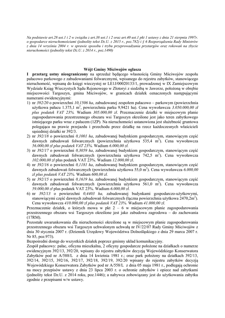 Na podstawie art.28 ust.1 i 2 w związku z art.38 ust.1 i 2 oraz art.40 ust.1 pkt 1 ustawy z dnia 21 sierpnia 1997r. o gospodarce nieruchomościami (jednolity tekst Dz.U. z 2015 r., poz.782) i § 6 Rozporządzenia Rady Ministrów z dnia 14 września 2004 r. w sprawie sposobu i trybu przeprowadzania przetargów oraz rokowań na zbycie nieruchomości (jednolity tekst Dz.U. z 2014 r., poz.1490) Wójt Gminy Mściwojów ogłasza I przetarg ustny nieograniczony na sprzedaż będącego własnością Gminy Mściwojów zespołu pałacowo parkowego z zabudowaniami folwarcznymi, wpisanego do rejestru zabytków, stanowiącego nieruchomość, wpisaną do księgi wieczystej nr LE1J/00020133/1, prowadzonej w IX Zamiejscowym Wydziale Ksiąg Wieczystych Sądu Rejonowego w Złotoryi z siedzibą w Jaworze, położoną w obrębie miejscowości Targoszyn, gmina Mściwojów, w granicach działek oznaczonych następującymi numerami ewidencyjnymi: 1) nr 392/20 o powierzchni 10,1506 ha, zabudowanej zespołem pałacowo – parkowym (powierzchnia użytkowa pałacu 1.375,1 m2, powierzchnia parku 9,9421 ha). Cena wywoławcza 3.050.000,00 zł plus podatek VAT 23%. Wadium 305.000,00 zł. Przeznaczenie działki w miejscowym planie zagospodarowania przestrzennego obszaru wsi Targoszyn określone jest jako teren zabytkowego istniejącego parku wraz z pałacem (1ZP). Na nieruchomości ustanowiona jest służebność gruntowa polegająca na prawie przejazdu i przechodu przez działkę na rzecz każdoczesnych właścicieli sąsiedniej działki nr 392/3. 2) nr 392/18 o powierzchni 0,1001 ha, zabudowanej budynkiem gospodarczym, stanowiącym część dawnych zabudowań folwarcznych (powierzchnia użytkowa 535,4 m2). Cena wywoławcza 56.000,00 zł plus podatek VAT 23%. Wadium 6.000,00 zł. 3) nr 392/17 o powierzchni 0,3059 ha, zabudowanej budynkiem gospodarczym, stanowiącym część dawnych zabudowań folwarcznych (powierzchnia użytkowa 742,5 m2). Cena wywoławcza 102.000,00 zł plus podatek VAT 23%. Wadium 12.000,00 zł. 4) nr 392/16 o powierzchni 0,1181 ha, zabudowanej budynkiem gospodarczym, stanowiącym część dawnych zabudowań folwarcznych (powierzchnia użytkowa 55,0 m2). Cena wywoławcza 6.000,00 zł plus podatek VAT 23%. Wadium 600,00 zł. 5) nr 392/15 o powierzchni 0,1619 ha, zabudowanej budynkiem gospodarczym, stanowiącym część dawnych zabudowań folwarcznych (powierzchnia użytkowa 561,0 m2). Cena wywoławcza 59.000,00 zł plus podatek VAT 23%. Wadium 6.000,00 zł. 6) nr 392/13 o powierzchni 0,4403 ha, zabudowanej budynkami gospodarczo-użytkowymi, stanowiącymi część dawnych zabudowań folwarcznych (łączna powierzchnia użytkowa 2470,2m2). Cena wywoławcza 410.000,00 zł plus podatek VAT 23%. Wadium 41.000,00 zł. Przeznaczenie działek, o których mowa w pkt 2 – 6 w miejscowym planie zagospodarowania przestrzennego obszaru wsi Targoszyn określone jest jako zabudowa zagrodowa – do zachowania (17RM). Pozostałe uwarunkowania dla nieruchomości określone są w miejscowym planie zagospodarowania przestrzennego obszaru wsi Targoszyn uchwalonym uchwałą nr IV/22/07 Rady Gminy Mściwojów z dnia 30 stycznia 2007 r. (Dziennik Urzędowy Województwa Dolnośląskiego z dnia 29 marca 2007 r. Nr 85, poz.973). Bezpośredni dostęp do wszystkich działek poprzez gminny układ komunikacyjny. Zespół pałacowy: pałac, oficyna mieszkalna, 2 oficyny gospodarcze położone na działkach o numerze ewidencyjnym 392/13, 392/20, wpisany do rejestru zabytków decyzją Wojewódzkiego Konserwatora Zabytków pod nr A/588/L z dnia 14 kwietnia 1981 r.; oraz park położony na działkach 392/13, 392/14, 392/15, 392/16, 392/17, 392/18, 392/19, 392/20 wpisany do rejestru zabytków decyzją Wojewódzkiego Konserwatora Zabytków pod nr A/558/L z dnia 05 maja 1981 r., podlegają ochronie na mocy przepisów ustawy z dnia 23 lipca 2003 r. o ochronie zabytków i opiece nad zabytkami (jednolity tekst Dz.U. z 2014 roku, poz.1446); a nabywca zobowiązany jest do użytkowania zabytku zgodnie z przepisami w/w ustawy. Prowadzenie wszelkich prac przy zabytkach wpisanych do rejestru, a także dokonywanie jego podziału, zmiana jego przeznaczenia lub sposobu korzystania z tego zabytku oraz podejmowanie innych działań, które mogłyby prowadzić do naruszenia substancji lub zmiany wyglądu zabytku wpisanego do rejestru, wymaga uzyskania pozwolenia Wojewódzkiego Konserwatora Zabytków. Nieruchomość poza ustanowioną służebnością gruntową jest wolna od wszelkich długów i obciążeń. Od ceny nieruchomości (poszczególnych działek) osiągniętej w wyniku przetargu zostanie udzielona bonifikata w wysokości 10%. Postąpienie wynosi nie mniej niż 1% ceny wywoławczej z zaokrągleniem w górę do pełnych dziesiątek złotych. Przetarg przeprowadzony zostanie na każdą działkę oddzielnie. W przetargu mogą uczestniczyć osoby fizyczne i prawne, jeżeli wniosą wadium w pieniądzu na konto Gminy Mściwojów - BS Jawor O/Mściwojów 74 8647 1020 0210 0003 2002 0001 w terminie najpóźniej do dnia 03 września 2015 r. Za datę wniesienia wadium uważa się datę wpływu środków pieniężnych na w/w konto. Na dowodzie wpłaty wadium należy wpisać nazwę obrębu i numer działki będącej przedmiotem przetargu. Uczestnicy przystępujący do przetargu zobowiązani są do przedłożenia komisji przetargowej przed otwarciem przetargu dokumenty stwierdzające tożsamość a także do okazania dowodu wpłaty wadium, a w przypadku występowania w imieniu osoby fizycznej lub prawnej również dokumentu w formie aktu notarialnego upoważniającego do ich reprezentowania. Małżonkowie biorą udział w przetargu osobiście lub okazując pełnomocnictwo współmałżonka, sporządzone w formie aktu notarialnego. Wadium wpłacone przez uczestnika przetargu, który wygra przetarg, zaliczone zostanie na poczet ceny nabycia nieruchomości. Pozostała część ceny nabycia osiągniętej w przetargu, podlega zapłacie najpóźniej na trzy prze