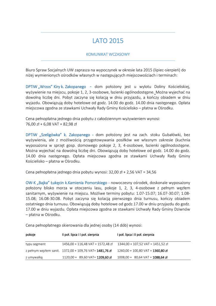 LATO 2015 KOMUNIKAT WCZASOWY Biuro Spraw Socjalnych UW zaprasza na wypoczynek w okresie lata 2015 (lipiec-sierpień) do niżej wymienionych ośrodków własnych w następujących miejscowościach i terminach: DPTiW „Wrzos” Kiry k. Zakopanego - dom położony jest u wylotu Doliny Kościeliskiej, wyżywienie na miejscu, pokoje 1, 2, 3-osobowe, łazienki ogólnodostępne. Można wyjechać na dowolną liczbę dni. Pobyt zaczyna się kolacją w dniu przyjazdu, a kończy obiadem w dniu wyjazdu. Obowiązują doby hotelowe od godz. 14.00 do godz. 14.00 dnia następnego. Opłata miejscowa zgodna ze stawkami Uchwały Rady Gminy Kościelisko – płatna w Ośrodku. Cena pełnopłatna jednego dnia pobytu z całodziennym wyżywieniem wynosi: 76,00 zł + 6,08 VAT = 82,98 zł DPTiW „Szeligówka” k. Zakopanego - dom położony jest na zach. stoku Gubałówki, bez wyżywienia, ale z możliwością przygotowywania posiłków we własnym zakresie (kuchnia wyposażona w sprzęt gosp. domowego pokoje 2, 3, 4-osobowe, łazienki ogólnodostępne. Można wyjechać na dowolną liczbę dni. Obowiązują doby hotelowe od godz. 14.00 do godz. 14.00 dnia następnego. Opłata miejscowa zgodna ze stawkami Uchwały Rady Gminy Kościelisko – płatna w Ośrodku. Cena pełnopłatna jednego dnia pobytu wynosi: 32,00 zł + 2,56 VAT = 34,56 OW-K „Bajka” Łukęcin k.Kamienia Pomorskiego - nowoczesny ośrodek, doskonale wyposażony położony blisko morza w otoczeniu lasu, pokoje 1, 2, 3, 4-osobowe z pełnym węzłem sanitarnym, wyżywienie na miejscu. Możliwe terminy pobytu: 1.07-15.07; 16.07-30.07; 1.0815.08; 16.08-30.08. Pobyt zaczyna się kolacją pierwszego dnia turnusu, kończy obiadem ostatniego dnia turnusu. Obowiązują doby hotelowe od godz.17.00 w dniu przyjazdu do godz. 17.00 w dniu wyjazdu. Opłata miejscowa zgodna ze stawkami Uchwały Rady Gminy Dziwnów – płatna w Ośrodku. Cena pełnopłatnego skierowania dla jednej osoby (14 dób) wynosi: pokoje II poł. lipca i I poł. sierpnia I poł. lipca i II poł. sierpnia typu segment 1456,00 + 116,48 VAT = 1572,48 zł 1344,00 + 107,52 VAT = 1451,52 zł z pełnym węzłem sanit. 1372,00 + 109,76 VAT= 1481,76 zł 1260,00 + 100,80 VAT = 1360,80 zł z umywalką 1008,00 + 80,64 VAT = 1088,64 zł 1120,00 + 89,60 VAT= 1209,60 zł Rezerwacja miejsc na lato przyjmowana jest od 2 marca w Biurze Spraw Socjalnych (mały dziedziniec, I piętro, pokój 16, tel. 22 55 20 419). Decyduje kolejność zgłoszenia rezerwacji. Opłaty należy uiścić w następujących terminach: - za wyjazd w lipcu do 22 maja - za wyjazd w sierpniu do 22 czerwca Osobom, które nie opłacą należności za wczasy w powyższych terminach i nie poinformują BSSoc. o dokonanej wpłacie rezerwacja zostanie anulowana. Z-ca Kierownika Biura Spraw Socjalnych Anna Lachowska