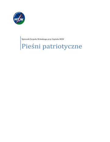 Śpiewnik Zespołu Wokalnego przy Szpitalu MSW Pieśni patriotyczne Spis treści Hymn Warmiński……………………………………………………………….……. 3 Maszerują chłopcy…………………………………………………………………… 3 O mój rozmarynie………………………………………………………….………… 4 Przybyli ułani pod okienko……………………………….………………………… 4 Białe róże…………………………………………………………………………… 5 Dziś do ciebie przyjść nie mogę……………………………………………………… 5 Raduje się serce……………………………………………………………………… 6 Legiony………………………………………………………………………………. 6 Płonie ognisko………………………………………………………………………... 7 Serce w plecaku………………………………………………………………………. 7 Mury………………………………………………………………………………….. 8 Matczyne ręce………………………………………………………………………... 8 Wojenko wojenko……………………………………………………………………. 9 Hej hej ułani…………………………………………………………………………. 9 My ze spalonych wsi………………………………………………………………… 9 Rozszumiały się wierzby płaczące…………………………………………………… 10 Marsz pierwszego korpusu………………………………………………………….. 10 Oka…………………………………………………………………………………… 11 Pieśń o wodzu miłym………………………………………………………………… 11 Żeby Polska była Polską……………………………………………………………... 12 Czerwone maki……………………………………………………………………….. 12 Śpiewnik Zespołu Wokalnego przy Szpitalu MSW 2 Hymn Warmiński Maszerują chłopcy O Warmio moja miła Rodzinna ziemio ma. Tyś mnie do snu tuliła, Miłością pierś ma drga Zdradziecko byłaś wzięta, Bo chytry był nasz wróg Niewoli srogie pęta, Rozerwał dziś sam Bóg! Nie noszą lampasów, lecz szary ich strój, Nie noszą ni srebra, ni złota, Lecz w pierwszym szeregu, podąża na bój Piechota, ta szara piechota. My Warmii wierne dzieci Kochamy ten nasz kraj, Po latach burz, zamieci Zabłysnął szczęścia raj. Olsztyński zamek stary, Krzyżactwa mieścił ród, Dziś polskie tam sztandary I odrodzenia cud. Idą, a w słońcu kołysze się stal, Dziewczęta zerkają zza płota, A oczy ich dumnie utkwione są w dal, Piechota, ta szara piechota. Gnębiły Warmię wrogi, aż światem wstrząsnął bój I biały orzeł drogi Lot ku niej zwrócił swój. O Warmio zmartwychwstała, Twych dzieci usłysz śpiew O Warmio, Polska cała, Za ciebie lała krew. Maszerują chłopcy, maszerują, Karabiny błyszczą, szary strój, A przed nimi drzewa salutują, Bo za naszą Polskę idą w bój! Maszerują chłopcy... itd Nie grają im surmy, nie huczy im spiż, A śmierć im pod stopy się miota, Lecz czoła ich dumnie wzniesione są wzwyż, Piechota, ta szara piechota. Maszerują chłopcy... itd Miarowo bagnetów kołysze się łan, A w sercu ich szczera ochota, Ze śpiewam do boju wyrusza jak w tan, Piechota, ta szara piechota. Maszerują chłopcy... itd Śpiewnik Zespołu Wokalnego przy Szpitalu MSW 3 O mój rozmarynie Przybyli ułani pod okienko O mój rozmarynie, rozwijaj się O mój rozmarynie rozwijaj się Pójdę do dziewczyny, pójdę do jedynej Zapytam się. Przybyli ułani pod okienko, (bis) Pukają, wołają: "puść panienko! "(bis) A jak mi odpowie: nie kocham cię, A jak mi odpowie nie kocham cię, Ułani werbują, strzelcy maszerują Zaciągnę się. Dadzą mi konika cisawego Dadzą mi konika cisawego I ostrą szabelkę, i ostrą szabelkę Do boku mego. Dadzą mi kabacik z wyłogami Dadzą mi kabacik z wyłogami I czarne buciki i czarne buciki Z ostrogami Dadzą mi manierkę z gorzałczyną Dadzą mi manierkę z gorzałczyną Ażebym nie tęsknił, ażebym nie tęsknił Za dziewczyną. Pójdziemy z okopów na bagnety, Pójdziemy z okopów na bagnety, Bagnet mnie ukłuje, śmierć mnie ucałuje, Ale nie ty. Zaświecił miesiączek do okienka, W koszulce stanęła w nim panienka. "O Jezu, a cóż to za wojacy?" "Otwieraj! Nie bój się to czwartacy!" "O Jezu! A dokąd Bóg prowadzi?" "Warszawę odwiedzić byśmy radzi. Gdy zwiedzim Warszawę, już nam pilno Zobaczyć to stare nasze Wilno. . A z Wilna już droga jest gotowa, Prowadzi prościutko aż do Lwowa. "O Jezu, a cóż to za mizeria?" "Otwórz no, panienko! Kawaleria." Przyszliśmy napoić nasze konie, Za nami piechoty pełne błonie." "O Jezu! A cóż to za hołota?" "Otwórz panienko! To piechota!" Panienka otwierać podskoczyła, Żołnierzy do środka zaprosiła Śpiewnik Zespołu Wokalnego przy Szpitalu MSW 4 Białe róże Dziś do ciebie przyjść nie mogę, Rozkwitają pąki białych róż, Wróć, Jasieńku, z tej wojenki już, Wróć, ucałuj, jak za dawnych lat, Dam ci za to róży najpiękniejszy kwiat. Dziś do ciebie przyjść nie mogę, Zaraz idę w nocy mrok, Nie wyglądaj za mną oknem, W mgle utonie próżno wzrok. Po cóż ci, kochanie, wiedzieć, Że do lasu idę spać. Dłużej tu nie mogę siedzieć, Na mnie czeka leśna brać. Dłużej tu nie mogę siedzieć, Na mnie czeka leśna brać. Kładłam ci ja idącemu w bój, Białą różę na karabin twój, Nimeś odszedł, mój Jasieńku, stąd, Nimeś próg przestąpił, kwiat na ziemi zwiądł. Przyszła wiosna lato jesień już Przekwitły pąki białych róż Cóż ci teraz dam, Jasieńku, hej, Gdy z woje