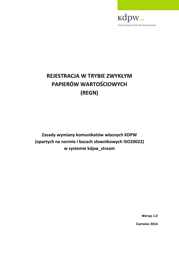 REJESTRACJA W TRYBIE ZWYKŁYM PAPIERÓW WARTOŚCIOWYCH (REGN) Zasady wymiany komunikatów własnych KDPW (opartych na normie i bazach słownikowych ISO20022) w systemie kdpw_stream Wersja 1.0 Czerwiec 2014 KDPW S.A. Spis treści 1. WSTĘP ......................................................................................................................................... 4 2. OBSŁUGA REJESTRACJI PAPIERÓW WARTOŚCIOWYCH W TRYBIE ZWYKŁYM ............................ 5 2.1 Informacje Ogólne ........................................................................................................................ 5 2.2 Obsługa ......................................................................................................................................... 5 2.2.1 Informowanie o rejestracji ............................................................................................... 5 Strona | 2 KDPW S.A. Metryka Zmian Data 25.06.2014 Autor KDPW S.A. Zmiana Utworzenie dokumentu v.1.0 Strona | 3 KDPW S.A. 1. WSTĘP Dokument opisuje budowę i zasady przekazywania komunikatów własnych KDPW w zakresie obsługi rejestracji papierów wartościowych w trybie zwykłym w ramach systemu kdpw_stream. Norma ISO20022 nie zawiera komunikatów dla rejestracji/emisji p.w., dlatego też komunikaty zaprojektowane dla rejestracji w tym trybie są komunikatami własnymi, opartymi na strukturze oraz bazach słownikowych ISO20222 W dokumencie przedstawiono przepływ komunikatów jak również zakres wykorzystywanych komponentów i elementów komunikatów w zakresie obsługi rejestracji papierów wartościowych w trybie zwykłym. Budowa nagłówka komunikatów (Business Application Header – BAH) jest tożsama z budową BAH przedstawioną w materiałach informacyjnych dot. obsługi prawa poboru. Przygotowana propozycja rozwiązań dotyczy papierów wartościowych, dla których depozytem macierzystym jest KDPW S.A. (z wyłączeniem obligacji Skarbu Państwa). Strona | 4 KDPW S.A. 2. OBSŁUGA REJESTRACJI PAPIERÓW WARTOŚCIOWYCH W TRYBIE ZWYKŁYM 2.1 Informacje Ogólne Rejestracja definiowana jest dla papierów wartościowych, oznaczonych danym kodem ISIN. Identyfikatory komunikatów wysyłanych do uczestników są unikalne w ramach całego cyklu życia operacji (rejestracji w trybie zwykłym), a ich numeracja będzie rosnąca. W komunikatach stosowane będą polskie znaki diakrytyczne (ąęść itd.), dotyczy to przede wszystkim pól opisowych (informacja dodatkowa), ale także nazw spółek. W zakresie kodowania komunikatów wejściowych i wyjściowych kdpw_stream zawsze generuje komunikaty kodowane w UTF-8 i zapewnia obsługę komunikatów wejściowych kodowanych w UTF-8, co jest zgodne z normą ISO20022.1 2.2 Obsługa Zgodnie z przyjętym modelem biznesowym proces obsługi rejestracji papierów wartościowych w trybie zwykłym będzie obsługiwany jako PrtryEvtTp = REGN (Proprietary Event Type, kod własny KDPW) Komunikaty własne KDPW wykorzystywane w obsłudze: seis.ntf.001.01 – Registration Notification, seis.cnc.001.01 – Registration Cancellation. 2.2.1 Informowanie o rejestracji Komunikaty własne KDPW wykorzystywane w procesie informowania o rejestracji: 1 seis.ntf.001.01 – Registration Notification, seis.cnc.001.01 – Registration Cancellation. kdpw_stream przyjmuje komunikaty wejściowe zgodne z ISO 20022, kodowane w UTF-8, w których zastosowany zestaw znaków nie wykracza poza znaki z zestawu oznaczonego IBM CCSID 870 (LATIN-2 EBCDIC) (http://www.ibm.com/software/globalization/ccsid/ccsid870.html). kdwp_stream nie weryfikuje zawartości tagu CharSet w BAH, weryfikacji podlegają poszczególne znaki komunikatu. Komunikaty wejściowe zawierające znaki spoza wskazanego wcześniej zestawu znaków będą odrzucane przez kdpw_stream. Strona | 5 KDPW S.A. Przesłanie informacji o rejestracji i zmianach Komunikat seis.ntf.001.01 wysyłany jest po zdefiniowaniu procesu dotyczącego rejestracji w KDPW oraz w przypadku zmiany danych przed dniem wykonania rejestracji. seis.ntf.001.01 – Oparta na ISO20022 (z pominięciem BAH – Business Application Header) <RegnNtfctn> <NtfctnGnlInf> <NtfctnTp>NEWM</NtfctnTp> <PrcgSts> <Cd> <ForInfOnlyInd>true</ForInfOnlyInd> </Cd> </PrcgSts> </NtfctnGnlInf> <PrvsNtfctnId> <Id>0123456789</Id> </PrvsNtfctnId> <RegnGnlInf> <RegnEvtId>1000REGN20140001</RegnEvtId> <PrtryEvtTp> <Cd>REGN</Cd> </PrtryEvtTp> <UndrlygScty> <FinInstrmId> <ISIN>PL0123456789</ISIN> <Desc>Opis p.w.</Desc> </FinInstrmId> <NmnlVal Ccy=”PLN”>1.00</NmnlVal> </UndrlygScty> <RegnQtyDtls> <RegnQty> <Unit>200000</Unit> <FaceAmt>200000</FaceAmt> </RegnQty> </RegnQtyDtls> <DtDtls> <RegnDt> <Dt><Dt>2012-07-25</Dt></Dt> [1..1] [1..1] [1..1] [1..1] [1..1] [1..1] [1..1] [1..1] [1..1] [0..1] [1..1] [0..1] [1..1] [1..1] [1..1] [1..1] [1..1] [1..1] [1..1] [1..1] [1..1] [1..1] [0..1] [1..1] [1..1] [0..1] [1..1] [1..1] [0..1] [1..1] [1..1] [0..1] [1..1] Typ powiadomienia. Wartości: NEWM – Nowe powiadomienie, REPL – Powiadomienie zmieniające poprzednie powiadomienie. Powiadomienie wyłącznie w celach informacyjnych, instrukcje od Uczestników nie są wymagane i nie będą przetwarzane. Wartość wskaźnika <ForInfOnlyInd>: true. Identyfikator komunikatu wysłanego wcześniej, przekazywany wyłącznie dla komunikatu w typie REPL. Identyfikator rejestracji nadawany w KDPW. Kod operacji/zdarzenia. Możliwe wartości: REGN (dla ONP: RZ1). Rejestrowany kod ISIN. Kod i nazwa emitenta. Waluta i wartość nominalna. Liczba rejestrowanych p.w. <Unit> lub całkowita wartość nominalna rejestrowanych p.w. <FaceAmt>. Pola stosowane wymiennie: <Unit> lub <FaceAmt>. Data rejestracji. Strona | 6 KDPW S.A. </RegnDt> </DtDtls> </RegnGnlInf> <RsltnDtls> <RsltnNb>0245-2012</RsltnNb> <RsltnDt> <Dt><Dt>2012-07-20</Dt></Dt> </RsltnDt> </RsltnDtls> <AddtlInf> <AddtlTxt> <AddtlInf>Informacje Dodatkowe</AddtlInf> </AddtlTxt> </AddtlInf> </RegnNtfctn> [0..1] [1..1] [1..1] [0..*] [1..1] [1..1] [1..1] [1..1] [0..*] [0..