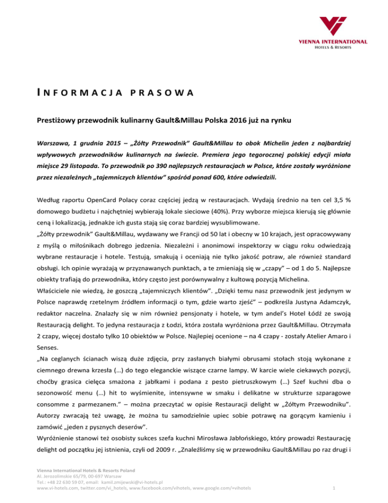 INFORMACJA PRASOWA Prestiżowy przewodnik kulinarny Gault&Millau Polska 2016 już na rynku Warszawa, 1 grudnia 2015 – „Żółty Przewodnik” Gault&Millau to obok Michelin jeden z najbardziej wpływowych przewodników kulinarnych na świecie. Premiera jego tegorocznej polskiej edycji miała miejsce 29 listopada. To przewodnik po 390 najlepszych restauracjach w Polsce, które zostały wyróżnione przez niezależnych „tajemniczych klientów” spośród ponad 600, które odwiedzili. Według raportu OpenCard Polacy coraz częściej jedzą w restauracjach. Wydają średnio na ten cel 3,5 % domowego budżetu i najchętniej wybierają lokale sieciowe (40%). Przy wyborze miejsca kierują się głównie ceną i lokalizacją, jednakże ich gusta stają się coraz bardziej wysublimowane. „Żółty przewodnik” Gault&Millau, wydawany we Francji od 50 lat i obecny w 10 krajach, jest opracowywany z myślą o miłośnikach dobrego jedzenia. Niezależni i anonimowi inspektorzy w ciągu roku odwiedzają wybrane restauracje i hotele. Testują, smakują i oceniają nie tylko jakość potraw, ale również standard obsługi. Ich opinie wyrażają w przyznawanych punktach, a te zmieniają się w „czapy” – od 1 do 5. Najlepsze obiekty trafiają do przewodnika, który często jest porównywalny z kultową pozycją Michelina. Właściciele nie wiedzą, że goszczą „tajemniczych klientów”. „Dzięki temu nasz przewodnik jest jedynym w Polsce naprawdę rzetelnym źródłem informacji o tym, gdzie warto zjeść” – podkreśla Justyna Adamczyk, redaktor naczelna. Znalazły się w nim również pensjonaty i hotele, w tym andel’s Hotel Łódź ze swoją Restauracją delight. To jedyna restauracja z Łodzi, która została wyróżniona przez Gault&Millau. Otrzymała 2 czapy, więcej dostało tylko 10 obiektów w Polsce. Najlepiej ocenione – na 4 czapy ‐ zostały Atelier Amaro i Senses. „Na ceglanych ścianach wiszą duże zdjęcia, przy zasłanych białymi obrusami stołach stoją wykonane z ciemnego drewna krzesła (…) do tego eleganckie wiszące czarne lampy. W karcie wiele ciekawych pozycji, choćby grasica cielęca smażona z jabłkami i podana z pesto pietruszkowym (…) Szef kuchni dba o sezonowość menu (…) hit to wyśmienite, intensywne w smaku i delikatne w strukturze szparagowe consomme z parmezanem.” – można przeczytać w opisie Restauracji delight w „Żółtym Przewodniku”. Autorzy zwracają też uwagę, że można tu samodzielnie upiec sobie potrawę na gorącym kamieniu i zamówić „jeden z pysznych deserów”. Wyróżnienie stanowi też osobisty sukces szefa kuchni Mirosława Jabłońskiego, który prowadzi Restaurację delight od początku jej istnienia, czyli od 2009 r. „Znaleźliśmy się w przewodniku Gault&Millau po raz drugi i Vienna International Hotels & Resorts Poland Al. Jerozolimskie 65/79, 00‐697 Warsaw Tel.: +48 22 630 59 07, email: kamil.zmijewski@vi‐hotels.pl www.vi‐hotels.com, twitter.com/vi_hotels, www.facebook.com/vihotels, www.google.com/+vihotels 1 ponownie otrzymaliśmy 2 czapy. To dowód na to, że trzymamy doskonały poziom obsługi, a przygotowywane przez nas potrawy są jednymi z najlepszych w Polsce! – podkreśla Jabłoński, który już w 2007 r. brał udział w prestiżowym szkoleniu dla szefów kuchni w Institut Paul Bocuse w Lyonie. I dodaje: „Obecność w przewodniku Gault&Millau to dla mnie wyjątkowe wyróżnienie i znakomita rekomendacja naszej restauracji.” W 2010 r. Restauracja delight została nagrodzona prestiżową statuetką Hermesa. Restauracja delight Restauracja delight to miejsce, gdzie potrawy przygotowywane są według zasad kuchni fusion. Szef Mirosław Jabłoński najbardziej lubi łączyć tradycyjną polską kuchnię z egzotycznymi składnikami z różnych stron świata, szczególnie z sosami i warzywami, które pochodzą z innych stref klimatycznych i są w Polsce trudno dostępne. Restauracja łączy doznania smakowe z estetycznymi. Jej wnętrza, podobnie jak wnętrza andel’s Hotel Łódź, zostały zaprojektowane przez wybitny londyński duet Jestico+Whiles. Każde ze 170 krzeseł to historyczny unikat, a prace na ścianach są dziełami sztuki autorstwa współczesnych polskich artystów. andel's Hotel Łódź andel’s Hotel Łódź to pierwszy 4‐gwiazdkowy design hotel w Łodzi oferujący 278 pokoi i apartamentów. Mieści się w budynku dawnej przędzalni Izraela Poznańskiego, na terenie kompleksu Manufaktura. Hotel stanowi wyjątkowe połączenie historycznego budynku z nowoczesną architekturą i niepowtarzalną stylistyką, dzięki czemu był wielokrotnie nagradzany za design i charakter. andel’s Hotel Łódź posiada największe w regionie centrum konferencyjne z 7 salami konferencyjnymi o powierzchni 1 300 m² oraz Salą Balową dla 800 osób. www.andelslodz.com Vienna International Hotelmanagement AG Założona w 1989 roku grupa hotelowa Vienna International Hotelmanagement AG prowadzi i rozwija na podstawie umów o zarządzanie łącznie 38 hoteli i kurortów pierwszej klasy. Portfolio składa się z hoteli miejskich, kurortów, hoteli uzdrowiskowych i konferencyjnych. Obiekty znajdują się w Austrii, Czechach, Polsce, Chorwacji, Francji, Niemczech, Rumunii, Słowacji i Rosji. Oprócz międzynarodowych hoteli wypoczynkowych w takich miejscowościach, jak np. Disneyland® Paris, Salzburg, Karlowe Wary, Opatija i Loipersdorf, grupa skupia się także na centrach biznesowych, takich jak Salzburg, Monachium, Berlin, Paryż, Praga, Kraków, Łódź, Bukareszt i Jekaterynburg. Obecnie grupa zatrudnia w sumie około 2,200 pracowników. Więcej informacji: www.vi‐hotels.com/ (Prasa) Kontakt: Katarzyna Strojna‐Szwaj, Al. Jerozolimskie 65/79, 00‐697 Warszawa tel.: +48 608 095 836, e‐mail: katarzyna.strojna@vi‐hotels.pl Vienna International Hotels & Resorts Poland Al. Jerozolimskie 65/79, 00‐697 Warsaw Tel.: +48 22 630 59 07, email: kamil.zmijewski@vi‐hotels.pl www