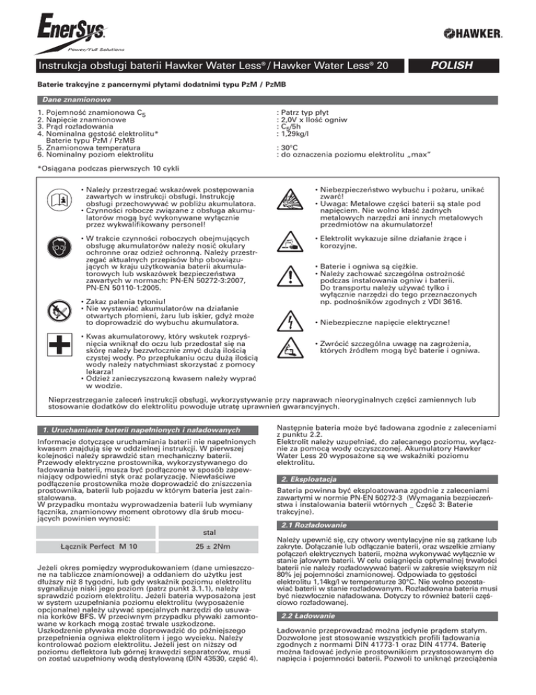 Instrukcja obsługi baterii Hawker Water Less® / Hawker Water Less® 20 POLISH Baterie trakcyjne z pancernymi płytami dodatnimi typu PzM / PzMB Dane znamionowe 1. Pojemność znamionowa C5 2. Napięcie znamionowe 3. Prąd rozładowania 4. Nominalna gęstość elektrolitu* Baterie typu PzM / PzMB 5. Znamionowa temperatura 6. Nominalny poziom elektrolitu : Patrz typ płyt : 2,0V x Ilość ogniw : C5/5h : 1,29kg/l : 30°C : do oznaczenia poziomu elektrolitu „max” *Osiągana podczas pierwszych 10 cykli • Należy przestrzegać wskazówek postępowania zawartych w instrukcji obsługi. Instrukcję obsługi przechowywać w pobliżu akumulatora. • Czynności robocze związane z obsługa akumulatorów mogą być wykonywane wyłącznie przez wykwalifikowany personel! • Niebezpieczeństwo wybuchu i pożaru, unikać zwarć! • Uwaga: Metalowe części baterii są stale pod napięciem. Nie wolno kłaść żadnych metalowych narzędzi ani innych metalowych przedmiotów na akumulatorze! • W trakcie czynności roboczych obejmujących obsługę akumulatorów należy nosić okulary ochronne oraz odzież ochronną. Należy przestrzegać aktualnych przepisów bhp obowiązujących w kraju użytkowania baterii akumulatorowych lub wskazówek bezpieczeństwa zawartych w normach: PN-EN 50272-3:2007, PN-EN 50110-1:2005. • Elektrolit wykazuje silne działanie żrące i korozyjne. • Zakaz palenia tytoniu! • Nie wystawiać akumulatorów na działanie otwartych płomieni, żaru lub iskier, gdyż może to doprowadzić do wybuchu akumulatora. • Kwas akumulatorowy, który wskutek rozpryśnięcia wniknął do oczu lub przedostał się na skórę należy bezzwłocznie zmyć dużą ilością czystej wody. Po przepłukaniu oczu dużą ilością wody należy natychmiast skorzystać z pomocy lekarza! • Odzież zanieczyszczoną kwasem należy wyprać w wodzie. • Baterie i ogniwa są ciężkie. • Należy zachować szczególna ostrożność podczas instalowania ogniw i baterii. Do transportu należy używać tylko i wyłącznie narzędzi do tego przeznaczonych np. podnośników zgodnych z VDI 3616. • Niebezpieczne napięcie elektryczne! • Zwrócić szczególna uwagę na zagrożenia, których źródłem mogą być baterie i ogniwa. Nieprzestrzeganie zaleceń instrukcji obsługi, wykorzystywanie przy naprawach nieoryginalnych części zamiennych lub stosowanie dodatków do elektrolitu powoduje utratę uprawnień gwarancyjnych. 1. Uruchamianie baterii napełnionych i naładowanych Informacje dotyczące uruchamiania baterii nie napełnionych kwasem znajdują się w oddzielnej instrukcji. W pierwszej kolejności należy sprawdzić stan mechaniczny baterii. Przewody elektryczne prostownika, wykorzystywanego do ładowania baterii, musza być podłączone w sposób zapewniający odpowiedni styk oraz polaryzację. Niewłaściwe podłączenie prostownika może doprowadzić do zniszczenia prostownika, baterii lub pojazdu w którym bateria jest zainstalowana. W przypadku montażu wyprowadzenia baterii lub wymiany łącznika, znamionowy moment obrotowy dla śrub mocujących powinien wynosić: Następnie bateria może być ładowana zgodnie z zaleceniami z punktu 2.2. Elektrolit należy uzupełniać, do zalecanego poziomu, wyłącznie za pomocą wody oczyszczonej. Akumulatory Hawker Water Less 20 wyposażone są we wskaźniki poziomu elektrolitu. 2. Eksploatacja Bateria powinna być eksploatowana zgodnie z zaleceniami zawartymi w normie PN-EN 50272-3 (Wymagania bezpieczeństwa i instalowania baterii wtórnych _ Część 3: Baterie trakcyjne). 2.1 Rozładowanie stal Łącznik Perfect M 10 25 ± 2Nm Jeżeli okres pomiędzy wyprodukowaniem (dane umieszczone na tabliczce znamionowej) a oddaniem do użytku jest dłuższy niż 8 tygodni, lub gdy wskaźnik poziomu elektrolitu sygnalizuje niski jego poziom (patrz punkt 3.1.1), należy sprawdzić poziom elektrolitu. Jeżeli bateria wyposażona jest w system uzupełniania poziomu elektrolitu (wyposażenie opcjonalne) należy używać specjalnych narzędzi do usuwania korków BFS. W przeciwnym przypadku pływaki zamontowane w korkach mogą zostać trwale uszkodzone. Uszkodzenie pływaka może doprowadzić do późniejszego przepełnienia ogniwa elektrolitem i jego wycieku. Należy kontrolować poziom elektrolitu. Jeżeli jest on niższy od poziomu deflektora lub górnej krawędzi separatorów, musi on zostać uzupełniony wodą destylowaną (DIN 43530, część 4). Należy upewnić się, czy otwory wentylacyjne nie są zatkane lub zakryte. Dołączanie lub odłączanie baterii, oraz wszelkie zmiany połączeń elektrycznych baterii, można wykonywać wyłącznie w stanie jałowym baterii. W celu osiągnięcia optymalnej trwałości baterii nie należy rozładowywać baterii w zakresie większym niż 80% jej pojemności znamionowej. Odpowiada to gęstości elektrolitu 1,14kg/l w temperaturze 30°C. Nie wolno pozostawiać baterii w stanie rozładowanym. Rozładowana bateria musi być niezwłocznie naładowana. Dotyczy to również baterii częściowo rozładowanej. 2.2 Ładowanie Ładowanie przeprowadzać można jedynie prądem stałym. Dozwolone jest stosowanie wszystkich profili ładowania zgodnych z normami DIN 41773-1 oraz DIN 41774. Baterię można ładować jedynie prostownikiem przystosowanym do napięcia i pojemności baterii. Pozwoli to uniknąć przeciążenia kabli oraz styków, niedopuszczalnego nadmiernego gazowania oraz wycieków elektrolitu z ogniw. W stanie gazowania, wartość prądu baterii musi zostać ograniczona do poziomu określonego przez normę PN-EN 50272-3. W przypadku, gdy prostownik nie był zakupiony łącznie z baterią, należy zlecić serwisowi producenta baterii określenie przydatności prostownika. Podczas ładowania należy zapewnić odpowiednią wentylację baterii. W trakcie ładowania należy otworzyć drzwi, otworzyć albo zdjąć pokrywę skrzyni baterii, lub osłony komory, w której zamontowana jest bateria. Jeżeli konstrukcja w