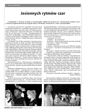 Z ˚YCIA MIASTA Jesiennych rytmów czar 5 listopada w Teatrze Letnim w Ciechocinku odby∏ si´ koncert pt. „Jesiennych rytmów czar”, w którym zaprezentowa∏ si´ Zespó∏ Taƒca i Piosenki „Âwierszcze” wraz z przyjació∏mi. Scenariusz opracowa∏ i spektakl wyre˝yserowa∏ W∏odzimierz S∏odowicz - wieloletni nauczyciel wychowania muzycznego oraz by∏y radny. Prowadzone przez niego „Âwierszcze” majà wiele talentów: nie tylko taƒczà, ale te˝ Êpiewajà i recytujà. - Przygotowania do koncertów trwajà d∏ugo - mówi W∏odzimierz S∏odowicz. - Jestem wtedy bardzo wymagajàcy wobec siebie i moich kochanych artystów. Dzi´ki nim jestem, jaki jestem i wiem, ˝e ˝yj´... Cz∏onkami niezwykle ˝ywio∏owo przyj´tej przez publicznoÊç grupy sà: Maja Gmiƒska, Max Zalewski, Mela Zalewska, Alan Dzwonkiewicz, Daria Szudzik, Rafa∏ Szudzik, Maciej Andryszewski, Nandi Lewandowska, Miko∏aj J´drzejewski, Ola Szwaba, Ola Âwieczkowska, Bianka Buze, Martyna Sobczak, Marianna Mas∏owska, Maja Krakowiecka, Marcelina Puczyƒska, Patrycja Kwiatkowska, Anna Kaniewska, Emilia Zielkiewicz, Karolina Lewandowska oraz Mi∏osz Gostyƒski. - W ostatnim czasie znacznie zmieni∏ si´ sk∏ad zespo∏u - mówi W∏odzimierz S∏odowicz. - Starsze dzieci odesz∏y, teraz swoich si∏ na scenie próbujà ich znacznie m∏odsze kole˝anki i koledzy. Podczas koncertu ze „Âwierszczami” wystàpili przyjaciele: Jerzy Sobierajski, Alicja Szudzik oraz Patrycja Lewandowska. Imprez´ poprowadzi∏a Klara Drobniewska. Widzowie oklaskiwali m.in. skocznà „Polk´” oraz „Taniec ∏obuziaków”, ws∏uchiwali si´ w wiersze Leopolda Staffa oraz Czes∏awa Mi∏osza, a tak˝e podÊpiewywali razem z wykonawcami takie przeboje, jak: „Zakazany owoc”, „Ch∏opiec z gitarà”, „Bo nie zapomnisz” i „Kasztany”. Podczas koncertu poznaliÊmy tak˝e zwyci´zców konkursu plastycznego pt. „Ciechociƒskie osiedle mieszkaniowe w oczach dzieci”, który zorganizowa∏a Komisja Kulturalno - OÊwiatowa pod przewodnictwem W∏odzimierza S∏odowicza dzia∏ajàca przy Radzie Nadzorczej Spó∏dzielni Mieszkaniowej w Ciechocinku. Na konkurs wp∏yn´∏o 78 prac. Jury w sk∏adzie: Barbara Kawczyƒska, Bogumi∏ R. Korzeniewski i Janina Strzelecka ocenia∏o prace w dwóch kategoriach: 10-12 lat oraz 8-9 lat. Oto laureaci: • kategoria 10-12 lat: - I miejsce - nie przyznano - II miejsce - Maciej Andryszewski oraz Sara Lityƒska - III miejsce - Jolanta Newelska • kategoria 8-9 lat: I miejsce - Klaudia Szczucka oraz Wiktoria Gràcka II miejsce - Karolina Lewandowska oraz Micha∏ Przybysz III miejsce - Natalia Zaranek oraz Julia Koz∏owska. Nagrod´ specjalnà dla najm∏odszej uczestniczki otrzyma∏a siedmioletnia Maja Gmiƒska. • Wyró˝nienia: Mateusz Sad∏ecki, Ania Klamecka, Dominik GawryÊ, Zuzanna AuguÊciak, Zofia Ko∏owrocka, Kacper Kawiak, Marcel Graczyk, Marysia WiÊniewska, Gabriela Kamiƒska, Barbara Szuflicka, Maksymilian Zalewski, Sandra Grochulska, Marcel Matyjanowski, Kacper Skazalski, Roksana Marcykowska, Nandi Lewandowska, Julia Maƒkowska, Miko∏aj Gracz, Modesta Zegarowska, Wiktoria Lamparska, Wiktor Ma∏kiewicz, Wiktoria Górecka, Bianka Buze, Otylia Zegarowska, Nikola Czajkowska, Igor Lewandowski oraz Bartosz Boniecki. Zwyci´zcy otrzymali przybory szkolne i zabawki. Justyna Ma∏ecka Kierownictwo zespo∏u „Âwierszcze” oraz jego cz∏onkowie serdecznie dzi´kujà Panu Leszkowi Promiƒskiemu za okazanà pomoc podczas realizacji koncertu. fot. Bogumi∏ R. Korzeniewski ZDRÓJ CIECHOCI¡SKI listopad 2011 26 fot. Bogumi∏ R. Korzeniewski