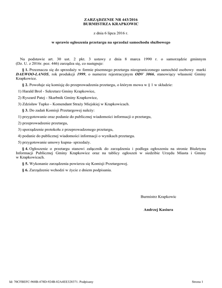 ZARZĄDZENIE NR 443/2016 BURMISTRZA KRAPKOWIC z dnia 6 lipca 2016 r. w sprawie ogłoszenia przetargu na sprzedaż samochodu służbowego Na podstawie art. 30 ust. 2 pkt. 3 ustawy z dnia 8 marca 1990 r. o samorządzie gminnym (Dz. U. z 2016r. poz. 446) zarządza się, co następuje: § 1. Przeznacza się do sprzedaży w formie pisemnego przetargu nieograniczonego samochód osobowy marki DAEWOO-LANOS, rok produkcji 1999, o numerze rejestracyjnym ODV 3066, stanowiący własność Gminy Krapkowice. § 2. Powołuje się komisję do przeprowadzenia przetargu, o którym mowa w § 1 w składzie: 1) Harald Brol - Sekretarz Gminy Krapkowice, 2) Ryszard Patej - Skarbnik Gminy Krapkowice, 3) Zdzisław Tupko - Komendant Straży Miejskiej w Krapkowicach. § 3. Do zadań Komisji Przetargowej należy: 1) przygotowanie oraz podanie do publicznej wiadomości informacji o przetargu, 2) przeprowadzenie przetargu, 3) sporządzenie protokołu z przeprowadzonego przetargu, 4) podanie do publicznej wiadomości informacji o wynikach przetargu. 5) przygotowanie umowy kupna- sprzedaży. § 4. Ogłoszenie o przetargu stanowi załącznik do zarządzenia i podlega ogłoszeniu na stronie Biuletynu Informacji Publicznej Gminy Krapkowice oraz na tablicy ogłoszeń w siedzibie Urzędu Miasta i Gminy w Krapkowicach. § 5. Wykonanie zarządzenia powierza się Komisji Przetargowej. § 6. Zarządzenie wchodzi w życie z dniem podpisania. Burmistrz Krapkowic Andrzej Kasiura Id: 70CFBEFC-968B-478D-924B-82A4EE328371. Podpisany Strona 1 Załącznik Nr 1 do Zarządzenia Nr 443/2016 Burmistrza Krapkowic z dnia 6 lipca 2016 r. BURMISTRZ KRAPKOWIC ogłasza pisemny przetarg nieograniczony na sprzedaż samochodu osobowego marki DAEWOO-LANOS Nazwa sprzedającego: Gmina Krapkowice, ul. 3 Maja 17, 47-303 Krapkowice Opis przedmiotu sprzedaży: Przedmiotem sprzedaży jest o numerze rejestracyjnym ODV 3066. samochód osobowy marki DAEWOO-LANOS, Cena wywoławcza samochodu wynosi: 272zł (słownie: dwieście siedemdziesiąt dwa złote). Dane identyfikacyjne pojazdu: Marka: DAEWOO-LANOS 1,5 S/KAT Rodzaj pojazdu: samochód osobowy Nr rejestracyjny: ODV 3066 Rok produkcji: 1999r. Rodzaj nadwozia: samonośne 5 drzwiowy Nr identyfikacyjny (VIN): SUPTF69VDXW047329 Nr silnika : A15DMS013705R Kolor powłoki lakierniczej: srebrny metalik Rodzaj silnika: z zapłonem iskrowym Pojemność skokowa /Moc silnika: 1498 cm3 Moc silnika: 73,20 KW Rodzaj paliwa: benzyna Skrzynia biegów/liczba biegów: manualna/5 Przebieg: 121 225 km (samochód jest niesprawny technicznie, posiada naklejone napisy Straż Miejska, ponadto pojazd wyposażony jest w belkę sygnalizacyjną) Data pierwszej rejestracji: 1999.07.28 Miejsce i termin przeprowadzenia przetargu: ul. 3-Maja 17, 47-303 Krapkowice pokój nr 27 Urząd Miasta i Gminy w Krapkowicach Otwarcie ofert nastąpi w siedzibie Sprzedającego w dniu 29.07.2016 r. o godz. 10.00 Warunkiem uczestnictwa w przetargu jest: Złożenie oferty (zgodnie z załącznikiem do niniejszego ogłoszenia) w terminie do dnia 28.07.2016 r., do godz. 14.00, w sekretariacie Urzędu Miasta i Gminy w Krapkowicach (pokój nr 28). Oferta powinna zostać złożona w zamkniętej kopercie, zaadresowanej na adres sprzedającego z dopiskiem „Oferta przetargowa na zakup samochodu marki DAEWOO-LANOS. Nie otwierać przed dniem 29.07.2016 r. godz. 10.00” Id: 70CFBEFC-968B-478D-924B-82A4EE328371. Podpisany Strona 1 Pozostałe informacje: 1. Samochód można oglądać w dniach od 07.07.2016 r. do 28.07.2016 r., na parkingu przy ul. Księdza Koziołka 35 w Krapkowicach w godzinach od 9.00 do 13.00 2. Nabywcą zostaje uczestnik biorących udział w przetargu. przetargu, który zaoferuje najwyższą cenę nabycia spośród 3. Złożenie jednej ważnej oferty wystarcza do przeprowadzenia przetargu. 4. Sprzedający zastrzega sobie prawo unieważnienia przetargu bez podania przyczyny lub prawo zamknięcia przetargu bez wybrania jakiejkolwiek oferty. 5. W przypadku zaoferowania takiej samej ceny przez więcej niż jednego oferenta, zostanie dodatkowo przeprowadzona licytacja ustna. 6. Oferty cenowe poniżej ceny wywoławczej nie będą rozpatrywane. 7. Nabywca jest zobowiązany przez prowadzącego przetarg. zapłacić cenę nabycia w miejscu i terminie wyznaczonym 8. Wydanie przedmiotu sprzedaży nabywcy nastąpi niezwłocznie po podpisaniu umowy sprzedaży oraz zapłaceniu ceny nabycia w formie przelewu na rachunek bankowy Gminy Krapkowice : 93 8884 0004 2001 0000 7777 0001 lub wpłaty gotówkowej w kasie Urzędu Miasta i Gminy w Krapkowicach. Osoba do kontaktów: Zdzisław Tupko – Komendant email:[email protected] Straży Id: 70CFBEFC-968B-478D-924B-82A4EE328371. Podpisany Miejskiej w Krapkowicach, tel. 77/ 44 66 843, Strona 2 Załącznik Nr 2 do Zarządzenia Nr 443/2016 Burmistrza Krapkowic z dnia 6 lipca 2016 r. Krapkowice, dnia ……………………….. …………………………………………… (imię i nazwisko) …………………………………………… (adres) …………………………………………… (PESEL/NIP) …………………………………………… (telefon kontaktowy) OFERTA Ja niżej podpisany oświadczam, że zapoznałem się z warunkami postępowania przetargowego określonymi w ogłoszeniu o przetargu na sprzedaż samochodu osobowego marki DAEWOO-LANOS stanowiącym załącznik nr 1 do Zarządzenia Nr 443 /2016 Burmistrza Krapkowic z dnia 06.07.2016 r. Akceptuję warunki udziału w postępowaniu oraz po zapoznaniu się ze stanem technicznym pojazdu składam ofertę na zakup samochodu marki DAEWOO-LANOS o numerze rejestracyjnym ODV 3066 za: kwotę brutto: ………………………..….…………………………………………………….. Słownie brutto: ……………………………………………………………………………….. ……………………………………………. (podpis oferenta) Id: 70CFBEFC-968B-478D-924B-82A4EE328371. Podpisany Strona 1