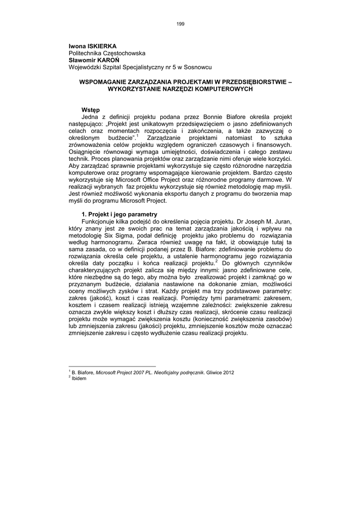 199 Iwona ISKIERKA Politechnika Częstochowska Sławomir KAROŃ Wojewódzki Szpital Specjalistyczny nr 5 w Sosnowcu WSPOMAGANIE ZARZĄDZANIA PROJEKTAMI W PRZEDSIĘBIORSTWIE – WYKORZYSTANIE NARZĘDZI KOMPUTEROWYCH Wstęp Jedna z definicji projektu podana przez Bonnie Biafore określa projekt następująco: „Projekt jest unikatowym przedsięwzięciem o jasno zdefiniowanych celach oraz momentach rozpoczęcia i zakończenia, a także zazwyczaj o 1 określonym budżecie”. Zarządzanie projektami natomiast to sztuka zrównoważenia celów projektu względem ograniczeń czasowych i finansowych. Osiągnięcie równowagi wymaga umiejętności, doświadczenia i całego zestawu technik. Proces planowania projektów oraz zarządzanie nimi oferuje wiele korzyści. Aby zarządzać sprawnie projektami wykorzystuje się często różnorodne narzędzia komputerowe oraz programy wspomagające kierowanie projektem. Bardzo często wykorzystuje się Microsoft Office Project oraz różnorodne programy darmowe. W realizacji wybranych faz projektu wykorzystuje się również metodologię map myśli. Jest również możliwość wykonania eksportu danych z programu do tworzenia map myśli do programu Microsoft Project. 1. Projekt i jego parametry Funkcjonuje kilka podejść do określenia pojęcia projektu. Dr Joseph M. Juran, który znany jest ze swoich prac na temat zarządzania jakością i wpływu na metodologię Six Sigma, podał definicję projektu jako problemu do rozwiązania według harmonogramu. Zwraca również uwagę na fakt, iż obowiązuje tutaj ta sama zasada, co w definicji podanej przez B. Biafore: zdefiniowanie problemu do rozwiązania określa cele projektu, a ustalenie harmonogramu jego rozwiązania 2 określa daty początku i końca realizacji projektu. Do głównych czynników charakteryzujących projekt zalicza się między innymi: jasno zdefiniowane cele, które niezbędne są do tego, aby można było zrealizować projekt i zamknąć go w przyznanym budżecie, działania nastawione na dokonanie zmian, możliwości oceny możliwych zysków i strat. Każdy projekt ma trzy podstawowe parametry: zakres (jakość), koszt i czas realizacji. Pomiędzy tymi parametrami: zakresem, kosztem i czasem realizacji istnieją wzajemne zależności: zwiększenie zakresu oznacza zwykle większy koszt i dłuższy czas realizacji, skrócenie czasu realizacji projektu może wymagać zwiększenia kosztu (konieczność zwiększenia zasobów) lub zmniejszenia zakresu (jakości) projektu, zmniejszenie kosztów może oznaczać zmniejszenie zakresu i często wydłużenie czasu realizacji projektu. 1 2 B. Biafore, Microsoft Project 2007 PL. Nieoficjalny podręcznik. Gliwice 2012 Ibidem 200 Rysunek nr 1: Parametry projektu Źródło: Opracowanie własne na podstawie 3 2. Zarządzanie projektami – środowisko pracy programu Microsoft Project 2010 Nie ma tylko jednej metody zarządzania projektami, ale większość istniejących metodologii zawiera następujące pięć faz: rozpoczęcie, planowanie, realizacja projektu, sprawowanie kontroli nad realizacją projektu oraz zakończenie. Pierwszą fazą w procesie zarządzania projektami jest rozpoczęcie. Rozpoczęcie nazywane jest często inicjalizacją. W tej fazie projekt jest przygotowywany do udanej realizacji. Wymaga to przemyślenia odpowiedzi na pytania związane z celowością realizacji projektu i jego zrealizowaniem w ustalonym czasie. Jest to także etap w którym identyfikuje się interesariuszy projektu i precyzuje jego cele. W tej fazie istotną sprawą również jest przemyślenie zabiegów, które będą miały na celu zgromadzenie poparcia dla projektu. Następną istotną fazą w procesie zarządzania projektami jest planowanie. Jest to szczególnie ważny etap, ponieważ na tym etapie opracowuje się szczegółową specyfikację projektu. Chodzi głównie o opracowanie celów do osiągnięcia, prac do zrealizowania, wskazanie wykonawców prac, czasu wykonania prac i całkowitego kosztu realizacji projektu. Na tym etapie ustalane są również zasady współpracy. Chodzi również o wypracowanie sposobów komunikacji pomiędzy członkami zespołu, sposobów zatwierdzania prac oraz sposobów zarządzania ryzykiem i zmianami. Najdłuższym etapem zarządzania projektem jest realizacja projektu nazywana również wykonaniem. Ważne zadanie na tym etapie realizuje menedżer projektu, sprawuje on kontrolę nad realizacją projektu. Upewnia się czy członkowie zespołu pracują we właściwym czasie nad realizacją odpowiednich elementów planu. Końcową fazą w zarządzaniu projektem jest faza zakończenia. Można o niej mówić wtedy, gdy menedżer projektu przedkłada kompletny projekt do zatwierdzenia jako zrealizowany. 3 Ibidem 201 Aby zarządzać sprawnie projektami wykorzystuje się często efektywne narzędzie wspomagające kierowanie projektem. Takim narzędziem jest Microsoft Office Project 2010. Aplikacja ta ułatwia pracę kierownika projektu na każdym etapie – od definiowania projektu i zadań, poprzez przydzielanie zasobów, aż do analizy powykonawczej. Aplikacja udostępnia użytkownikom bogaty zestaw narzędzi do zarządzania projektami. Praca z MS Project przebiega w kilku etapach: planowanie projektu, dopracowanie projektu, rozpowszechnianie informacji o stanie projektu, analiza postępu prac oraz rozpowszechnianie informacji o stanie projektu. Rysunek nr 2: Środowisko pracy programu Microsoft Project 2010 Źródło: Opracowanie własne Przy pierwszym uruchomieniu programu, domyślnym widokiem jest plansza o nazwie Wykres Gantta. Jest to jedna z wielu plansz, z której użytkownik może korzystać w trakcie układania harmonogramu, a później w czasie kontroli realizacji projektu. W trakcie pracy z programem użytkownik będzie musiał przełączać się pomiędzy różnymi widokami, ponieważ wszystkie dane zgromadzone na jednym ekranie, stałyby się nieczytelne. Najczęściej stosowane widoki można znaleźć na pasku widok