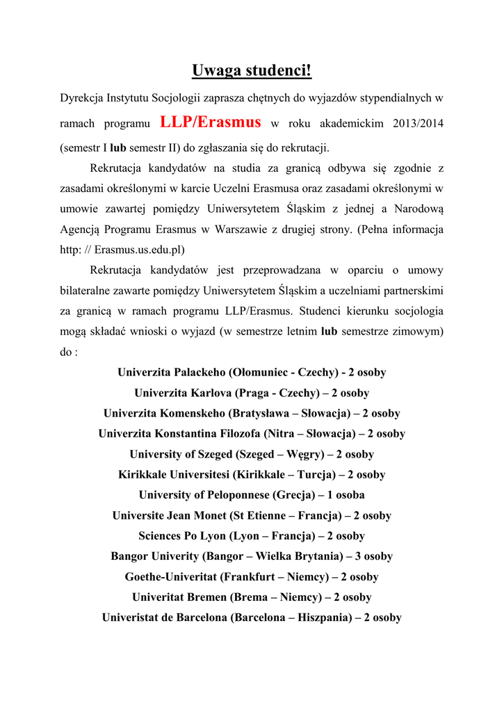 Uwaga studenci! Dyrekcja Instytutu Socjologii zaprasza chętnych do wyjazdów stypendialnych w ramach programu LLP/Erasmus w roku akademickim 2013/2014 (semestr I lub semestr II) do zgłaszania się do rekrutacji. Rekrutacja kandydatów na studia za granicą odbywa się zgodnie z zasadami określonymi w karcie Uczelni Erasmusa oraz zasadami określonymi w umowie zawartej pomiędzy Uniwersytetem Śląskim z jednej a Narodową Agencją Programu Erasmus w Warszawie z drugiej strony. (Pełna informacja http: // Erasmus.us.edu.pl) Rekrutacja kandydatów jest przeprowadzana w oparciu o umowy bilateralne zawarte pomiędzy Uniwersytetem Śląskim a uczelniami partnerskimi za granicą w ramach programu LLP/Erasmus. Studenci kierunku socjologia mogą składać wnioski o wyjazd (w semestrze letnim lub semestrze zimowym) do : Univerzita Palackeho (Ołomuniec - Czechy) - 2 osoby Univerzita Karlova (Praga - Czechy) – 2 osoby Univerzita Komenskeho (Bratysława – Słowacja) – 2 osoby Univerzita Konstantina Filozofa (Nitra – Słowacja) – 2 osoby University of Szeged (Szeged – Węgry) – 2 osoby Kirikkale Universitesi (Kirikkale – Turcja) – 2 osoby University of Peloponnese (Grecja) – 1 osoba Universite Jean Monet (St Etienne – Francja) – 2 osoby Sciences Po Lyon (Lyon – Francja) – 2 osoby Bangor Univerity (Bangor – Wielka Brytania) – 3 osoby Goethe-Univeritat (Frankfurt – Niemcy) – 2 osoby Univeritat Bremen (Brema – Niemcy) – 2 osoby Univeristat de Barcelona (Barcelona – Hiszpania) – 2 osoby Warunki przystąpienia do rekrutacji: Kandydat powinien wypełnić obowiązujący w Uniwersytecie Śląskim formularz aplikacyjny, dostępny na stronie internetowej: Erasmus.us.edu.pl i następnie przekazać go w postaci wydruku do sekretariatu Instytutu Informacja o średniej ocen. Dodatkowo kandydat może dostarczyć kserokopie i inne dokumenty uzasadniające przyznanie stypendium w ramach programu Erasmus Termin składania podań mija 18 marca br. Skład Komisji: Prof. UŚ dr hab. Urszula Swadźba - przewodnicząca Dr Katarzyna Ponikowska-Cichoń Dr Grzegorz Libor Komisja rozpatrująca podania zbierze się 19 marca br. godz. 10.30 w p. 222. Obecność kandydatów na rozmowie rekrutacyjnej jest obowiązkowa.