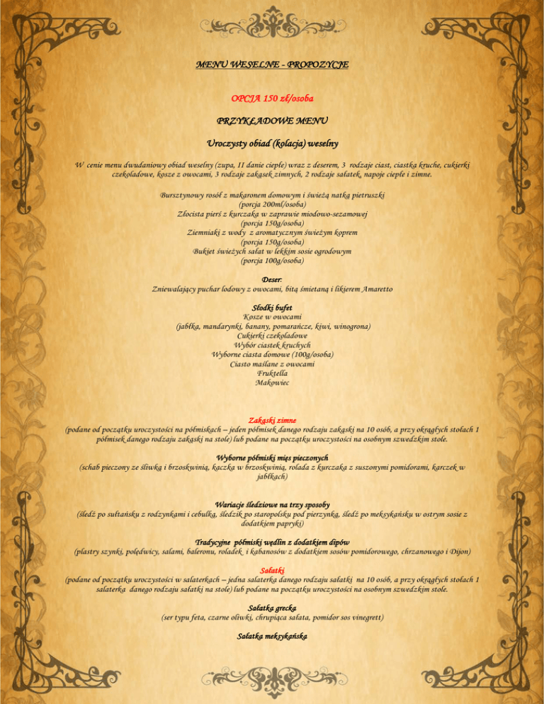 MENU WESELNE - PROPOZYCJE OPCJA 150 zł/osoba