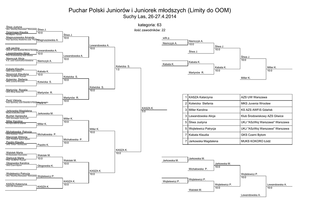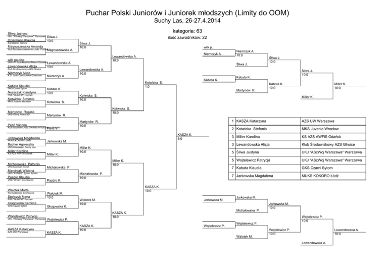 Puchar Polski Juniorów i Juniorek młodszych (Limity do OOM) Suchy Las, 26-27.4.2014 Śliwa Justyna UKJ "ASzWoj Warszawa" Warszawa Dziarmaga Klaudia KS Błękitni Tarnów kategoria: 63 Śliwa J. 10:0 Magnuszewska Amanda ilość zawodników: 22 Klub Sportowy Akademia Judo Poznań Magnuszewska wilk paulina UKS-47 Judo Bushido-Morus SzczecinLewandowska Lewandowska Alicja Klub Środowiskowy AZS Gliwice Niemczyk Alicja K.S. Judo Czechowice-Dziedzice Kabata Klaudia GKS Czarni Bytom Noszczyk Klaudyna PKS "OLIMPIA" Poznań Kotwicka Stefania MKS Juvenia Wrocław Martynów Rozalia UKS Olimp Nowa Sól A. 10:0 Niemczyk A. Kabata K. 10:0 Kotwicka S. MUKS KOKORO Łódź Bucher Agnieszka KS AZS AWFiS Gdańsk Michałowska Patrycja UKS Kodokan Toruń Marciniak Wiktoria Miller K. Pazdro Klaudia UKS "Orkan" Sochaczew Walotek Marta KS Budowlani Sosnowiec Stańczyk Marta PKS "OLIMPIA" Poznań Głogowska Karolina GKS Czarni Bytom Wojtelewicz Patrycja UKJ "ASzWoj Warszawa" Warszawa KASZA Katarzyna AZS UW Warszawa Pazdro K. Walotek M. 10:0 Głogowska K. Śliwa J. 10:0 Śliwa J. 10:0 Kabata K. Martynów R. Kabata K. 10:0 Kotwicka S. 10:0 Miller K. 10:0 Miller K. Kotwicka S. 10:0 Martynów R. 10:0 KASZA K. 5:0 Miller K. 10:0 Miller K. 10:0 Michałowska P. 10:0 1 KASZA Katarzyna AZS UW Warszawa 2 Kotwicka Stefania MKS Juvenia Wrocław 3 Miller Karolina KS AZS AWFiS Gdańsk 3 Lewandowska Alicja Klub Środowiskowy AZS Gliwice 5 Śliwa Justyna UKJ "ASzWoj Warszawa" Warszawa 5 Wojtelewicz Patrycja UKJ "ASzWoj Warszawa" Warszawa 7 Kabata Klaudia GKS Czarni Bytom 7 Jarkowska Magdalena MUKS KOKORO Łódź KASZA K. 10:0 Walotek M. 10:0 Jarkowska M. KASZA K. 10:0 Jarkowska M. Michałowska P. KASZA K. 10:0 Wojtelewicz P. KASZA K. Kabata K. Kotwicka S. 1:0 Michałowska P. UKS "FENIKS" Bytom Bytom Niemczyk A. 10:0 Lewandowska A. 10:0 Jarkowska M. UKS Gimnazjon Suchy Las Miller Karolina Niemczyk A. Śliwa J. Martynów R. Klub Sportowy Judo Gwardia w Koszalinie Koszalin Perić V. wilk p. Lewandowska A. 10:0 A. Perić Viktoria Jarkowska Magdalena Śliwa J. 10:0 Wojtelewicz P. Jarkowska M. 10:0 Wojtelewicz P. 10:0 Wojtelewicz P. Walotek M. Wojtelewicz P. 10:0 Lewandowska A. 10:0 Lewandowska A.