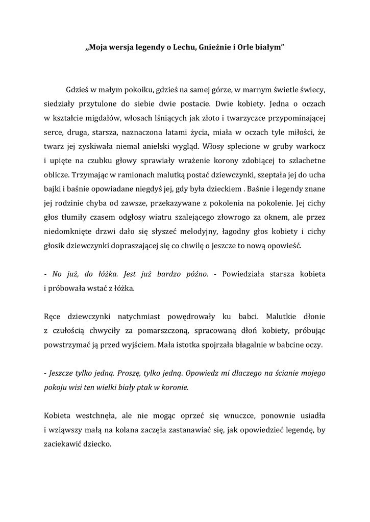 ,,Moja wersja legendy o Lechu, Gnieźnie i Orle białym” Gdzieś w małym pokoiku, gdzieś na samej górze, w marnym świetle świecy, siedziały przytulone do siebie dwie postacie. Dwie kobiety. Jedna o oczach w kształcie migdałów, włosach lśniących jak złoto i twarzyczce przypominającej serce, druga, starsza, naznaczona latami życia, miała w oczach tyle miłości, że twarz jej zyskiwała niemal anielski wygląd. Włosy splecione w gruby warkocz i upięte na czubku głowy sprawiały wrażenie korony zdobiącej to szlachetne oblicze. Trzymając w ramionach malutką postać dziewczynki, szeptała jej do ucha bajki i baśnie opowiadane niegdyś jej, gdy była dzieckiem . Baśnie i legendy znane jej rodzinie chyba od zawsze, przekazywane z pokolenia na pokolenie. Jej cichy głos tłumiły czasem odgłosy wiatru szalejącego złowrogo za oknem, ale przez niedomknięte drzwi dało się słyszeć melodyjny, łagodny głos kobiety i cichy głosik dziewczynki dopraszającej się co chwilę o jeszcze to nową opowieść. - No już, do łóżka. Jest już bardzo późno. - Powiedziała starsza kobieta i próbowała wstać z łóżka. Ręce dziewczynki natychmiast powędrowały ku babci. Malutkie dłonie z czułością chwyciły za pomarszczoną, spracowaną dłoń kobiety, próbując powstrzymać ją przed wyjściem. Mała istotka spojrzała błagalnie w babcine oczy. - Jeszcze tylko jedną. Proszę, tylko jedną. Opowiedz mi dlaczego na ścianie mojego pokoju wisi ten wielki biały ptak w koronie. Kobieta westchnęła, ale nie mogąc oprzeć się wnuczce, ponownie usiadła i wziąwszy małą na kolana zaczęła zastanawiać się, jak opowiedzieć legendę, by zaciekawić dziecko. - Ale ta będzie już naprawdę ostatnia, i to bez żadnych dyskusji później. – Pstryknęła delikatnie małą w nosek i zaczęła snuć opowieść, upominając uprzednio złotowłosą, by uważnie słuchała. - Dawno, dawno temu, gdy ziemia nie znała elektryczności, a ludzie nie pędzili tak, jakby czas uciekał im przez palce, żył pewien król, Lech. A był on władcą srogim lecz sprawiedliwym. Wzbudzał w swych poddanych jednakowoż lęk i podziw. Miał on córkę, piękną niczym lilia, niewinną niczym biały śnieg, o ustach czerwonych jak krew i oczach zielonych jak dwa szmaragdy. Była ona największym skarbem króla, wszystkim, co naprawdę kochał, gdyż straciwszy żonę, umiłował córkę najbardziej na świecie. Wszyscy w królestwie wiedzieli, że tylko dla niej jego serce topnieje, że tylko jej słowa mogły zmienić jego decyzje. Pewnego dnia, gdy księżniczka Anna - bo tak miała na imię - spacerowała po swych ziemiach, usłyszała dziwny dźwięk. Spojrzawszy w górę zobaczyła ogromne drzewo, a na nim wielkie gniazdo. Gdy spojrzała wyżej, dostrzegła orła wyrzucającego coś z gniazda. A że była to dziewczyna ciekawa wszystkiego, odczekała chwilę i widząc, że ptaszysko odfruwa, podeszła ostrożnie do drzewa i zaczęła rozglądać się dookoła. Nie znalazła jednak nic niezwykłego i już miała odchodzić, gdy dostrzegła ruch w zaroślach. Powoli, z lekkim niepokojem, ale też dziecięcą fascynacją, zbliżyła się do szeleszczących krzewów, a to, co ujrzała, ujęło ją za serce. Pośród zarośli leżało maleńkie pisklę. Ptaszek nie miał jeszcze piór, a jego żałosne popiskiwanie sprawiło, że Anna bez chwili zastanowienia wzięła go w ramiona i owinąwszy chustą zdjętą z ramion, udała się z powrotem do grodu. Idąc szybko między ludźmi, starała się ukryć maleństwo najlepiej jak umiała, wiedziała bowiem, że gdy tylko inni zobaczą co ze sobą ma, każą jej natychmiast pozbyć się ledwie żywej, żałosnej istoty. Dyskretnie przemknęła więc do swojej komnaty i położyła owinięte pisklę na wielkim łożu. Król, gdy dowiedział się o znalezisku córki, nie był zadowolony, lecz ubłagany pięknymi słowami córki pozwolił jej zatrzymać zwierzę. Pisklę dzięki opiece Anny wyrosło na pięknego orła, który swą wielkością i dostojeństwem przyćmiewał wszystkie inne ptaki. Wszędzie gdzie tylko ukazała się księżniczka, tam można było spotkać i orła. Nie odstępował dziewczyny nawet na krok, niejednokrotnie ratując ją z opresji, w które nieustannie popadała przez swą niepohamowaną żądzę przygód. Z biegiem lat, królestwo było znane już nie tylko z potężnego króla, ale także z orła, dumnego, nieustraszonego i siejącego postrach wśród złoczyńców władcę nieba. Król, doceniając piękno i majestat skrzydlatego obrońcy, postanowił, że stanie się on godłem jego królestwa. Od tamtego czasu na masztach i flagach widniał biały orzeł na czerwonym tle. Gdy kobieta skończyła mówić, zobaczyła, że jej wnuczka już śpi. Odgarnęła splątane kosmyki z twarzy dziewczynki, ułożyła ją wygodnie na miękkiej poduszce i otuliła pluszowym kocem. - Śpij słodko Aniu. - Szepnęła i pocałowała blade czółko. Wychodząc z pokoju uniosła wzrok i spojrzała na jasną ścianę, na której wisiał herb. Biały orzeł w złotej koronie na czerwonym tle. Alicja Rębisz, kl. 3TH RCEZ w Lubartowie