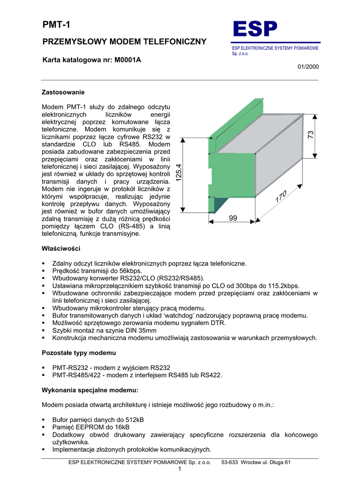 ESP PMT-1 PRZEMYSŁOWY MODEM TELEFONICZNY ESP ELEKTRONICZNE SYSTEMY POMIAROWE Sp. z o.o. Karta katalogowa nr: M0001A 01/2000 Zastosowanie Modem PMT-1 służy do zdalnego odczytu elektronicznych liczników energii elektrycznej poprzez komutowane łącza telefoniczne. Modem komunikuje się z licznikami poprzez łącze cyfrowe RS232 w standardzie CLO lub RS485. Modem posiada zabudowane zabezpieczenia przed przepięciami oraz zakłóceniami w linii telefonicznej i sieci zasilającej. Wyposażony jest również w układy do sprzętowej kontroli transmisji danych i pracy urządzenia. Modem nie ingeruje w protokół liczników z którymi współpracuje, realizując jedynie kontrolę przepływu danych. Wyposażony jest również w bufor danych umożliwiający zdalną transmisję z dużą różnicą prędkości pomiędzy łączem CLO (RS-485) a linią telefoniczną. funkcje transmisyjne. Właściwości Zdalny odczyt liczników elektronicznych poprzez łącza telefoniczne. Prędkość transmisji do 56kbps. Wbudowany konwerter RS232/CLO (RS232/RS485). Ustawiana mikroprzełącznikiem szybkość transmisji po CLO od 300bps do 115.2kbps. Wbudowane ochronniki zabezpieczające modem przed przepięciami oraz zakłóceniami w linii telefonicznej i sieci zasilającej. Wbudowany mikrokontroler sterujący pracą modemu. Bufor transmitowanych danych i układ ‘watchdog’ nadzorujący poprawną pracę modemu. Możliwość sprzętowego zerowania modemu sygnałem DTR. Szybki montaż na szynie DIN 35mm Konstrukcja mechaniczna modemu umożliwiają zastosowania w warunkach przemysłowych. Pozostałe typy modemu PMT-RS232 - modem z wyjściem RS232 PMT-RS485/422 - modem z interfejsem RS485 lub RS422. Wykonania specjalne modemu: Modem posiada otwartą architekturę i istnieje możliwość jego rozbudowy o m.in.: Bufor pamięci danych do 512kB Pamięć EEPROM do 16kB Dodatkowy obwód drukowany zawierający specyficzne rozszerzenia dla końcowego użytkownika. Implementacje złożonych protokołów komunikacyjnych. ESP ELEKTRONICZNE SYSTEMY POMIAROWE Sp. z o.o. 1 53-633 Wrocław ul. Długa 61 M0001A Widok listwy zaciskowej Pętla prądowa CLO Diody sygnalizujące stan modemu Mikroprzełącznik CLO+ CLO- Listwa zaciskowa górna Listwa zaciskowa dolna Linia telefoniczna Zasilanie Uziemienie ochronne Zerowanie urządzenia Dodatkowe diody sygnalizacyjne Opis listwy zaciskowej Zasilanie: Linia telefoniczna: L Zasilanie 220V AC, przewód fazowy. | Zasilanie przewód ochronny PE. N Zasilanie przewód ochronny. Z13 Linia telefoniczna wtyk typ RJ4. LA Linia telefoniczna. | Uziemienie ochronne. Reset: Reset modemu. Mikroprzełącznik: SW2 Ustawianie parametrów transmisji. CLO: A1 CLO + B1 CLO - Opis sygnalizacji Diody LED: L1 RXD, Dioda zaświeca się po prawidłowym zainicjowaniu modemu gdy urządzenie przechodzi do stanu oczekiwania na sygnał dzwonka. (może to trwać 2 – 3 sekundy od włączenia zasilania lub sygnału RESET). Dioda zaświeca się po prawidłowym połączeniu modemów (odpowiedź CONNECT z modemu po trzech dzwonkach) sygnalizuje wejście w tryb transmisji danych. Dioda zaświeca się w chwili wysyłania danych do obwodu pętli prądowej. Dioda ta zaświeca się na stałe w przypadku rozwarcia obwodu pętli prądowej. Dioda zaświeca się w chwili odbierania danych z obwodu pętli prądowej. DTR RTS DSR CTS CD Sterowanie przepływem danych, sygnał wystawiany przez urządzenie dla modemu. Sterowanie przepływem danych, sygnał wystawiany przez modem dla urządzenia. Dioda zaświeca się gdy jest obecny sygnał nośnej pomiędzy modemami. RI Dioda zaświeca się w momencie sygnału dzwonka. L2 TXD ESP ELEKTRONICZNE SYSTEMY POMIAROWE Sp. z o.o. 2 53-633 Wrocław ul.Długa 61 M0001A Sygnalizacja trybów pracy modemu 1. Diody L1 i L2 nie świecą - włączenie zasilania lub RESET urządzenia, trwa inicjowanie i testowanie modemu. 2. Dioda L1 zaświeca się - przejście do oczekiwania na dzwonek. Zainicjowanie i test modemu wypadły pomyślnie, urządzenie czeka na trzy dzwonki a następnie inicjuje połączenie. 3. Dioda L2 zaświeca się - połączenie z drugim modemem zostało nawiązane poprawnie. Urządzenie pracuje w trybie transmisji danych. Praca w tym trybie trwa tak długo jak długo obecny jest sygnał nośnej (dioda CD). Po jego zaniknięciu urządzenie rozpoczyna RESET modemu i przechodzi do trybu pracy 1. Tabela ustawień szybkości interfejsu na mikroprzełączniku SW2: On Off 12 3 4 On Off 1 2 3 4 On Off 12 3 4 On Off 1234 On Off 1234 On Off 1234 On Off 1234 On Off 1234 On Off 1234 On Off 1234 On Off 1234 On Off 1234 On Off 12 34 On Off 12 3 4 50 bps 150 bps 300 bps 600 bps 1200 bps 2400 bps 4800 bps 9600 bps 14400 bps 19200 bps 28800 bps 38400 bps 57600 bps 115200 bps ESP ELEKTRONICZNE SYSTEMY POMIAROWE Sp. z o.o. 3 53-633 Wrocław ul.Długa 61 M0001A Układy połączeń Elektroniczne Liczniki Energii Elektrycznej CLO+ CLO- CLO+ CLO- CLO+ CLO- CLO+ CLO- CLO CLO+ CLO- Przemysłowy Modem Telefoniczny PMT-1 L PE N LA PE LA zasilanie linia telefoniczna Parametry techniczne: Typ: Zasilanie: Moc pobierana: Linia telefoniczna: Ochronna: Prędkość transmisji modemowej: Tryby pracy modemu: Sprzętowa korekcja błędów: Sprzętowa kompresja danych: Sprzętowa kontrola modemu: Konfiguracja modemu: Obsługiwane komendy: Interfejs do liczników elektronicznych: Prędkość transmisji po CLO: Ilość obsługiwanych liczników: Warunki pracy: Obudowa: Wymiary: Montaż: PMT-1 220/115/100V AC , 50Hz maks. 6 VA komutowana jednoparowa klasa I / 1,5kV maks. do 56000 bps K56Flex, V34, V34+, V.32bis, V.32 i starsze. Automatyczne wykrywanie trybu pracy włączając tryb 33600 bps. V.42 i MNP2-4 V.42bis(4-1) i MNP5(2-1) Układ ‘watchdog’ nadzorujący poprawną pracę modemu oraz możliwość sprzętowego zerowania modemu sygnałem DTR. Możliwość zapisania konfiguracji modemu w pamięci NVRAM Zestaw komend Hayes AT. CLO od 50 do 115 kbps do 4 liczników temp. 0 ..+40°C wilgotność względna <80%/25°C typ U