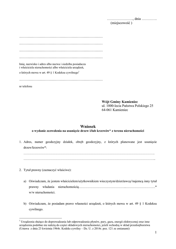 …………………., dnia …………. (miejscowość ) ................................................................................................................ ................................................................................................................ ................................................................................................................ ................................................................................................................ Imię, nazwisko i adres albo nazwa i siedziba posiadacza i właściciela nieruchomości albo właściciela urządzeń, o których mowa w art. 49 § 1 Kodeksu cywilnego1 ................................................................................................................ nr telefonu Wójt Gminy Kamieniec ul. 1000-lecia Państwa Polskiego 25 64-061 Kamieniec Wniosek o wydanie zezwolenia na usunięcie drzew i/lub krzewów* z terenu nieruchomości 1. Adres, numer geodezyjny działek, obręb geodezyjny, z których planowane jest usunięcie drzew/krzewów*: …………………………………………………………………………………………………………. ………………………………………………………………………………………………………….. 2. Tytuł prawny (zaznaczyć właściwe): a) Oświadczam, że jestem właścicielem/użytkownikiem wieczystym/dzierżawcą//najemcą inny tytuł prawny władania nieruchomością……………………………………..………………………* w/w nieruchomości. b) Oświadczam, że posiadam prawo własności urządzeń, o których mowa w art. 49 § 1 Kodeksu cywilnego. 1 Urządzenia służące do doprowadzania lub odprowadzania płynów, pary, gazu, energii elektrycznej oraz inne urządzenia podobne nie należą do części składowych nieruchomości, jeżeli wchodzą w skład przedsiębiorstwa (Ustawa z dnia 23 kwietnia 1964r. Kodeks cywilny – Dz. U. z 2014r. poz. 121 ze zmianami) 1 3. Gatunek drzewa , liczba drzew i obwód pnia mierzony na wysokości 130 cm: ………………………………………………………………………………………………………… ………………………………………………………………………………………………………… ………………………………………………………………………………………………………… ………………………………………………………………………………………………………… ………………………………………………………………………………………………………… a w przypadku gdy na tej wysokości drzewo: a) posiada kilka pni – obwód każdego z nich: ……………………………………………………………………………………………………… ……………………………………………………………………………………………………… b) nie posiada pnia – obwód pnia bezpośrednio poniżej korony drzewa: ……………………………………………………………………………………………………… ……………………………………………………………………………………………………… 4. Gatunek krzewu i wielkość powierzchni, z której zostanie usunięty: ………………………………………………………………………………………………………… ………………………………………………………………………………………………………… 5. Miejsce zamierzonego usunięcia drzewa lub krzewu (np. ogród przydomowy, teren gospodarstwa, rola, łąka itp.): ………………………………………………………………………………………………………… ………………………………………………………………………………………………………… 6. Przyczyna zamierzonego usunięcia drzewa i/lub* krzewu (np. drzewo/krzew jest suchy/stanowi zagrożenie dla ludzi i mienia/ koliduje z planowaną inwestycją itp. Jeżeli przyczyną usunięcia drzewa lub krzewu jest realizacja inwestycji wymagającej uzyskania pozwolenia na rozbiórkę lub pozwolenia na budowę, zezwolenie na usunięcie drzewa lub krzewu może zostać wykonane pod warunkiem uzyskania pozwolenia na rozbiórkę lub pozwolenia na budowę, które kolidują z drzewami lub krzewami, będącymi przedmiotem zezwolenia. Przepisu nie stosuje się do inwestycji liniowych celu publicznego.): ……………………………………………………………………………………………………....... ………………………………………………………………………………………………………… ……………………………………………………………………………………………………....... ………………………………………………………………………………………………………… ……………………………………………………………………………………………………....... ………………………………………………………………………………………………………… 7. Termin zamierzonego usunięcia drzewa i/lub* krzewu (np. niezwłocznie, do końca roku 2015, w pierwszym półroczu 2016 r. itp.): …………………………………………………………………………………………………………. 2 8. Usunięcie drzewa i/lub* krzewu wynika/nie wynika* z celu związanego z prowadzeniem działalności gospodarczej. 9. Zgoda właściciela nieruchomości, jeżeli jest wymagana (gdy wnioskodawca nie jest właścicielem nieruchomości) lub oświadczenie o udostępnieniu informacji, o której mowa w art. 83 ust. 4 (zaznaczyć właściwe): a) Wyrażam zgodę na wycinkę drzewa/dr