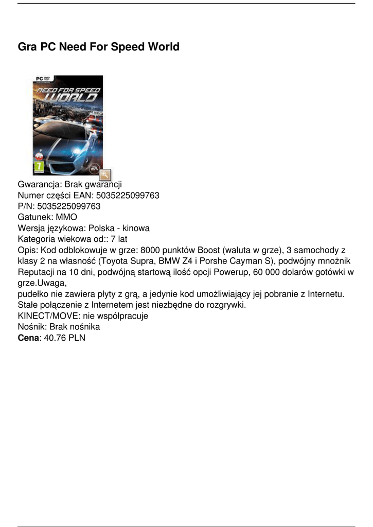 Gra PC Need For Speed World Gwarancja: Brak gwarancji Numer części EAN: 5035225099763 P/N: 5035225099763 Gatunek: MMO Wersja językowa: Polska - kinowa Kategoria wiekowa od:: 7 lat Opis: Kod odblokowuje w grze: 8000 punktów Boost (waluta w grze), 3 samochody z klasy 2 na własność (Toyota Supra, BMW Z4 i Porshe Cayman S), podwójny mnożnik Reputacji na 10 dni, podwójną startową ilość opcji Powerup, 60 000 dolarów gotówki w grze.Uwaga, pudełko nie zawiera płyty z grą, a jedynie kod umożliwiający jej pobranie z Internetu. Stałe połączenie z Internetem jest niezbędne do rozgrywki. KINECT/MOVE: nie współpracuje Nośnik: Brak nośnika Cena: 40.76 PLN Powered by TCPDF (www.tcpdf.org)