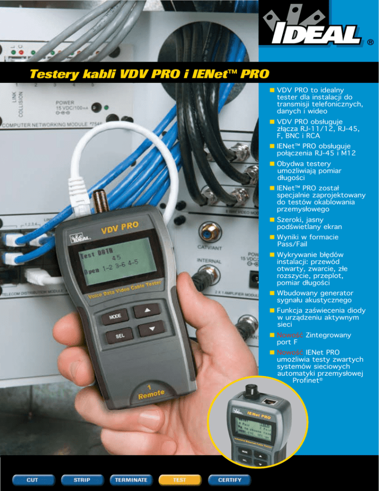 Testery kabli VDV PRO i IENet™ PRO n VDV PRO to idealny tester dla instalacji do transmisji telefonicznych, danych i wideo n VDV PRO obsługuje złącza RJ-11/12, RJ-45, F, BNC i RCA n IENet™ PRO obsługuje połączenia RJ-45 i M12 n Obydwa testery umożliwiają pomiar długości n IENet™ PRO został specjalnie zaprojektowany do testów okablowania przemysłowego n Szeroki, jasny podświetlany ekran n Wyniki w formacie Pass/Fail n Wykrywanie błędów instalacji: przewód otwarty, zwarcie, złe rozszycie, przeplot, pomiar długości n Wbudowany generator sygnału akustycznego n Funkcja zaświecenia diody w urządzeniu aktywnym sieci n Nowość Zintegrowany port F n Nowość IENet PRO umożliwia testy zwartych systemów sieciowych automatyki przemysłowej Profinet® Tester kabli VDV PRO Zaprojektowany do kompleksowej obsługi instalacji do transmisji telefonicznych, danych i wideo Tester VDV PRO jest prostym w obsłudze urządzeniem do testowania i weryfikacji kabli, umożliwiającym szybkie sprawdzenie połączeń w domowych sieciach lokalnych jak i rozległych sieciach komercyjnych. n Voice - wsparcie dla testowania kabli telefonicznych sześciożyłowych na złączu RJ11/12, trójżyłowych w sekwencji USOC n Data - testowanie kabli czteroparowych nieekranowanych i ekranowanych w sekwencji T568 A/B (RJ45) n Video - pomiar długości, zwarcia i przewodu otwartego dla kabli koncentrycznych na złączu „F” Tester VDV PRO n Lepsza prezentacja wyników dzięki podświetlanemu ekranowi LCD n Dla sekwencji połączeń T568A/B wyświetlany komunikat PASS i sygnał dźwiękowy (możliwy do wyboru) n Stopniowane podświetlenie ekranu n Dostępna mapa połączeń dla sieci 10Base-T i Token Ring z podłączoną jednostką zdalną n Funkcja zaświecenia diody w urządzeniu aktywnym podłączonym do mierzonego kabla n Testy linii telefonicznych 1, 2 lub 3 parowych RJ-11 n Pomiar długości wyrażony w metrach lub stopach dla kabli koncentrycznych i skrętkowych UTP, STP n Testy sieci telefonicznych ze wskazaniem prawidłowo lub odwrotnie podłączonych pinów od 1 do 6 n Mapowanie sieci opartej o kabel koncentryczny przy użyciu kolorowych jednostek zdalnych n Wynik pomiaru długości dostępny na początku każdego testu n Wbudowany generator sygnału akustycznego wysyła 4 różne tony po przewodzie, parze lub pojedynczej żyle n Większa wydajność testów przy użyciu ośmiu jednostek zdalnych RJ45, RJ-11 i F n Długi czas życia akumulatora dzięki niskiemu zapotrzebowaniu na energię oraz funkcji automatycznego wyłączania testera n Testy z podłączoną jednostką zdalną: ciągłość ekranu, zwarcie, przewód otwarty, złe rozszycie, pary odwrócone, przeplot n Wygodny odczyt danych za sprawą graficznego wyświetlacza LCD n Testy bez jednostki zdalnej: zwarcie, przewód otwarty, przeplot Zintegrowane gniazda RJ11/12(telefoniczne), RJ45(UTP/STP) i F (koncentryczne) n Wbudowany wskaźnik stanu baterii n Identyfikacja napięcia w kablu n Na wyposażeniu łatwo dostępna bateria 9V n Identyfikacja obecności napięcia w kablu Opis Nr kat. VDV PRO i jedna jednostka zdalna RJ45 i F 33-770 VDV PRO i osiem jednostek zdalnych RJ45 i F 33-771 Zestaw ośmiu jednostek zdalnych RJ45 33-774 Zestaw ośmiu jednostek zdalnych F 33-775 VDV PRO i jedna jednostka zdalna RJ45 i F oraz sonda indukcyjna 33-780 Duży podświetlany ekran LCD wyświetla aktualny tryb pracy, wyniki testów i wszystkie błędy dla różnych typów kabli Kompaktowa, ergonomiczna konstrukcja Ekran automatycznie informuje o wysokim napięciu na linii, wskazuje wynik PASS lub błędnie podłączone żyły po każdym teście Numer identyfikacyjny ID jednostki zdalnej oznaczony jest jako “IDX”, kabel UTP jako “No Shield” a kabel STP jako “Shield” Pojedynczy klawisz do czterech różnych działań Zawsze dostępna i gotowa do użycia jednostka zdalna ID#1 chowana jest w obudowie. Tester kabli IENet™ PRO IENet™ PRO - rozwiazanie do testowania okablowania przemysłowego Industrial Ethernet Tester wyposażony jest w unikalne funkcje pozwalające na łatwe testy okablowania przemysłowego dwu- i czteroparowego. IENet PRO jest kompatybilny ze znakomitą większością systemów automatyki przemysłowej za sprawą pomiaru kabli dwuparowych na złączach M12 i RJ-45. Wyniki testów wyświetlane są w formacie Profinet® Industrial Ethernet. Natychmiastowa weryfikacja integralnosci okablowania Tester IENet™ PRO bardzo szybko dokonuje kontroli integralności okablowania i prawidłowo zarobionych złączy rozmaitych typów okablowania przemysłowego. n n n n n Pojedynczy klawisz uruchamia testy kabla telefonicznego Voice, ethernetowego Data lub koncentrycznego Video/Security (Testy Voice i Video/Security dostępne są Opis Nr kat. za pomocą opcjonalnego adaptera) n n n Wbudowany generator sygnału akustycznego pozwala na łatwą lokalizację błędów Wykonywane testy: przewód otwarty, zwarcie, przeplot, pary odwrócone, złe rozszycie (definiowane przez użytkownika), pomiar długości IENet™ PRO i jedna jednostka zdalna 33-772 IENet™ Pro 33-773 Wskazanie sekwencji połączeń T568A/B dla kabli ekranowanych i nieekranowanych Zestaw ośmiu jednostek zdalnych F 33-775 IENet PRO i osiem jednostek zdalnych RJ45 i F 33-776 Łatwy w użyciu ekran LCD wskazuje wynik PASS lub błędnie podłączone żyły po każdym teście Identyfikacja napięcia w kablu Chowana w obudowie jednostka zdalna ułatwia przenoszenie testera Adapter RJ45 na RJ11 LA-4233 Adapter RJ45 na F LA-4234 Adapter F na BNC LA-4173 Opcjonalne wyposażenie w dodatkowe jednostki zdalne pozwala na komfortowe samodzielne testy n Funkcja zaświecenia diody w urządzeniu aktywnym podłączonym do mierzonego kabla n Identyfikator numeryczny dla kabli UTP i STP spełnia wymagania sieci przemysłowych PROFINET® PROFINET® jest zarejestrowanym znakiem towarowym PROFIBUS International. Zintegrowane gniazda RJ45(UTP/STP) i M12 Duży podświetlany ekran LCD wyświetl