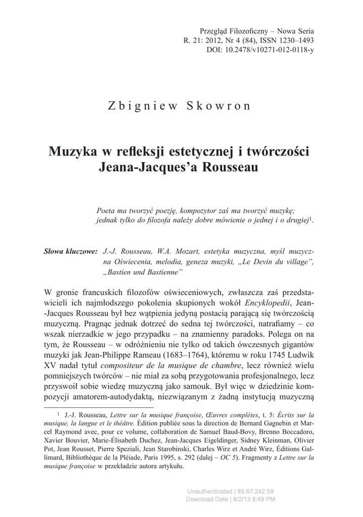 Przegląd Filozoficzny – Nowa Seria R. 21: 2012, Nr 4 (84), ISSN 1230–1493 DOI: 10.2478/v10271-012-0118-y Zbigniew Skowron Muzyka w refleksji estetycznej i twórczości Jeana-Jacques’a Rousseau Poeta ma tworzyć poezję, kompozytor zaś ma tworzyć muzykę; jednak tylko do filozofa należy dobre mówienie o jednej i o drugiej1. Słowa kluczowe: J.-J. Rousseau, W.A. Mozart, estetyka muzyczna, myśl muzyczna Oświecenia, melodia, geneza muzyki, „Le Devin du village”, „Bastien und Bastienne” W gronie francuskich filozofów oświeceniowych, zwłaszcza zaś przedstawicieli ich najmłodszego pokolenia skupionych wokół Encyklopedii, Jean-Jacques Rousseau był bez wątpienia jedyną postacią parającą się twórczością muzyczną. Pragnąc jednak dotrzeć do sedna tej twórczości, natrafiamy – co wszak nierzadkie w jego przypadku – na znamienny paradoks. Polega on na tym, że Rousseau – w odróżnieniu nie tylko od takich ówczesnych gigantów muzyki jak Jean-Philippe Rameau (1683–1764), któremu w roku 1745 Ludwik XV nadał tytuł compositeur de la musique de chambre, lecz również wielu pomniejszych twórców – nie miał za sobą przygotowania profesjonalnego, lecz przyswoił sobie wiedzę muzyczną jako samouk. Był więc w dziedzinie kompozycji amatorem-autodydaktą, niezwiązanym z żadną instytucją muzyczną J.-J. Rousseau, Lettre sur la musique françoise, Œuvres complètes, t. 5: Écrits sur la musique, la langue et le théâtre. Édition publiée sous la direction de Bernard Gagnebin et Marcel Raymond avec, pour ce volume, collaboration de Samuel Baud-Bovy, Brenno Boccadoro, Xavier Bouvier, Marie-Élisabeth Duchez, Jean-Jacques Eigeldinger, Sidney Kleinman, Olivier Pot, Jean Rousset, Pierre Speziali, Jean Starobinski, Charles Wirz et André Wirz, Éditions Gallimard, Bibliothèque de la Pléiade, Paris 1995, s. 292 (dalej – OC 5). Fragmenty z Lettre sur la musique françoise w przekładzie autora artykułu. 1 Unauthenticated | 89.67.242.59 Download Date | 6/2/13 8:49 PM 66 Zbigniew Skowron lub jakąś formą muzycznego – książęcego czy królewskiego – mecenatu. Miał wszakże tę przewagę nad swymi rywalami, że zdobył doświadczenie muzyczne jako słuchacz u źródeł włoskiej muzyki operowej – w Wenecji, gdzie przebywał w charakterze sekretarza tamtejszej ambasady francuskiej, hrabiego de Montaigu, od września 1743 do sierpnia 1744 roku, czemu dał wyraz w znamiennym fragmencie swych Wyznań: Przywiozłem z Paryża panujące w owym kraju uprzedzenie do muzyki włoskiej; ale zarazem otrzymałem od natury wrażliwość, wobec której przesądy nie zdołają się ostać. Powziąłem niebawem do tej muzyki namiętność, jaką budzi ona w ludziach zdolnych ją ocenić. Słuchając barkaroli zrozumiałem, że dotąd nie słyszałem śpiewu, a niebawem tak się zapaliłem do opery, iż, zniecierpliwiony zwyczajem paplania, jedzenia i grania w lożach, gdy ja chciałbym tylko słuchać, wymykałem się często towarzystwu szukając miejsca w innej stronie teatru. Tam, sam jeden, zamknięty w loży, poddawałem się mimo długości widowiska rozkoszy sycenia się nim swobodnie i aż do końca2. Komponowanie – całkiem inaczej niż w przypadku Rameau, nadwornego muzyka króla – nie stanowiło żadną miarą źródła dochodów Rousseau. Owszem, utrzymywał się on z działalności muzycznej, ale było nią tylko... kopiowanie nut, mające wszakże – dzięki jego kaligraficznym talentom – wymiar prawdziwie artystyczny. Niemniej, autor Nowej Heloizy próbował swoich sił na polu kompozycji, czego rezultatem stały się m.in. dwa utwory sceniczne – Les muses galantes (1745) i niewielkich rozmiarów intermedium Le devin du village (1752), które – dzięki sprzyjającym okolicznościom – zdołał zaprezentować przed dworem królewskim 18 października 1752 roku w Fontainebleau, a następnie 1 marca 1753 roku w Operze paryskiej, zyskując uznanie swych słuchaczy. Historyczne znaczenie tego drugiego intermedium nie wiąże się z jego szczególną wartością muzyczną, jako że utwór ten był w gruncie rzeczy – z punktu widzenia zastosowanych w nim środków warsztatowych – drobiazgiem w porównaniu z okazałymi i jakże licznymi operami Rameau. Nośność Le devin du village (Wróżek wiejski) polegała przede wszystkim na jego estetycznych założeniach, dokładniej – na zastosowaniu w nim wokalnych środków ekspresji wzorowanych na operach włoskich. Innymi słowy, Rousseau przekroczył w tym utworze granice, w jakich tkwiła ówczesna opera francuska, obwarowana zasadami (konwencjami) dotyczącymi w jednakowej mierze libretta, traktowania tekstu, wreszcie – formy i ekspresji śpiewu. Zarówno pastoralny temat intermedium (historia o dwojgu kochankach i pośredniczącym między nimi wróżbicie wiejskim), podejście do tekstu nieskrępowane regułami wersy2 J.-J. Rousseau, Wyznania, przełożył i wstępem opatrzył Tadeusz Żeleński (Boy), Państwowy Instytut Wydawniczy, Warszawa 1978, t. 2, s. 45–46. Unauthenticated | 89.67.242.59 Download Date | 6/2/13 8:49 PM Muzyka w refleksji estetycznej i twórczości Jeana-Jacques’a Rousseau 67 fikacji, a także melodyka oparta na śpiewnych wzorcach włoskich – wszystko to okazało się dla jego ówczesnych odbiorców czymś, co nie miało na gruncie francuskim precedensu. Ówczesny rezonans Le devin du village nie okazałby się może tak silny, gdyby nie okoliczności związane z jego paryskim wystawieniem w 1752 roku. W tym samym bowiem czasie, kiedy intermezzo Rousseau pojawiło się na scenie paryskiej, występowała na niej (od sierpnia 1752 roku do marca 1754 roku) włoska trupa operowa prezentująca utwory z gatunku opera buffa, m.in. słynne intermezzo La serva padrona Giovanniego Battisty Pergolesiego3. Już pierwsze wykonanie La serva padrona, którym to utworem zainicjowali buffoniści swe występy w paryskiej Operze, wywołało żywe reakcje publiczności i k