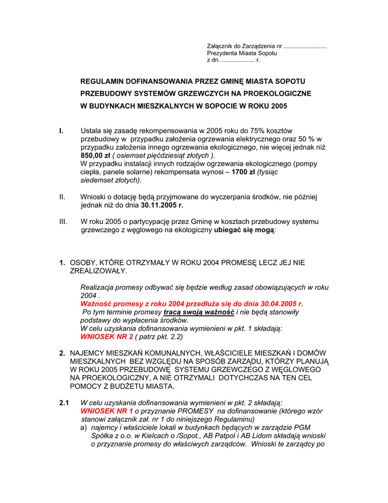 Załącznik do Zarządzenia nr .......................... Prezydenta Miasta Sopotu z dn. .................... r. REGULAMIN DOFINANSOWANIA PRZEZ GMINĘ MIASTA SOPOTU PRZEBUDOWY SYSTEMÓW GRZEWCZYCH NA PROEKOLOGICZNE W BUDYNKACH MIESZKALNYCH W SOPOCIE W ROKU 2005 I. II. III. Ustala się zasadę rekompensowania w 2005 roku do 75% kosztów przebudowy w przypadku załoŜenia ogrzewania elektrycznego oraz 50 % w przypadku załoŜenia innego ogrzewania ekologicznego, nie więcej jednak niŜ 850,00 zł ( osiemset pięćdziesiąt złotych ). W przypadku instalacji innych rodzajów ogrzewania ekologicznego (pompy ciepła, panele solarne) rekompensata wynosi – 1700 zł (tysiąc siedemset złotych). Wnioski o dotację będą przyjmowane do wyczerpania środków, nie później jednak niŜ do dnia 30.11.2005 r. W roku 2005 o partycypację przez Gminę w kosztach przebudowy systemu grzewczego z węglowego na ekologiczny ubiegać się mogą: 1. OSOBY, KTÓRE OTRZYMAŁY W ROKU 2004 PROMESĘ LECZ JEJ NIE ZREALIZOWAŁY. Realizacja promesy odbywać się będzie według zasad obowiązujących w roku 2004 . WaŜność promesy z roku 2004 przedłuŜa się do dnia 30.04.2005 r. Po tym terminie promesy tracą swoją waŜność i nie będą stanowiły podstawy do wypłacenia środków. W celu uzyskania dofinansowania wymienieni w pkt. 1 składają: WNIOSEK NR 2 ( patrz pkt. 2.2) 2. NAJEMCY MIESZKAŃ KOMUNALNYCH, WŁAŚCICIELE MIESZKAŃ I DOMÓW MIESZKALNYCH BEZ WZGLĘDU NA SPOSÓB ZARZĄDU, KTÓRZY PLANUJĄ W ROKU 2005 PRZEBUDOWĘ SYSTEMU GRZEWCZEGO Z WĘGLOWEGO NA PROEKOLOGICZNY, A NIE OTRZYMALI DOTYCHCZAS NA TEN CEL POMOCY Z BUDśETU MIASTA. 2.1 W celu uzyskania dofinansowania wymienieni w pkt. 2 składają: WNIOSEK NR 1 o przyznanie PROMESY na dofinansowanie (którego wzór stanowi załącznik zał. nr 1 do niniejszego Regulaminu) a) najemcy i właściciele lokali w budynkach będących w zarządzie PGM Spółka z o.o. w Kielcach o /Sopot., AB Patpol i AB Lidom składają wnioski o przyznanie promesy do właściwych zarządców. Wnioski te zarządcy po zaopiniowaniu przesyłają do Wydziału InŜynierii i Ochrony Środowiska Urzędu Miasta Sopotu. b) pozostali składają wnioski po uzyskaniu opinii właściciela, zarządcy lub wspólnot mieszkaniowych bezpośrednio do Wydziału InŜynierii i Ochrony Środowiska Urzędu Miasta Sopotu c) do wniosku naleŜy dołączyć pozwolenie na budowę lub ogólne i techniczne warunki dostawy gazu, energii elektrycznej lub ciepła. d) wnioski nr 1 muszą być składane przed przebudową ogrzewania, tak aby osoby dokonujące wizji lokalnej mogły stwierdzić istnienie wyłącznie ogrzewania węglowego lub koksowego, co potwierdzą pisemnie na wniosku. PROMESY TRACĄ SWĄ WAśNOŚĆ Z DNIEM 15.12.2005 r. 2.2 Po dokonaniu przebudowy osoby, które uzyskały promesę składają: WNIOSEK NR 2 ( zał. nr 2 do niniejszego Regulaminu) postępując w ten sam sposób jak przy składaniu wniosku nr 1. Do wniosku nr 2 powinny być dołączone następujące dokumenty: a) kopie rachunków dokumentujących nakłady poniesione na ten cel w roku 2004 i 2005, potwierdzone za zgodność z oryginałem przez przyjmującego wniosek, b) dokumenty odbiorowe z Rejonu Energetycznego, Pomorskiego Okręgowego Zakładu Gazowniczego , OPEC lub innych dostawców ciepła. Druki wniosków i dodatkowe informacje moŜna uzyskać u zarządców nieruchomości, w Wydziale InŜynierii i Ochrony Środowiska UM Sopotu oraz na oficjalnej stronie internetowej Urzędu Miasta www.sopot.pl. INFORMACJE DODATKOWE A/ Najemcy i właściciele lokali w budynkach znajdujących się w zarządzie PGM Spółka z o.o. w Kielcach o/ Sopot., AB Patpol oraz AB Lidom tam składają wnioski z załączonymi dokumentami. Administrator odbiera przebudowę i na zbiorczym zestawieniu występuje o dotację w celu jej wypłaty wnioskodawcom, potwierdzając jednocześnie brak zaległości w opłatach związanych z najmem lub kosztami zarządu nieruchomością wspólną. B/ Najemcy mieszkań i właściciele lokali mieszkalnych stanowiących wspólnoty w budynkach, nie zarządzanych przez wymienionych w pkt. A zarządców, przedstawiają wnioski i dokumenty właściwym zarządcom, administratorom lub wspólnotom mieszkaniowym, i po zaopiniowaniu przez nich komplet dokumentów przesyłają do Wydziału InŜynierii i Ochrony Środowiska w celu otrzymania dotacji. C/ Właściciele domów składający wnioski oprócz dokumentów wymienionych w pkt. 2.1 i 2.2 wypełniają na wniosku oświadczenie o braku zaległości w opłatach względem Gminy, potwierdzone przez Wydział Finansowy UM Sopotu. D/ Zarządcy wspólnot mieszkaniowych, których budynki są ogrzewane przez kotłownie lokalne, planując zastąpienie kotłowni węglowych proekologicznymi ( i nie otrzymali dotychczas pomocy na ten cel z budŜetu Gminy) występują w imieniu członków wspólnoty, składając wnioski nr 1. Promesa udzielana jest wspólnocie na kwotę obliczoną jako iloczyn liczby właścicieli lub najemców i kwoty 850 zł, nie więcej jednak niŜ 10 % kosztów budowy. Dofinansowanie nie dotyczy najemców, w imieniu których Gmina ponosi koszty przebudowy. Po wykonaniu przebudowy Zarządcy wspólnot składają wnioski nr 2 zgodnie z pkt. 2.2 . E/ NIE DOTUJE się przebudowy systemów grzewczych w przypadkach gdy: nie towarzyszy temu likwidacja kotłowni lokalnej tzn. nie we wszystkich lokalach zostanie załoŜone proekologiczne ogrzewanie indywidualne, Gmina lub OPEC uzyskały na ten cel kredyty lub dotacje zewnętrzne, źródłem ciepła są grzewcze systemy kominkowe, przyznana została w latach wcześniejszych dotacja na ten cel. F/ W przypadkach nie mieszczących się w niniejszym regulaminie decyzję w sprawach przyznania dotacji podejmuje Prezydent Miasta.