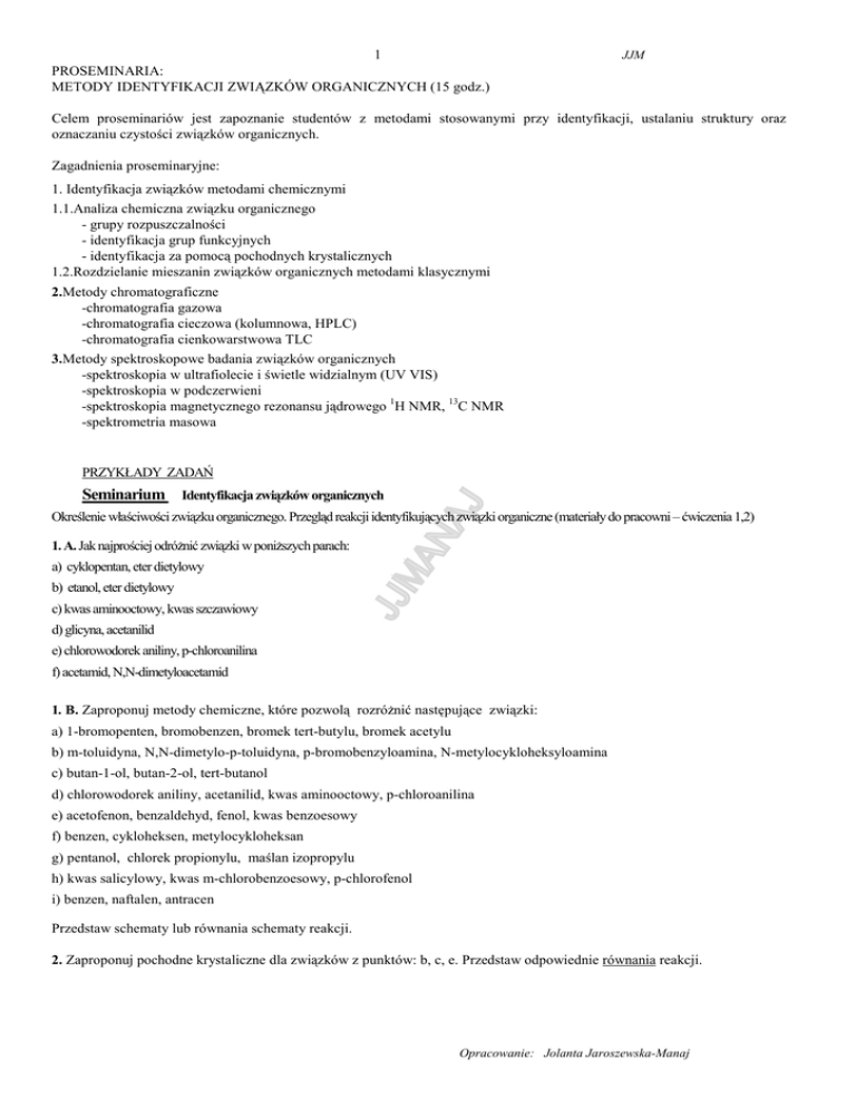 1 PROSEMINARIA: METODY IDENTYFIKACJI ZWIĄZKÓW ORGANICZNYCH (15 godz.) JJM Celem proseminariów jest zapoznanie studentów z metodami stosowanymi przy identyfikacji, ustalaniu struktury oraz oznaczaniu czystości związków organicznych. Zagadnienia proseminaryjne: 1. Identyfikacja związków metodami chemicznymi 1.1.Analiza chemiczna związku organicznego - grupy rozpuszczalności - identyfikacja grup funkcyjnych - identyfikacja za pomocą pochodnych krystalicznych 1.2.Rozdzielanie mieszanin związków organicznych metodami klasycznymi 2.Metody chromatograficzne -chromatografia gazowa -chromatografia cieczowa (kolumnowa, HPLC) -chromatografia cienkowarstwowa TLC 3.Metody spektroskopowe badania związków organicznych -spektroskopia w ultrafiolecie i świetle widzialnym (UV VIS) -spektroskopia w podczerwieni -spektroskopia magnetycznego rezonansu jądrowego 1H NMR, 13C NMR -spektrometria masowa PRZYKŁADY ZADAŃ Seminarium Identyfikacja związków organicznych Określenie właściwości związku organicznego. Przegląd reakcji identyfikujących związki organiczne (materiały do pracowni – ćwiczenia 1,2) 1. A. Jak najprościej odróżnić związki w poniższych parach: a) cyklopentan, eter dietylowy b) etanol, eter dietylowy c) kwas aminooctowy, kwas szczawiowy d) glicyna, acetanilid e) chlorowodorek aniliny, p-chloroanilina f) acetamid, N,N-dimetyloacetamid 1. B. Zaproponuj metody chemiczne, które pozwolą rozróżnić następujące związki: a) 1-bromopenten, bromobenzen, bromek tert-butylu, bromek acetylu b) m-toluidyna, N,N-dimetylo-p-toluidyna, p-bromobenzyloamina, N-metylocykloheksyloamina c) butan-1-ol, butan-2-ol, tert-butanol d) chlorowodorek aniliny, acetanilid, kwas aminooctowy, p-chloroanilina e) acetofenon, benzaldehyd, fenol, kwas benzoesowy f) benzen, cykloheksen, metylocykloheksan g) pentanol, chlorek propionylu, maślan izopropylu h) kwas salicylowy, kwas m-chlorobenzoesowy, p-chlorofenol i) benzen, naftalen, antracen Przedstaw schematy lub równania schematy reakcji. 2. Zaproponuj pochodne krystaliczne dla związków z punktów: b, c, e. Przedstaw odpowiednie równania reakcji. Opracowanie: Jolanta Jaroszewska-Manaj 2 JJM Seminarium: Mieszaniny 1. Podaj najprostszy sposób rozdzielenia mieszanin: a) cyklopentanu (c., tw 500 ,nr W, ∞ A, E) i cyklopentanolu (tt -190; tw 140-1420, ol., tr.W, r.A,E); b) p-toluidyny (tt 450, tw 200.50; 0.7520W, 1.380W, 23820A, łr E) i N-acetylo-p-toluidyny (tt 1530, tw 3050; kryst., 0.1020W, łr gor.W, 4.520A, łr E,Oct) 2. Jak rozdzielić mieszaniny, wykorzystując właściwości chemiczne składników: a) fenol i alkohol benzylowy; b) chlorobenzen, o-aminofenol i o-chlorofenol; Zapisz równania reakcji. 3. Jak, stosując destylację z parą wodną rozdzielić mieszaninę zawierającą a) anilinę, m-chlorofenol i kwas benzoesowy, b) izomery orto i para-nitrofenol Przedstaw równania reakcji. 4. Podaj sposób rozdzielenia mieszaniny następujących związków: N-acetylo-p-anizydyna, p-chloroanilina, chlorowodorek aniliny, p-chlorofenol Przedstaw odpowiednie schematy reakcji. 5. W wyniku działania jodkiem etylu na amoniak otrzymano mieszaninę produktów. Zaproponuj metodę ich rozdzielenia. 6. Aldehyd toluilowy poddano reakcji Cannizzaro. Jak rozdzielić produkty znajdujące się w alkalicznej mieszaninie poreakcyjnej? Zaproponuj pochodne krystaliczne dla substratu i produktów. Przedstaw równania wszystkich reakcji. 7. Mieszaninę czterech związków: ArOR, ArNH2, ArNR2, ArCOOH rozpuszczono w eterze i ekstrahowano 10% roztworem HCl. Które związki przeszły do warstwy wodnej? Jak rozdzielić wszystkie związki? Jak je jednoznacznie zidentyfikować? Zapisz równania reakcji. 8. Rozszyfruj charakterystykę substancji M,N,P: M: 10.015E, 2.5 15W; N: 5.0 15W; 15.015Chl; P: 3.1 15W; 46.515B Czy w powyższym przykładzie wystarczy jednokrotne wytrząsanie by ilościowo przenieść związek M, (N, P) z wody do rozpuszczalnika organicznego? Na podstawie podanych wartości rozpuszczalności dla substancji M, (N, P) oszacuj stałe podziału k. 9. Mieszaninę czterech związków: t-Bu-NH2, t-Bu-OH, p-CH3-C6H4OH, w eterze i ekstrahowano 10% roztworem NaOH. Podaj nazwy związków. Które z nich przeszły do warstwy wodnej? Jak rozdzielić wszystkie związki? Jak je jednoznacznie zidentyfikować? Przedstaw schematy reakcji p-CH3-C6H4COOH rozpuszczono 10. Produkt otrzymany w wyniku redukcji (orto, meta lub para) chloronitrobenzenu (Sn/HCl) jest zanieczyszczony substratem. Zaproponuj sposób rozdzielenia substratu i produktu. Czy podstawienie w substracie może mieć znaczenie w wyborze metody. Jak ustalić tożsamość substratu. Jakie pochodne krystaliczne pomogą w identyfikacji produktu. Przedstaw równania wszystkich reakcji. omp- Substrat (m.cz. 157,6) o o tt C tw C 33 245 nr.W, r.AEB 46 235 nr.W, r.AEB 83 242 nr.W, r.AEB o tt C 70 o tw C 209 230 232 Produkt (m.cz. 127,6) 20 n 1,5895 r.AEB lpw 1,5930 r.AEB lpw r.AEB o tt pochodnych C N-acet. 88; N-benzoil. 99 N-acet. 79; N-benzoil. 118 N-acet. 178; N-benzoil. 192 Opracowanie: Jolanta Jaroszewska-Manaj 3 JJM Seminarium Chromatografia 1. Oblicz wartość Rf jeśli wiadomo że: a) eluent powędrował na wysokość 8cm, zaś plamka związku znalazła się 2cm od startu; b) odległość od startu do plamki wynosi 4cm i od plamki do czoła też 4cm c) odległość od startu do czoła wynosi 10cm, a od plamki do czoła 2cm. 2. Dwie substancje A i B naniesiono na płytkę i rozwinięto dichlorometanem otrzymując wynik przedstawiony na rysunku. O O A B - Podaj wartość Rf związku B. - Narysuj oczekiwany wynik chromatografii przy zastosowaniu heksanu do rozwijania. - Narysuj oczekiwany wynik gdy eluentem jest mieszanina heksan:dichlorometan 1:1 - Jak będzie wyglądał chromatogram, gdy obie substancje zostaną naniesione w jedno miejsce, a do rozwijania użyje się dichlorometanu? Chromatografowane substancje to a) naftalen i 2-naftol. - Wskaż, którą z nich stanowi związek A, a którą B. 3.