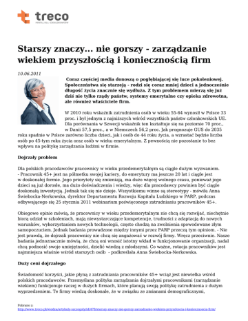 Starszy znaczy... nie gorszy - zarządzanie wiekiem przyszłością i koniecznością firm 10.06.2011 Coraz częściej media donoszą o pogłębiającej się luce pokoleniowej. Społeczeństwa się starzeją - rodzi się coraz mniej dzieci a jednocześnie długość życia znacznie się wydłuża. Z tym problemem mierzą się już dziś nie tylko rządy państw, systemy emerytalne czy opieka zdrowotna, ale również właściciele firm. W 2010 roku wskaźnik zatrudnienia osób w wieku 55-64 wynosił w Polsce 33 proc. i był jednym z najniższych wśród wszystkich państw członkowskich UE. Dla porównania w Szwecji wskaźnik ten kształtuje się na poziomie 70 proc., w Danii 57,5 proc., a w Niemczech 56,2 proc. Jak prognozuje GUS do 2035 roku spadnie w Polsce zarówno liczba dzieci, jak i osób do 44 roku życia, a wzrastać będzie liczba osób po 45-tym roku życia oraz osób w wieku emerytalnym. Z pewnością nie pozostanie to bez wpływu na politykę zarządzania ludźmi w firmie. Dojrzały problem Dla polskich pracodawców pracownicy w wieku przedemerytalnym są ciągle dużym wyzwaniem. - Pracownik 45+ jest na półmetku swojej kariery, do emerytury ma jeszcze 20 lat i ciągle jest w doskonałej formie. Jego priorytety się zmieniają, ma dużo więcej wolnego czasu, ponieważ jego dzieci są już dorosłe, ma dużo doświadczenia i wiedzy, więc dla pracodawcy powinien być ciągle doskonałą inwestycją. Jednak tak się nie dzieje. Wszystkiemu winne są stereotypy - mówiła Anna Świebocka-Nerkowska, dyrektor Departamentu Rozwoju Kapitału Ludzkiego w PARP, podczas odbywającego się 25 stycznia 2011 webinarium poświęconego zatrudnianiu pracowników 45+. Obiegowe opinie mówią, że pracownicy w wieku przedemerytalnym nie chcą się rozwijać, niechętnie biorą udział w szkoleniach, mają niewystarczające kompetencje, trudności z adaptacją do nowych warunków, wykorzystaniem nowych technologii, często chodzą na zwolnienia spowodowane złym samopoczuciem. Jednak badania prowadzone między innymi przez PARP przeczą tym opiniom. - Nie jest prawdą, że dojrzali pracownicy nie chcą się angażować w rozwój firmy. Wręcz przeciwnie. Nasze badania jednoznacznie mówią, że chcą oni wnosić istotny wkład w funkcjonowanie organizacji, nadal chcą podnosić swoje umiejętności, dzielić wiedzą z młodszymi. Co ważne, rotacja pracowników jest najmniejsza właśnie wśród starszych osób - podkreślała Anna Świebocka-Nerkowska. Duży ceni dojrzałego Świadomość korzyści, jakie płyną z zatrudniania pracowników 45+ wciąż jest niewielka wśród polskich pracodawców. Przemyślana polityka zarządzania dojrzałymi pracownikami (zarządzanie wiekiem) funkcjonuje raczej w dużych firmach, które planują swoją politykę zatrudnienia z dużym wyprzedzeniem. Te firmy wiedzą doskonale, że w związku ze zmianami demograficznymi, Pobrano z: http://www.treco.pl/wiedza/artykuly-szczegoly/id/478/starszy-znaczy-nie-gorszy-zarzadzanie-wiekiem-przyszloscia-i-koniecznoscia-firm/ wykorzystanie pracowników w wieku emerytalnym będzie jednym z elementów pozwalających na utrzymanie stabilizacji w zatrudnieniu. Na każdym etapie równość Jedną z firm zarządzających wiekiem jest firma „TP EmiTel” - operator naziemnej infrastruktury radiowo-telewizyjnej. Firma świadczy usługi w zakresie analogowej i cyfrowej emisji naziemnej oraz transmisji sygnałów telewizyjnych i radiofonicznych. Firma zatrudnia 933 pracowników, z czego blisko 1/3 stanowią osoby 50+. Firma realizuje kompleksową politykę zarządzania zasobami ludzkimi, uwzględniającą również pracowników 50+. Już na etapie rekrutacji firma stosuje zasadę równości dla wszystkich kandydatów - uwzględnia wyłącznie kwalifikacje i kompetencje kandydatów, a wiek nie odgrywa żadnej roli. W efekcie 13 proc. pracowników zatrudnionych w latach 2008-2010 na stanowiska specjalistyczne i kierownicze to osoby w wieku 40+. Firma realizuje także program przekazywania specjalistycznej wiedzy technicznej „Trener Wewnętrzny w TP EmiTel”. W programie w charakterze osoby prowadzącej szkolenia uczestniczą m.in. osoby 50+, które przekazują posiadaną przez siebie wiedzę młodszym współpracownikom. W firmie realizowane są również różne programy podnoszenia i doskonalenia kwalifikacji dla pracowników i kadry menedżerskiej. Dostęp do programów jest równy dla wszystkich pracowników. Za swoje działania uwzględniające potrzeby dojrzałych pracowników firma została w 2010 roku laureatem Konkursu „Zysk z dojrzałości 2010" i zdobywcą tytułu „Pracodawca Przyjazny Pracownikom 50+ ". Nic wielkiego W grupie „CEMEX Polska” ponad ¼ załogi stanowią dojrzali pracownicy. Firma należy do krajowej czołówki producentów cementu, betonu towarowego i kruszyw. Jak twierdzi, Jerzy Nocuń, dyrektor Działu Kadr i Płac, w firmie nie ma specjalnej kategorii działań skierowanych do osób 50+. Nie znaczy to, że te działania nie są prowadzone. Oferta dla osób w wieku 50 lat jest integralną częścią polityki zrównoważonego zatrudnienia i rozwoju. A ta opiera się na zapewnieniu wszystkim, bez względu na wiek, równego dostępu do programów zarządzania talentami, ścieżek kariery i planowania sukcesji. Praca w firmie wymaga nie tylko wiedzy teoretycznej, skomplikowane procesy technologiczne wymagają dużego doświadczenia, które zdobywa się w ciągu lat pracy. Dlatego też pracownicy posiadający doświadczenie, są mentorami dla młodych inżynierów i opiekunami stażystów. Awans czy też propozycja nowej ścieżki kariery nie są zarezerwowane tylko dla młodych menedżerów, również osoby 50+ mogą liczyć na uczestnictwo w projektach rozwojowych, a co za tym możliwość awansu jest dla nich dostępna. Wiek zapewniający stabilność Podobne rozwiązania przyjęła również firma „ZEMAT” będąca producentem oraz dostawcą urządzeń wykorzystujących technologię wysok