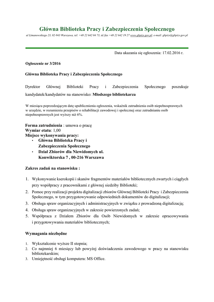 Główna Biblioteka Pracy i Zabezpieczenia Społecznego ul Limanowskiego 23, 02-943 Warszawa, tel: +48 22 642 04 73, td./fax +48 22 642 19 27 www.gbpizs.gov.pl; e-mail: [email protected] Data ukazania się ogłoszenia: 17.02.2016 r. Ogłoszenie nr 3/2016 Główna Biblioteka Pracy i Zabezpieczenia Społecznego Dyrektor Głównej Biblioteki Pracy i Zabezpieczenia Społecznego poszukuje kandydatek/kandydatów na stanowisko: Młodszego bibliotekarza W miesiącu poprzedzającym datę upublicznienia ogłoszenia, wskaźnik zatrudnienia osób niepełnosprawnych w urzędzie, w rozumieniu przepisów o rehabilitacji zawodowej i społecznej oraz zatrudnianiu osób niepełnosprawnych jest wyższy niż 6%. Forma zatrudnienia : umowa o pracę Wymiar etatu: 1,00 Miejsce wykonywania pracy: • Główna Biblioteka Pracy i Zabezpieczenia Społecznego • Dział Zbiorów dla Niewidomych ul. Konwiktorska 7 , 00-216 Warszawa Zakres zadań na stanowisku : 1. Wykonywanie kserokopii i skanów fragmentów materiałów bibliotecznych zwartych i ciągłych przy współpracy z pracownikami z głównej siedziby Biblioteki; 2. Pomoc przy realizacji projektu digitalizacji zbiorów Głównej Biblioteki Pracy i Zabezpieczenia Społecznego, w tym przygotowywanie odpowiednich dokumentów do digitalizacji; 3. Obsługa spraw organizacyjnych i administracyjnych w związku z prowadzoną digitalizacją; 4. Obsługa spraw organizacyjnych w zakresie powierzonych zadań; 5. Współpraca z Działem Zbiorów dla Osób Niewidomych w zakresie opracowywania i przygotowywania materiałów bibliotecznych; Wymagania niezbędne Wyksztalcenie wyższe II stopnia; Co najmniej 6 miesięcy lub powyżej doświadczenia zawodowego w pracy na stanowisku bibliotekarskim; 3. Umiejętność obsługi komputera: MS Office. 1. 2. Wymagania dodatkowe: 1. 2. 3. 4. Systematyczność; Odpowiedzialność; Dyspozycyjność; Umiejętność pracy w zespole. Warunki pracy: Warunki dotyczące charakteru pracy na stanowisku i sposobu wykonywanych zadań: praca biurowa, praca wykonywana do 8 godzin dziennie, praca z monitorem ekranowym i skanowaniem dokumentów Wymagane dokumenty i oświadczenia: życiorys i list motywacyjny, oświadczenie kandydata o wyrażeniu zgody na przetwarzanie danych osobowych do celów rekrutacji, oświadczenie kandydata o spełnianiu określonych wymogów, oświadczenie kandydata o korzystaniu z pełni praw publicznych, oświadczenie kandydata o nieskazaniu prawomocnym wyrokiem za umyślne przestępstwo, oświadczenie kandydata o nieskazaniu prawomocnym wyrokiem za umyślne przestępstwo skarbowe, kopie dokumentów potwierdzających wykształcenie, kopie dokumentów potwierdzających dodatkowe kwalifikacje; oświadczenie o posiadaniu obywatelstwa polskiego Oświadczenia powinny być własnoręcznie podpisane przez kandydata. Powyższe dokumenty w języku polskim należy dostarczyć/przesłać w formie papierowej w terminie do 22.02.2016 r. (liczy się data wpływu dokumentów). Miejsce składania dokumentów: Sekretariat Głównej Biblioteki Pracy i Zabezpieczenia Społecznego ul. Limanowskiego 23 02-943 Warszawa Aplikacje można również przesyłać elektronicznie na adres: [email protected] (wymagane w ogłoszeniu oświadczenia powinny być własnoręcznie podpisane przez kandydata i przesłane w formie scanu) Do składania ofert zachęcamy również osoby niepełnosprawne, które spełniają wymagania określone w niniejszym ogłoszeniu. O terminie postępowania mającego na celu wyłonienie kandydata, osoby spełniające wymagania zostaną poinformowane telefonicznie. Informujemy, iż skontaktujemy się tylko z wybranymi kandydatami.