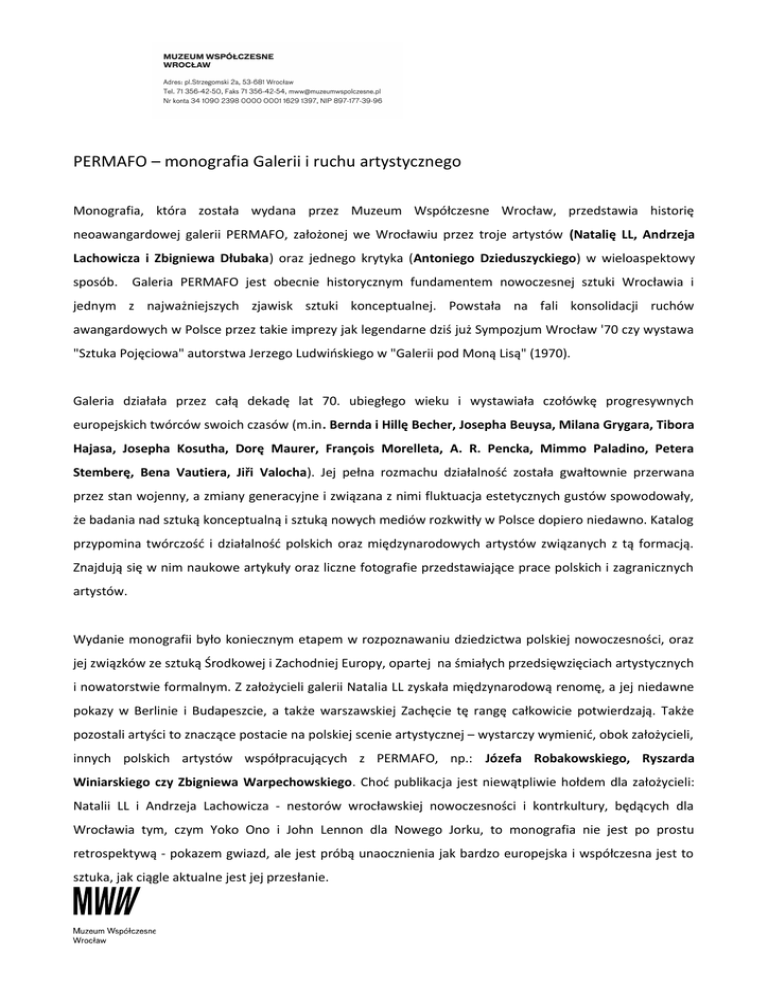 PERMAFO – monografia Galerii i ruchu artystycznego Monografia, która została wydana przez Muzeum Współczesne Wrocław, przedstawia historię neoawangardowej galerii PERMAFO, założonej we Wrocławiu przez troje artystów (Natalię LL, Andrzeja Lachowicza i Zbigniewa Dłubaka) oraz jednego krytyka (Antoniego Dzieduszyckiego) w wieloaspektowy sposób. Galeria PERMAFO jest obecnie historycznym fundamentem nowoczesnej sztuki Wrocławia i jednym z najważniejszych zjawisk sztuki konceptualnej. Powstała na fali konsolidacji ruchów awangardowych w Polsce przez takie imprezy jak legendarne dziś już Sympozjum Wrocław '70 czy wystawa "Sztuka Pojęciowa" autorstwa Jerzego Ludwińskiego w "Galerii pod Moną Lisą" (1970). Galeria działała przez całą dekadę lat 70. ubiegłego wieku i wystawiała czołówkę progresywnych europejskich twórców swoich czasów (m.in. Bernda i Hillę Becher, Josepha Beuysa, Milana Grygara, Tibora Hajasa, Josepha Kosutha, Dorę Maurer, François Morelleta, A. R. Pencka, Mimmo Paladino, Petera Stemberę, Bena Vautiera, Jiři Valocha). Jej pełna rozmachu działalność została gwałtownie przerwana przez stan wojenny, a zmiany generacyjne i związana z nimi fluktuacja estetycznych gustów spowodowały, że badania nad sztuką konceptualną i sztuką nowych mediów rozkwitły w Polsce dopiero niedawno. Katalog przypomina twórczość i działalność polskich oraz międzynarodowych artystów związanych z tą formacją. Znajdują się w nim naukowe artykuły oraz liczne fotografie przedstawiające prace polskich i zagranicznych artystów. Wydanie monografii było koniecznym etapem w rozpoznawaniu dziedzictwa polskiej nowoczesności, oraz jej związków ze sztuką Środkowej i Zachodniej Europy, opartej na śmiałych przedsięwzięciach artystycznych i nowatorstwie formalnym. Z założycieli galerii Natalia LL zyskała międzynarodową renomę, a jej niedawne pokazy w Berlinie i Budapeszcie, a także warszawskiej Zachęcie tę rangę całkowicie potwierdzają. Także pozostali artyści to znaczące postacie na polskiej scenie artystycznej – wystarczy wymienić, obok założycieli, innych polskich artystów współpracujących z PERMAFO, np.: Józefa Robakowskiego, Ryszarda Winiarskiego czy Zbigniewa Warpechowskiego. Choć publikacja jest niewątpliwie hołdem dla założycieli: Natalii LL i Andrzeja Lachowicza - nestorów wrocławskiej nowoczesności i kontrkultury, będących dla Wrocławia tym, czym Yoko Ono i John Lennon dla Nowego Jorku, to monografia nie jest po prostu retrospektywą - pokazem gwiazd, ale jest próbą unaocznienia jak bardzo europejska i współczesna jest to sztuka, jak ciągle aktualne jest jej przesłanie. W katalogu zostały zaprezentowane fotografie przedstawiające prace wybitnych artystów z ich wystaw w galerii PERMAFO, kalendarium artystycznych działań oraz artykuły omawiające wieloaspektowo bogaty dorobek galerii PERMAFO. DANE TECHNICZNE: Zawartość: • teksty archiwalne z lat 70-tych minionego wieku (recenzje, teksty teoretyczne) – (40%) • tekst nowozamawiane (60%), autorzy monografii: 1. Gislind Nabakowski – historyczka sztuki i kultury, realizuje badania, które obejmują video, fotografię, studia Genderowe i medioznawcze. 1971-77 założycielka i redaktorka naczelna magazynu ‘heute Kunst’ 2. Biljana Tomić – historyczka sztuki, niezależna kuratorka, obecnie dyrektorka nKA / ICA w Belgradzie 3. Anna Markowska - historyk i krytyk sztuki, profesor Uniwersytetu Wrocławskiego, kuratorka wystawy „PERMAFO”, redaktorka naukowa monografii 4. Grzegorz Dziamski - profesor, kierownik Zakładu Badań nad Kulturą Artystyczną w Instytucie Kulturoznawstwa Uniwersytetu im. A. Mickiewicza w Poznaniu 5. Adam Sobota - historyk i krytyk sztuki, kustosz w Dziale Sztuki Współczesnej Muzeum Narodowego we Wrocławiu. Specjalizuje się w dziedzinie fotografii i nowych mediów. 6. Magda Radomska - postmarksistowska historyczka sztuki i historyczka filozofii. 7. Małgorzata Jankowska - adiunkt w Zakładzie Historii Sztuki Nowoczesnej, Uniwersytetu Mikołaja Kopernika w Toruniu. 8. Barbara Baworowska - historyk sztuki, kustosz wrocławskiego Muzeum Narodowego 9. Zbigniew Makarewicz - rzeźbiarz, performer, pionier sztuki pojęciowej, organizator ruchu artystycznego, działacz społeczny i polityczny, krytyk sztuki, profesor zwyczajny, Akademii Sztuk Pięknych we Wrocławiu 10. Grzegorz Sztabiński - artysta i teoretyk sztuki. Profesor zwyczajny Uniwersytetu Łódzkiego, kieruje Katedrą Estetyki. • Monografia w pełni ilustrowana zdjęciami archiwalnymi i współczesnymi. Większość zdjęć jest publikowana po raz pierwszy. • Objętość: 496 stron (kreda) plus okładka, około 200 ilustracji czarno-białych, indeks. • format A4, • Nakład katalogu w języku polskim: 1000 egzemplarzy.