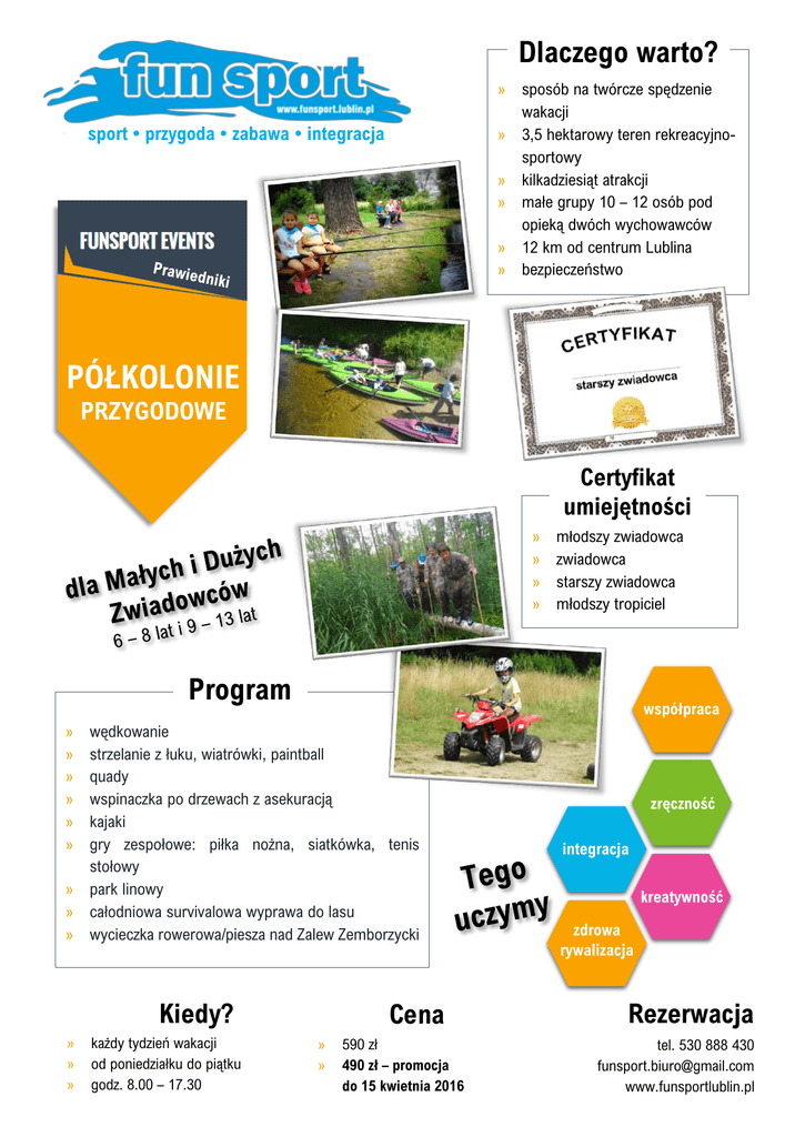 Dlaczego warto? » sport • przygoda • zabawa • integracja » » » » » sposób na twórcze spędzenie wakacji 3,5 hektarowy teren rekreacyjnosportowy kilkadziesiąt atrakcji małe grupy 10 – 12 osób pod opieką dwóch wychowawców 12 km od centrum Lublina bezpieczeństwo PÓŁKOLONIE PRZYGODOWE Certyfikat umiejętności » » » » młodszy zwiadowca zwiadowca starszy zwiadowca młodszy tropiciel Program » » » » » » » » » współpraca wędkowanie strzelanie z łuku, wiatrówki, paintball quady wspinaczka po drzewach z asekuracją kajaki gry zespołowe: piłka nożna, siatkówka, tenis stołowy park linowy całodniowa survivalowa wyprawa do lasu wycieczka rowerowa/piesza nad Zalew Zemborzycki Kiedy? » » » każdy tydzień wakacji od poniedziałku do piątku godz. 8.00 – 17.30 Cena » » 590 zł 490 zł – promocja do 15 kwietnia 2016 zręczność integracja kreatywność zdrowa rywalizacja Rezerwacja tel. 530 888 430 [email protected] www.funsportlublin.pl Półkolonie zgłoszone do Lubelskiego Kuratorium Oświaty pod nr LBN/507/201/50626 Harmonogram PONIEDZIAŁE poniedziałek – środa – piątek K » » » » » » » » » » » » 8.00 zbiórka pod MOSiR Al. Zygmuntowskie, przejazd do Prawiednik (MPK 25) 9.20 – 9.35 odprawa 9.35 – 10.00 śniadanie 10.30 – 11.00 I tura zajęć 11.00 – 12.00 II tura zajęć 12.00 – 13.00 III tura zajęć 13.00 – 13.45 obiad 13.45 – 14.45 IV tura zajęć 14.45 – 16.00 trening ogólnorozwojowy „fun- kick” / gry i zabawy terenowe 16.00 podwieczorek, podsumowanie zajęć 16.24 powrót do Lublina 17.20 odebranie dzieci na parkingu pod MOSiR Al. Zygmuntowskie W zależności od pogody w poszczególnych turach przewidziane są: treningi gier zespołowych, zajęcia linowe, strzeleckie, łucznictwo, quady, wędkarstwo, kajaki, gry i zabawy integracyjne, zajęcia z gier stolikowych (szachy, warcaby), tenis stołowy, trening survivalowych umiejętności poznawczych. Weź ze sobą » » » » » » » » » » Cena zawiera » » » » » » » » » » całodniowa survivalowa wycieczka do lasu budowa szałasów, gry terenowe, sztandary, podchody, rozpalanie ogniska różnymi sposobami spływ kajakowy Bystrzycą czwartek » całodniowa wycieczka rowerowa lub piesza nad Zalew Zemborzycki „tour de zalew” ! Regulamin półkolonii dostępny na stronie www.funsportlublin.pl opieka pedagogiczna opieka instruktorów herbata i owoce do drugiego śniadania obiad podwieczorek woda mineralna bilety wstępu do parku linowego bilety wstępu na baseny ubezpieczenie NNW ! Organizator nie zapewnia biletów MPK i drugiego śniadania. ! W przypadku rezygnacji z poszczególnych dni na turnusie nie ma możliwości zwrotu poniesionych kosztów ani odebrania "niewykorzystanych dni" w innym terminie. Zapisy wtorek » » legitymacja szkolna mały plecak drugie śniadanie strój kąpielowy ręcznik buty do kąpieli w rzece krótkie spodenki koszulka na zmianę czapka ubierz się w dres, kryte sportowe buty » » zarezerwuj miejsce: [email protected] pobierz kartę kwalifikacyjną z: www.funsportlublin.pl/do-pobrania (wydrukuj, wypełnij, zeskanuj, odeślij mailem z dowodem wpłaty, oryginał przekaż dziecku do oddania kierownikowi półkolonii) » wpłać zaliczkę 200 zł lub całość (całość – jeśli do rozpoczęcia turnusu pozostało mniej niż 14 dni kalendarzowych) » w ciągu 1 – 2 dni po zaksięgowaniu wpłaty otrzymasz mail z potwierdzeniem rezerwacji