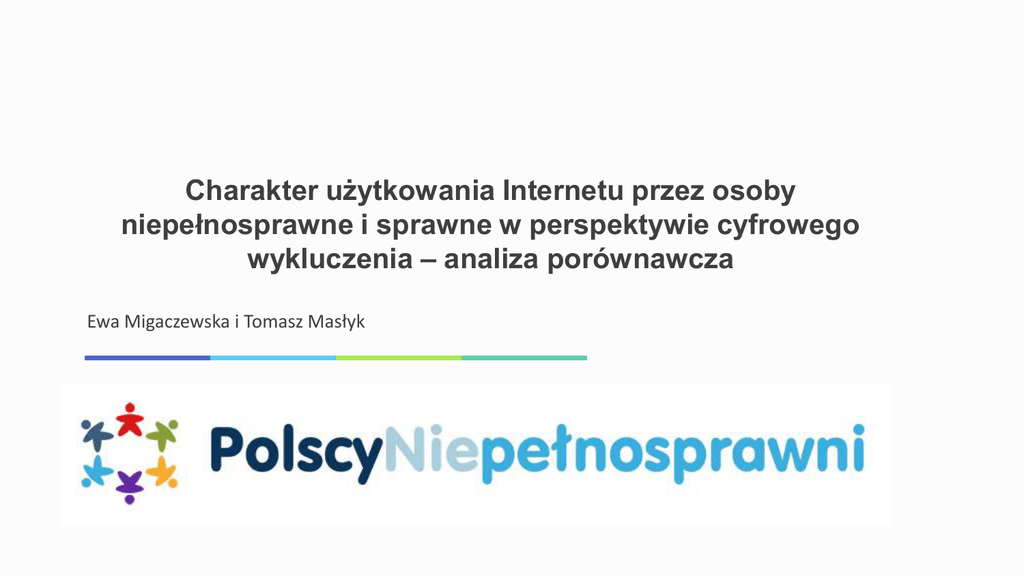 Charakter użytkowania Internetu przez osoby niepełnosprawne i sprawne w perspektywie cyfrowego wykluczenia – analiza porównawcza Ewa Migaczewska i Tomasz Masłyk 2 Użytkownicy Internetu 33% 76% niepełnosprawni sprawni 3 Od cyfrowego podziału do cyfrowego wykluczenia Cyfrowy podział (digital divide) Cyfrowa nierówność (digital inequality) Cyfrowe wykluczenie (digital exclusion) fizyczne (physical access) finansowe (financial access) poznawcze (cognitive access) użyteczne (design access) twórcze (production access) instytucjonalne (institutional access) polityczne (political access) Cechy istotnie wpływające na prawdopodobieństwo korzystania z Internetu Niepełnosprawni Sprawni wiek: 16-24 lata i 35-44 lata wiek: 16-24 lata wykształcenie: policealne lub wyższe wykształcenie: policealne lub wyższe miejsce zamieszkania: miasta 100-200 tys. miejsce zamieszkania: miasta powyżej 500 tys. dochód: 2-3 kwartyl dochód: powyżej 3 kwartyla status zawodowy: pracownicy sektora prywatnego lub status zawodowy: prywatni przedsiębiorcy, uczniowie publicznego, rolnicy, uczniowie i studenci, bezrobotni i studenci stopień niepełnosprawności: umiarkowany lub znaczny 4 Zakres i intensywność wykorzystania Internetu przez osoby niepełnosprawne i sprawne Niepełnosprawni Sprawni zakres: 13 czynności/26 zakres: 15 czynności/26 intensywność: 10 godzin/tydzień intensywność: 13 godzin/tydzień 5 Aktywności podejmowane w Internecie przez osoby niepełnosprawne i sprawne społecznościoworozrywkowy uczestnictwo w czatach, w grupach lub forach dyskusyjnych korzystanie z Facebooka lub innych portali społecznościowych granie w gry sieciowe ściąganie darmowego oprogramowania, darmowej muzyki i filmów komplementarny słuchanie muzyki lub radia czytanie gazet lub książek oglądanie telewizji za pośrednictwem Internetu. komunikacyjnoinformacyjny instytucjonalny kreatywny zbieranie materiałów potrzebnych do nauki lub pracy sprawdzanie i wysyłanie poczty elektronicznej korzystanie z komunikatorów i telefonowanie przez Internet kupowanie produktów lub usług przez Internet w Polsce rezerwacja biletów (lotniczych, do kina, do teatru) korzystanie w domu z Internetu i poczty elektronicznej w celach zawodowych uzyskiwanie informacji ze stron instytucji publicznych, pobieranie lub wypełnianie formularzy urzędowych korzystanie z elektronicznej bankowości tworzenie i publikowanie własnych tekstów, grafiki, muzyki, itp., tworzenie lub modyfikowanie strony WWW uczestnictwo w internetowych kursach lub szkoleniach uczestniczenie w aukcjach szukanie pracy w tym wysyłanie ofert dotyczących zatrudnienia kupowanie produktów i usług przez Internet z zagranicy 6 Różnica zaangażowania w formy aktywności podejmowane w Internecie przez osoby niepełnosprawne i sprawne 7 8 Cyfrowy podział? Osoby niepełnosprawne vs sprawne Użytkownicy niepełnosprawni vs sprawni Niepełnosprawni korzystający vs niekorzystający z Internetu istotne zróżnicowanie w wymiarze cech demograficznospołecznych ponad dwukrotnie niższy odsetek niepełnosprawnych użytkowników w porównaniu z użytkownikami sprawnymi dysproporcje wynikające z odmiennych cech demograficznospołecznych Cyfrowe nierówności – funkcja potrzeb czy zasobów? konieczność diagnozy Dziękujemy za uwagę