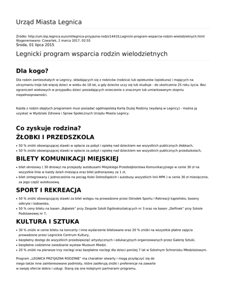 Urząd Miasta Legnica Źródło: http://um.bip.legnica.eu/uml/legnica-przyjazna-rodzi/14410,Legnicki-program-wsparcia-rodzin-wielodzietnych.html Wygenerowano: Czwartek, 2 marca 2017, 02:55 Środa, 01 lipca 2015 Legnicki program wsparcia rodzin wielodzietnych Dla kogo? Dla rodzin zamieszkałych w Legnicy, składających się z rodziców (rodzica) lub opiekunów (opiekuna) i mających na utrzymaniu troje lub więcej dzieci w wieku do 18 lat, a gdy dziecko uczy się lub studiuje - do ukończenia 25 roku życia. Bez ograniczeń wiekowych w przypadku dzieci posiadających orzeczenie o znacznym lub umiarkowanym stopniu niepełnosprawności. Każda z rodzin objętych programem musi posiadać ogólnopolską Kartę Dużej Rodziny (wydaną w Legnicy) - można ją uzyskać w Wydziale Zdrowia i Spraw Społecznych Urzędu Miasta Legnicy. Co zyskuje rodzina? ŻŁOBKI I PRZEDSZKOLA ● 50 % zniżki obowiązującej stawki w opłacie za pobyt i opiekę nad dzieckiem we wszystkich publicznych żłobkach, ● 50 % zniżki obowiązującej stawki w opłacie za pobyt i opiekę nad dzieckiem we wszystkich publicznych przedszkolach, BILETY KOMUNIKACJI MIEJSKIEJ ● bilet okresowy ( 30 dniowy) na przejazdy autobusami Miejskiego Przedsiębiorstwa Komunikacyjnego w cenie 30 zł na wszystkie linie w każdy dzień miesiąca oraz bilet jednorazowy za 1 zł, ● bilet zintegrowany ( jednocześnie na pociąg Kolei Dolnośląskich i autobusy wszystkich linii MPK ) w cenie 30 zł miesięcznie, za jego część autobusową. SPORT I REKREACJA ● 50 % zniżki obowiązującej stawki za bilet wstępu na prowadzone przez Ośrodek Sportu i Rekreacji kąpielisko, baseny odkryte i lodowisko, ● 50 % ceny biletu na basen „Bąbelek” przy Zespole Szkół Ogólnokształcących nr 3 oraz na basen „Delfinek” przy Szkole Podstawowej nr 7, KULTURA I SZTUKA ● 30 % zniżki w cenie biletu na koncerty i inne wydarzenie biletowane oraz 20 % zniżki na wszystkie płatne zajęcia prowadzone przez Legnickie Centrum Kultury, ● bezpłatny dostęp do wszystkich przedsięwzięć artystycznych i edukacyjnych organizowanych przez Galerię Sztuki, ● bezpłatne codzienne zwiedzanie wystaw Muzeum Miedzi. ● 20 % zniżki na pierwsze trzy noclegi oraz bezpłatne noclegi dla dzieci poniżej 7 lat w Szkolnym Schronisku Młodzieżowym. Program „LEGNICA PRZYJAZNA RODZINIE” ma charakter otwarty i mogą przyłączyć się do niego także inne zainteresowane podmioty, które zaoferują zniżki i preferencje na zawarte w swojej ofercie dobra i usługi. Staną się one kolejnymi partnerami programu. PRZYJMOWANIE WNIOSKÓW I WYDAWANIE KART URZĄD MIASTA LEGNICY - WYDZIAŁ ZDROWIA I SPRAW SPOŁECZNYCH parter - pok. 11, 12, 13 tel. 76 7212250, 76 7212254 Metadane Data publikacji 01.07.2015 Data modyfikacji 01.07.2015 Rejestr zmian Podmiot udostępniający informację: Urząd Miasta Legnica Osoba wytwarzająca/odpowiadająca za informację: Jarosław Mokwiński Osoba udostępniająca informację: Grzegorz Żądło Wydział Zdrowia i Spraw Społecznych Osoba modyfikująca informację: Grzegorz Żądło