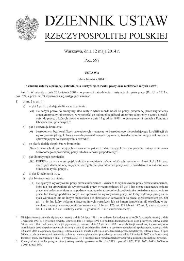 DZIENNIK USTAW RZECZYPOSPOLITEJ POLSKIEJ Warszawa, dnia 12 maja 2014 r. Poz. 598 USTAWA z dnia 14 marca 2014 r. o zmianie ustawy o promocji zatrudnienia i instytucjach rynku pracy oraz niektórych innych ustaw1) Art. 1. W ustawie z dnia 20 kwietnia 2004 r. o promocji zatrudnienia i instytucjach rynku pracy (Dz. U. z 2013 r. poz. 674, z późn. zm.2)) wprowadza się następujące zmiany: 1)w art. 2 w ust. 1: a)w pkt 2 po lit. c dodaje się lit. ca w brzmieniu: „ca)nie nabyła prawa do emerytury albo renty z tytułu niezdolności do pracy, przyznanej przez zagraniczny organ emerytalny lub rentowy, w wysokości co najmniej najniższej emerytury albo renty z tytułu niezdolności do pracy, o których mowa w ustawie z dnia 17 grudnia 1998 r. o emeryturach i rentach z Funduszu Ubezpieczeń Społecznych,”, b)pkt 6 otrzymuje brzmienie: „6)bezrobotnym bez kwalifikacji zawodowych – oznacza to bezrobotnego nieposiadającego kwalifikacji do wykonywania jakiegokolwiek zawodu poświadczonych dyplomem, świadectwem lub innym dokumentem uprawniającym do wykonywania zawodu;”, c)po pkt 9a dodaje się pkt 9aa w brzmieniu: „9aa) działaniach aktywizacyjnych – oznacza to pakiet działań mających na celu podjęcie i utrzymanie przez bezrobotnego odpowiedniej pracy lub działalności gospodarczej;”, d)pkt 9b otrzymuje brzmienie: „9b) EURES – oznacza to europejskie służby zatrudnienia państw, o których mowa w art. 1 ust. 3 pkt 2 lit. a–c, realizujące działania obejmujące w szczególności pośrednictwo pracy wraz z doradztwem w zakresie mobilności na rynku pracy;”, e)w pkt 13 uchyla się lit. e, f)pkt 14 otrzymuje brzmienie: „14) nielegalnym wykonywaniu pracy przez cudzoziemca – oznacza to wykonywanie pracy przez cudzoziemca, który nie jest uprawniony do wykonywania pracy w rozumieniu art. 87 ust. 1 lub nie posiada zezwolenia na pracę, nie będąc zwolnionym na podstawie przepisów szczególnych z obowiązku posiadania zezwolenia na pracę, lub którego podstawa pobytu nie uprawnia do wykonywania pracy, lub który wykonuje pracę na innych warunkach lub na innym stanowisku niż określone w zezwoleniu na pracę, z zastrzeżeniem art. 88f ust. 1a–1c, lub który wykonuje pracę na innych warunkach lub na innym stanowisku niż określone w zezwoleniu na pobyt czasowy, o którym mowa w art. 114, art. 126, art. 127 lub art. 142 ust. 3, z zastrzeżeniem art. 119 i art. 135 ust. 3 ustawy z dnia 12 grudnia 2013 r. o cudzoziemcach;”, Niniejszą ustawą zmienia się ustawy: ustawę z dnia 26 lipca 1991 r. o podatku dochodowym od osób fizycznych, ustawę z dnia 7 września 1991 r. o systemie oświaty, ustawę z dnia 15 lutego 1992 r. o podatku dochodowym od osób prawnych, ustawę z dnia 30 sierpnia 1996 r. o komercjalizacji i prywatyzacji, ustawę z dnia 27 sierpnia 1997 r. o rehabilitacji zawodowej i społecznej oraz zatrudnianiu osób niepełnosprawnych, ustawę z dnia 13 października 1998 r. o systemie ubezpieczeń społecznych, ustawę z dnia 12 marca 2004 r. o pomocy społecznej, ustawę z dnia 30 kwietnia 2004 r. o świadczeniach przedemerytalnych, ustawę z dnia 13 lipca 2006 r. o ochronie roszczeń pracowniczych w razie niewypłacalności pracodawcy, ustawę z dnia 13 kwietnia 2007 r. o Państwowej Inspekcji Pracy oraz ustawę z dnia 16 września 2011 r. o szczególnych rozwiązaniach związanych z usuwaniem skutków powodzi. 2) Zmiany tekstu jednolitego wymienionej ustawy zostały ogłoszone w Dz. U. z 2013 r. poz. 675, 829, 1291, 1623, 1645 i 1650 oraz z 2014 r. poz. 567. 1) Dziennik Ustaw – 2 – Poz. 598 g)pkt 21a otrzymuje brzmienie: „21a) partnerstwie transgranicznym EURES – oznacza to działania sieci EURES w regionach przygranicznych Rzeczypospolitej Polskiej, realizowane przez służby zatrudnienia oraz inne podmioty z państw, o których mowa w art. 1 ust. 3 pkt 2 lit. a–c, uprawnione do realizacji działań sieci EURES;”, h)po pkt 22 dodaje się pkt 22a w brzmieniu: „22a) powierzeniu cudzoziemcowi nielegalnego wykonywania pracy – oznacza to powierzenie wykonywania pracy cudzoziemcowi, który nie jest uprawniony do wykonywania pracy w rozumieniu art. 87 ust. 1 lub nie posiada zezwolenia na pracę, nie będąc zwolnionym na podstawie przepisów szczególnych z obowiązku posiadania zezwolenia na pracę, lub którego podstawa pobytu nie uprawnia do wykonywania pracy, lub który wykonuje pracę na innych warunkach lub na innym stanowisku niż określone w zezwoleniu na pracę, z zastrzeżeniem art. 88f ust. 1a–1c, lub który wykonuje pracę na innych warunkach lub na innym stanowisku niż określone w zezwoleniu na pobyt czasowy, o którym mowa w art. 114, art. 126, art. 127 lub art. 142 ust. 3, z zastrzeżeniem art. 119 i art. 135 ust. 3 ustawy z dnia 12 grudnia 2013 r. o cudzoziemcach, lub bez zawarcia umowy o pracę albo umowy cywilnoprawnej w wymaganej formie;”, i)pkt 26 i 26a otrzymują brzmienie: „26) pracach interwencyjnych – oznacza to zatrudnienie bezrobotnego przez pracodawcę, które nastąpiło w wyniku umowy zawartej ze starostą i ma na celu wsparcie bezrobotnych; 26a) projektach współfinansowanych z Europejskiego Funduszu Społecznego – oznacza to projekty realizowane przez powiatowe urzędy pracy na podstawie umowy zawartej pomiędzy zarządem województwa a ministrem właściwym do spraw rozwoju regionalnego, prefinansowane w całości ze środków Funduszu Pracy przeznaczonych w roku budżetowym na realizację przez samorządy powiatowe programów na rzecz promocji zatrudnienia, łagodzenia skutków bezrobocia i aktywizacji zawodowej;”, j)pkt 27a otrzymuje brzmienie: „27a) praktycznej nauce zawodu dorosłych – oznacza to formę przygotowania zawodowego dorosłych umożliwiającą uzyskanie: a)świadectwa czeladniczego, b)świadectw potwierdzających kwalifikacje w zawodzie, c)dyplomu potwierdzającego kwalifikacje zawodowe po zdaniu egzaminów potwierdzających wszystkie kwalifikacje wyodrębnione w danym zawod