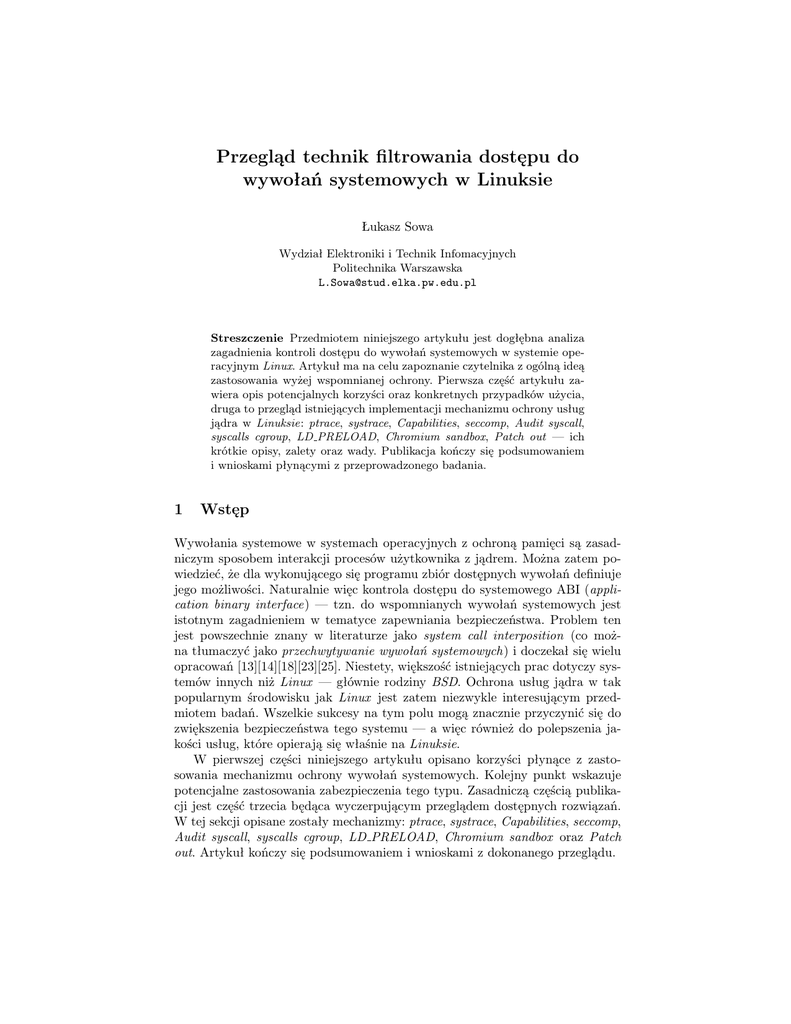 Przegląd technik filtrowania dostępu do wywołań systemowych w Linuksie Łukasz Sowa Wydział Elektroniki i Technik Infomacyjnych Politechnika Warszawska [email protected] Streszczenie Przedmiotem niniejszego artykułu jest dogłębna analiza zagadnienia kontroli dostępu do wywołań systemowych w systemie operacyjnym Linux. Artykuł ma na celu zapoznanie czytelnika z ogólną ideą zastosowania wyżej wspomnianej ochrony. Pierwsza część artykułu zawiera opis potencjalnych korzyści oraz konkretnych przypadków użycia, druga to przegląd istniejących implementacji mechanizmu ochrony usług jądra w Linuksie: ptrace, systrace, Capabilities, seccomp, Audit syscall, syscalls cgroup, LD PRELOAD, Chromium sandbox, Patch out — ich krótkie opisy, zalety oraz wady. Publikacja kończy się podsumowaniem i wnioskami płynącymi z przeprowadzonego badania. 1 Wstęp Wywołania systemowe w systemach operacyjnych z ochroną pamięci są zasadniczym sposobem interakcji procesów użytkownika z jądrem. Można zatem powiedzieć, że dla wykonującego się programu zbiór dostępnych wywołań definiuje jego możliwości. Naturalnie więc kontrola dostępu do systemowego ABI (application binary interface) — tzn. do wspomnianych wywołań systemowych jest istotnym zagadnieniem w tematyce zapewniania bezpieczeństwa. Problem ten jest powszechnie znany w literaturze jako system call interposition (co można tłumaczyć jako przechwytywanie wywołań systemowych) i doczekał się wielu opracowań [13][14][18][23][25]. Niestety, większość istniejących prac dotyczy systemów innych niż Linux — głównie rodziny BSD. Ochrona usług jądra w tak popularnym środowisku jak Linux jest zatem niezwykle interesującym przedmiotem badań. Wszelkie sukcesy na tym polu mogą znacznie przyczynić się do zwiększenia bezpieczeństwa tego systemu — a więc również do polepszenia jakości usług, które opierają się właśnie na Linuksie. W pierwszej części niniejszego artykułu opisano korzyści płynące z zastosowania mechanizmu ochrony wywołań systemowych. Kolejny punkt wskazuje potencjalne zastosowania zabezpieczenia tego typu. Zasadniczą częścią publikacji jest część trzecia będąca wyczerpującym przeglądem dostępnych rozwiązań. W tej sekcji opisane zostały mechanizmy: ptrace, systrace, Capabilities, seccomp, Audit syscall, syscalls cgroup, LD PRELOAD, Chromium sandbox oraz Patch out. Artykuł kończy się podsumowaniem i wnioskami z dokonanego przeglądu. 2 2 Korzyści Zabezpieczając system komputerowy, zakłada się, iż jądro sytemu operacyjnego jest oprogramowaniem zaufanym — starannie przetestowanym, a więc pozbawionym błędów. Odmiennie, jako niezaufane, traktuje się natomiast aplikacje użytkownika działające wewnątrz systemu. Procesy usługowe są często bardzo złożone, zdarza się także, że są one niedbale napisane czy też niedokładnie zweryfikowane. Te cechy sprzyjają obecności dużej liczby błędów w takim oprogramowaniu, co pociąga za sobą zagrożenie atakiem bądź destabilizacją systemu. Z tego powodu, znaczną część wysiłku wkłada się w zabezpieczenie przed błędami aplikacji, a nie przed błędami jądra systemu operacyjnego. Zastosowanie mechanizmu kontroli dostępu do systemowego ABI przynosi wiele korzyści. Ograniczenie zbioru dostępnych wywołań systemowych daje możliwość ścisłej kontroli nad tym, co dany proces może w systemie. Jądro systemu Linux udostępnia dużą liczbę (w wersji 3.6, dla architektury x86-64 jest ich ponad 300) dobrze zdefiniowanych wywołań. Możliwe jest zatem łatwe określenie minimalnego, wystarczającego zbioru usług systemowych dla wskazanego procesu. Gdyby ziarnistość wywołań systemowych Linuksa była mała — tzn. ABI zawierałoby niewiele funkcji, które spełniałyby wiele ról — mechanizm kontroli dostępu do usług systemowych byłby nieefektywny, gdyż zezwolenie na pewną część zbioru wywołań, dawałoby o wiele więcej możliwości, niż rzeczywiście byłoby potrzebnych. Właściwe zastosowanie opisywanego mechanizmu zapewnia więc działanie w myśl zasady najmniejszego uprzywilejowania — mniej dostępnych funkcji pociąga za sobą mniej potencjalnych szkód po udanym ataku. Jednym z najczęściej występujących błędów w aplikacjach użytkowych jest przepełnienie bufora (ang. buffer overflow ). Wykorzystanie takiej podatności pozwala atakującemu zmodyfikować standardową, prawidłową ścieżkę wykonania programu — intruz może zmienić lub wstrzyknąć dodatkowy kod do wykonującego się programu. Atakujący ma więc możliwość wykonania dowolnych instrukcji z prawami użytkownika, do którego należy atakowany proces. Szkody wyrządzone na skutek istnienia błędów przepełnienia bufora mogą być więc większe, jeśli program wykonuje się z uprawnieniami roota lub ustawionym bitem SUID. Przykładami typowych aplikacji działających w wielu systemach, z wyżej wymienionymi uprawnieniami mogą być odpowiednio — XServer oraz sendmail. Zastosowanie mechanizmu kontroli dostępu do wywołań systemowych pozwala znacząco złagodzić skutki ataku tego typu. Odpowiednie wydzielenie dostępnych dla procesu usług może ograniczyć lub nawet uniemożliwić wyrządzenie jakichkolwiek szkód. Przykładowo, administrator może zabronić procesowi uruchamiania innych programów, bądź tworzenia procesów potomnych (wzbronienie dostępu do wywołań fork(), vfork(), clone(), execve()) — utrudnia to działania atakującego i uniemożliwa wykonanie ataku DoS (ang. Denial of Service) przy użyciu techniki fork bomb. Innym sensownym działaniem może być np. uniemożliwienie zmiany użytkownika (zabronienie setuid() i pokrewnych) czy powstrzymanie zmian praw dostępu i własności plików (wstrzymanie wywołań chmod(), chown() i ich odmian). 3 Kolejnym zastosowaniem mechanizmu kontroli dostępu do wywołań systemowych jest stworzenie dla procesu 