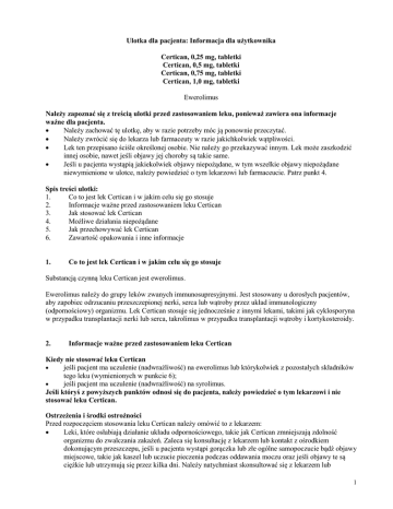 Ulotka dla pacjenta: Informacja dla użytkownika Certican, 0,25 mg, tabletki Certican, 0,5 mg, tabletki Certican, 0,75 mg, tabletki Certican, 1,0 mg, tabletki Ewerolimus Należy zapoznać się z treścią ulotki przed zastosowaniem leku, ponieważ zawiera ona informacje ważne dla pacjenta. Należy zachować tę ulotkę, aby w razie potrzeby móc ją ponownie przeczytać. Należy zwrócić się do lekarza lub farmaceuty w razie jakichkolwiek wątpliwości. Lek ten przepisano ściśle określonej osobie. Nie należy go przekazywać innym. Lek może zaszkodzić innej osobie, nawet jeśli objawy jej choroby są takie same. Jeśli u pacjenta wystąpią jakiekolwiek objawy niepożądane, w tym wszelkie objawy niepożądane niewymienione w ulotce, należy powiedzieć o tym lekarzowi lub farmaceucie. Patrz punkt 4. Spis treści ulotki: 1. Co to jest lek Certican i w jakim celu się go stosuje 2. Informacje ważne przed zastosowaniem leku Certican 3. Jak stosować lek Certican 4. Możliwe działania niepożądane 5. Jak przechowywać lek Certican 6. Zawartość opakowania i inne informacje 1. Co to jest lek Certican i w jakim celu się go stosuje Substancją czynną leku Certican jest ewerolimus. Ewerolimus należy do grupy leków zwanych immunosupresyjnymi. Jest stosowany u dorosłych pacjentów, aby zapobiec odrzucaniu przeszczepionej nerki, serca lub wątroby przez układ immunologiczny (odpornościowy) organizmu. Lek Certican stosuje się jednocześnie z innymi lekami, takimi jak cyklosporyna w przypadku transplantacji nerki lub serca, takrolimus w przypadku transplantacji wątroby i kortykosteroidy. 2. Informacje ważne przed zastosowaniem leku Certican Kiedy nie stosować leku Certican jeśli pacjent ma uczulenie (nadwrażliwość) na ewerolimus lub którykolwiek z pozostałych składników tego leku (wymienionych w punkcie 6); jeśli pacjent ma uczulenie (nadwrażliwość) na syrolimus. Jeśli któryś z powyższych punktów odnosi się do pacjenta, należy powiedzieć o tym lekarzowi i nie stosować leku Certican. Ostrzeżenia i środki ostrożności Przed rozpoczęciem stosowania leku Certican należy omówić to z lekarzem: Leki, które osłabiają działanie układu odpornościowego, takie jak Certican zmniejszają zdolność organizmu do zwalczania zakażeń. Zaleca się konsultację z lekarzem lub kontakt z ośrodkiem dokonującym przeszczepu, jeśli u pacjenta wystąpi gorączka lub złe ogólne samopoczucie bądź objawy miejscowe, takie jak kaszel lub uczucie pieczenia podczas oddawania moczu oraz jeśli objawy te są ciężkie lub utrzymują się przez kilka dni. Należy natychmiast skonsultować się z lekarzem lub 1 z ośrodkiem dokonującym przeszczepu, jeśli u pacjenta wystąpią objawy splątania, zaburzenia mowy, utrata pamięci, ból głowy, zaburzenia widzenia lub napady padaczkowych, ponieważ mogą to być objawy rzadkiej, ale bardzo poważnej choroby zwanej postępującą wieloogniskową leukoencefalopatią(PML). Jeśli pacjent przeszedł w ostatnim czasie poważną operację lub jeśli nadal ma niewygojoną ranę pooperacyjną, Certican może zwiększać ryzyko problemów z gojeniem się rany. Leki, które osłabiają działanie układu odpornościowego, takie jak Certican zwiększają ryzyko rozwoju nowotworów złośliwych, szczególnie skóry i układu chłonnego. Dlatego należy ograniczyć ekspozycję na światło słoneczne i promieniowanie ultrafioletowe (UV) zakładając odpowiednie ubranie ochronne i często używając kremów z filtrem przeciwsłonecznym o wysokim wskaźniku ochrony. Lekarz będzie dokładnie kontrolował pracę nerek, stężenie tłuszczów (lipidów) i cukru we krwi pacjenta oraz ilość białka w moczu. Jeśli pacjent ma zaburzenia czynności wątroby lub przebył wcześniej chorobę, która mogła zaburzyć czynność wątroby, należy poinformować o tym lekarza, ponieważ może to oznaczać konieczność zmiany dawki przyjmowanego leku Certican. Jeśli pacjent ma objawy dotyczące układu oddechowego (np. kaszel, trudności w oddychaniu i świszczący oddech), należy poinformować o tym lekarza. Lekarz rozważy czy i jak kontynuować leczenie lekiem Certican oraz czy konieczne jest zastosowanie innych leków. Lek Certican może zmniejszać wytwarzanie nasienia u mężczyzn i przez to zmniejszać płodność. Działanie to jest na ogół odwracalne. Mężczyźni planujący ojcostwo powinni porozmawiać o leczeniu ze swoim lekarzem. Pacjenci w podeszłym wieku (65 lat i starsi) Istnieje ograniczone doświadczenie ze stosowaniem leku Certican u pacjentów w podeszłym wieku. Dzieci i młodzież (młodsi niż 18 lat) Lek Certican nie jest zalecany do stosowania u dzieci i młodzieży, będących biorcami przeszczepu nerki, ponieważ brak wystarczającego doświadczenia w stosowaniu leku Certican w tej grupie wiekowej. Leku Certican nie należy stosować u dzieci i młodzieży, będących biorcami przeszczepu wątroby. Lek Certican a inne leki Należy powiedzieć lekarzowi o wszystkich lekach przyjmowanych przez pacjenta obecnie lub ostatnio, a także o lekach, które pacjent planuje przyjmować również tych, które wydawane są bez recepty. Pewne leki mogą wpływać na sposób działania leku Certican na organizm. Jest bardzo ważne, aby powiedzieć lekarzowi, jeśli pacjent przyjmuje którykolwiek z następujących leków: leki immunosupresyjne inne niż cyklosporyna, takrolimus lub kortykosteroidy; antybiotyki, takie jak ryfampicyna, ryfabutyna, klarytromycyna, erytromycyna lub telitromycyna; leki przeciwwirusowe, takie jak rytonawir, efawirenz, newirapina, nelfinawir, indynawir lub amprenawir, które stosuje się w leczeniu zakażenia wirusem HIV; leki stosowane w leczeniu zakażeń grzybiczych, takie jak worykonazol, flukonazol, ketokonazol lub itrakonazol; leki stosowane w leczeniu padaczki, takie jak fenytoina, fenobarbital lub karbamazepina; leki stosowane w leczeniu wysokiego ciśnienia krwi lub chorób serca, takie jak werap