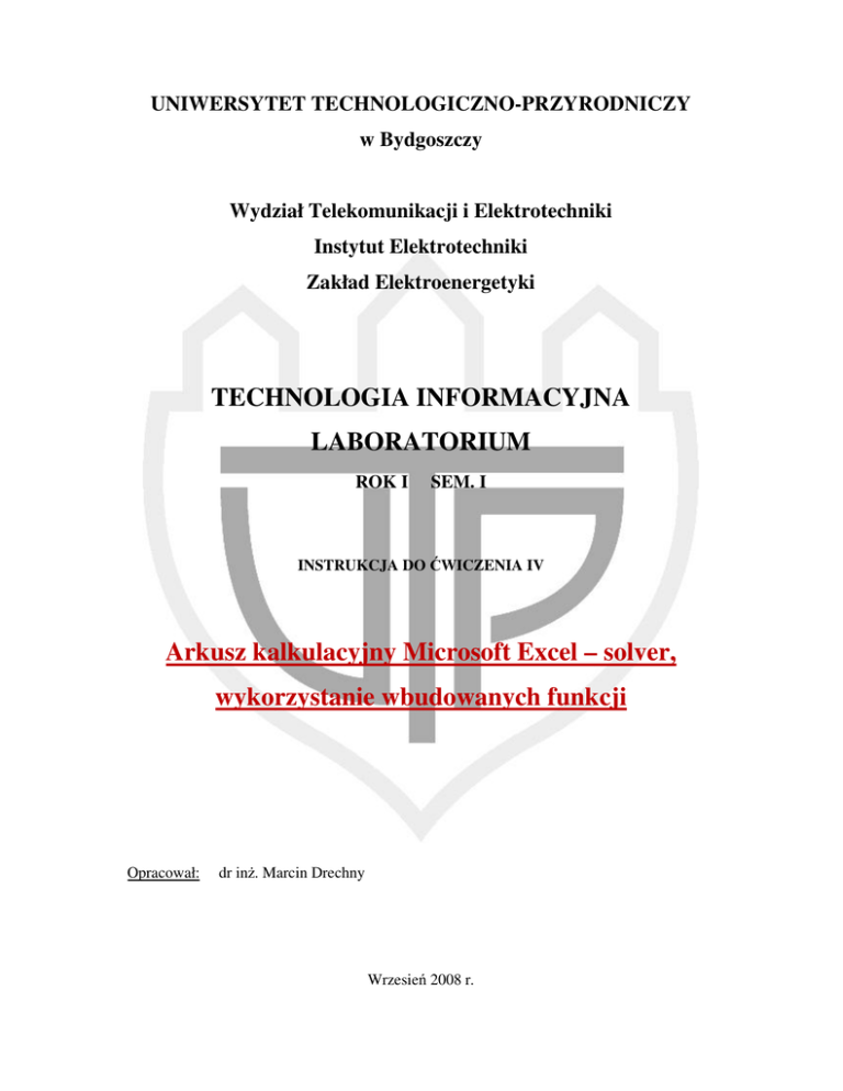 UNIWERSYTET TECHNOLOGICZNO-PRZYRODNICZY w Bydgoszczy Wydział Telekomunikacji i Elektrotechniki Instytut Elektrotechniki Zakład Elektroenergetyki TECHNOLOGIA INFORMACYJNA LABORATORIUM ROK I SEM. I INSTRUKCJA DO ĆWICZENIA IV Arkusz kalkulacyjny Microsoft Excel – solver, wykorzystanie wbudowanych funkcji Opracował: dr inż. Marcin Drechny Wrzesień 2008 r. 2 1. Cel ćwiczenia Celem tego ćwiczenia jest poznanie i utrwalenie wiadomości związanych z arkuszem kalkulacyjnym Excel 97/2000, a w szczególności wykorzystaniu wbudowanych podstawowych funkcji oraz narzędzia optymalizującego o nazwie „solver”. 2. Wprowadzenie 2.1. Funkcje Excela Funkcja jest predefiniowaną formułą posiadającą nazwę, która pobiera wartość lub wartości (zwane argumentami funkcji) i zwraca wynik lub wyniki. Używając funkcji możemy znacznie uprościć i skrócić formułę, a nawet uzyskać informacje, których nie można zdobyć bez użycia funkcji. Jeżeli chcemy w formule zastosować funkcję musimy użyć odpowiedniej składni. FUNKCJA(Argument1; Argument2; ... ;ArgumentN) A oto kilka zasad używania funkcji: • Nazwa funkcji może być pisana dużymi lub małymi literami. Jeżeli napiszemy nazwę funkcji małymi literami, zostaną one zamienione na duże jeżeli nazwa funkcji jest prawidłowa. • Przed i za nawiasami nie powinno być spacji. • Jeżeli funkcja jest bezargumentowa po nazwie funkcji należy wpisać parę nawiasów. • Argumenty funkcji oddzielamy separatorami argumentów listy (średnikami). • Funkcja może nie posiadać argumentów, posiadać ich kilka, mieć ich zmienną ilość lub może zawierać argumenty opcjonalne. • Argumentami funkcji mogą być liczby, adresy, tekst, wartości logiczne, tablice, wartości błędu lub inne funkcje. • Gdy argumentem funkcji jest inna funkcja, formułę nazywamy zagnieżdżona. • Gdy funkcja znajduje się na początku formuły wstawiamy przed nią znak równości =. • Funkcje Microsoft Excel podzielone są na kategorie: finansowe, daty i czasu, matematyczne i trygonometryczne, statystyczne, wyszukiwania i adresu, bazy danych, tekstowe, logiczne, informacyjne i inżynierskie. 3 2.1.1. Podział funkcji ze względu na ilość argumentów Rodzaj funkcji Bez argumentowa Ze stałą liczbą argumentów Przykład data systemowa czas systemowy Notacja symboliczna DZIŚ() wyliczenie sinusa kąta SIN(arg) lub SIN(liczba|adres) MOD(arg1;arg2) lub MOD(liczba1|adres1;liczba2|a dres2) dzielenie z resztą suma Ze zmienną listą argumentów TERAZ() SUMA(arg1;arg2;...) lub wyliczenie SUMA(liczba1|adres1|zakres1 liczby ;...) największej MAX(arg1;arg2;...) lub MAX(liczba1|adres1|zakres1;. ..) wyliczenie średniej kwoty raty Z argumentami opcjonalnymi Tab. nr 1 Uwagi Nie wymaga żadnych argumentów, bo data systemowa (i czas) jest jedna. Pusta para nawiasów oznacza brak argumentów i wskazuje na funkcję arkusza (a nie np. na nazwę obszaru) Sinus wyliczany jest tylko dla jednego kąta. Poprzez arg rozumie się argument będący liczbą lub adresem komórki. W drugim zapisie znak [|] należy czytać "albo". Funkcja dzielenia z resztą zawsze wymaga dwóch argumentów: dzielnej i dzielnika Sumę można wyliczyć z bliżej nieokreślonej ilości komórek, obszarów czy liczb. Argumentem może tu być liczba, adres komórki lub zakres. Znak wielokropka oznacza powtarzanie się wcześniej przedstawionej sekwencji. Podobnie funkcja wyliczająca wartość maksymalną. Pierwsze trzy argumenty muszą wystąpić, ostatnie dwa mogą - a więc są opcjonalne. Takie dane, decydują o sposobie działania funkcji i jeśli nie zostaną podane funkcja przyjmie wartości domyślne (zerowe). PMT(stopa;liczba_rat;wa;wp;t yp) znaczenie argumentów - stopa - odsetki za okres; - liczba_rat - ilość okresów, - wa - wysokość pożyczki - wp - wartość w przyszłości, czyli kwota, której się nie spłaci - typ - sposób wyliczenia odsetek 0 - na końcu okresu 1 - na początku okresu Podział funkcji ze względu na ilość argumentów, zapis i przykłady 4 2.1.2. Wklejanie funkcji za pomocą palety formuł Wszystkich funkcji jakimi dysponuje Excel jest kilkaset. Każda z nich wymaga innej ilości i typów argumentów. Nie sposób zapamiętać wszystkich nazw i składni funkcji. Dlatego zamiast wpisywać funkcję z klawiatury możemy posłużyć się “Paletą formuł”. W ten sposób zautomatyzujemy (po części) wprowadzanie funkcji, gwarantując sobie tym samym poprawność wpisania nazwy funkcji, ich argumentów oraz odpowiednią ich kolejność. Wklejenie funkcji można rozpocząć od wciśnięcia przycisku “Wklej funkcję”, (rysunek 1) wybierając polecenie Wstaw|funkcja... lub wykorzystując przycisk “Edytuj formułę” . Wklejenie to przebiega w dwóch etapach: W pierwszym etapie pojawia się okienko dialogowe “Wklej funkcję”, w którym wybieramy kategorię i funkcję, która nas interesuje. Można tam znaleźć oprócz nazwy funkcji, jej krótki opis oraz listę argumentów. Rys. 1. Formularz wyboru funkcji W drugim etapie wyświetla się “Paleta formuł” (rysunek 2), na której definiujemy parametry wejściowe do wybranej funkcji ( komórki zmiennych oraz ich zakresy). W wyświetlanym okienku znajduje się również wszystko to może nam pomóc w prawidłowym skonstruowaniu funkcji: opis działania funkcji, opis i miejsce, w które można wstawić argumenty oraz wynik funkcji. Dostępna jest szczegółowa pomoc na temat tej funkcji po wciśnięciu przycisku formuł”. , znajdującego się w lewym dolnym rogu “Palety 5 . Rys. 2. Okienko „ Palety formuł” 2.1.2. Funkcje matematyczne, trygonometryczne, statystyczne Poniżej przedstawiono najczęściej używane funkcje matematyczne trygonometryczne i statystyczne wraz z krótkim opisem: KOMBINACJE(n; k) - oblicza ilość kombinacji k - elementowych ze zbioru n elementowego. LICZ.JEŻELI(zakres; kryteria) - Podaje liczbę komórek wewnątrz zakresu, które odpowiadają podanym kr