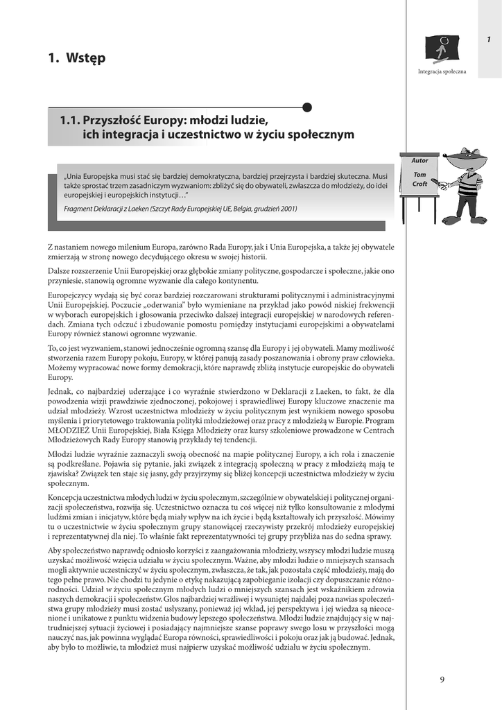 1 1. Wstęp Integracja społeczna 1.1. Przyszłość Europy: młodzi ludzie, ich integracja i uczestnictwo w życiu społecznym Autor „Unia Europejska musi stać się bardziej demokratyczna, bardziej przejrzysta i bardziej skuteczna. Musi także sprostać trzem zasadniczym wyzwaniom: zbliżyć się do obywateli, zwłaszcza do młodzieży, do idei europejskiej i europejskich instytucji…” Tom Croft Fragment Deklaracji z Laeken (Szczyt Rady Europejskiej UE, Belgia, grudzień 2001) Z nastaniem nowego milenium Europa, zarówno Rada Europy, jak i Unia Europejska, a także jej obywatele zmierzają w stronę nowego decydującego okresu w swojej historii. Dalsze rozszerzenie Unii Europejskiej oraz głębokie zmiany polityczne, gospodarcze i społeczne, jakie ono przyniesie, stanowią ogromne wyzwanie dla całego kontynentu. Europejczycy wydają się być coraz bardziej rozczarowani strukturami politycznymi i administracyjnymi Unii Europejskiej. Poczucie „oderwania” było wymieniane na przykład jako powód niskiej frekwencji w wyborach europejskich i głosowania przeciwko dalszej integracji europejskiej w narodowych referendach. Zmiana tych odczuć i zbudowanie pomostu pomiędzy instytucjami europejskimi a obywatelami Europy również stanowi ogromne wyzwanie. To, co jest wyzwaniem, stanowi jednocześnie ogromną szansę dla Europy i jej obywateli. Mamy możliwość stworzenia razem Europy pokoju, Europy, w której panują zasady poszanowania i obrony praw człowieka. Możemy wypracować nowe formy demokracji, które naprawdę zbliżą instytucje europejskie do obywateli Europy. Jednak, co najbardziej uderzające i co wyraźnie stwierdzono w Deklaracji z Laeken, to fakt, że dla powodzenia wizji prawdziwie zjednoczonej, pokojowej i sprawiedliwej Europy kluczowe znaczenie ma udział młodzieży. Wzrost uczestnictwa młodzieży w życiu politycznym jest wynikiem nowego sposobu myślenia i priorytetowego traktowania polityki młodzieżowej oraz pracy z młodzieżą w Europie. Program MŁODZIEŻ Unii Europejskiej, Biała Księga Młodzieży oraz kursy szkoleniowe prowadzone w Centrach Młodzieżowych Rady Europy stanowią przykłady tej tendencji. Młodzi ludzie wyraźnie zaznaczyli swoją obecność na mapie politycznej Europy, a ich rola i znaczenie są podkreślane. Pojawia się pytanie, jaki związek z integracją społeczną w pracy z młodzieżą mają te zjawiska? Związek ten staje się jasny, gdy przyjrzymy się bliżej koncepcji uczestnictwa młodzieży w życiu społecznym. Koncepcja uczestnictwa młodych ludzi w życiu społecznym, szczególnie w obywatelskiej i politycznej organizacji społeczeństwa, rozwija się. Uczestnictwo oznacza tu coś więcej niż tylko konsultowanie z młodymi ludźmi zmian i inicjatyw, które będą miały wpływ na ich życie i będą kształtowały ich przyszłość. Mówimy tu o uczestnictwie w życiu społecznym grupy stanowiącej rzeczywisty przekrój młodzieży europejskiej i reprezentatywnej dla niej. To właśnie fakt reprezentatywności tej grupy przybliża nas do sedna sprawy. Aby społeczeństwo naprawdę odniosło korzyści z zaangażowania młodzieży, wszyscy młodzi ludzie muszą uzyskać możliwość wzięcia udziału w życiu społecznym. Ważne, aby młodzi ludzie o mniejszych szansach mogli aktywnie uczestniczyć w życiu społecznym, zwłaszcza, że tak, jak pozostała część młodzieży, mają do tego pełne prawo. Nie chodzi tu jedynie o etykę nakazującą zapobieganie izolacji czy dopuszczanie różnorodności. Udział w życiu społecznym młodych ludzi o mniejszych szansach jest wskaźnikiem zdrowia naszych demokracji i społeczeństw. Głos najbardziej wrażliwej i wysuniętej najdalej poza nawias społeczeństwa grupy młodzieży musi zostać usłyszany, ponieważ jej wkład, jej perspektywa i jej wiedza są nieocenione i unikatowe z punktu widzenia budowy lepszego społeczeństwa. Młodzi ludzie znajdujący się w najtrudniejszej sytuacji życiowej i posiadający najmniejsze szanse poprawy swego losu w przyszłości mogą nauczyć nas, jak powinna wyglądać Europa równości, sprawiedliwości i pokoju oraz jak ją budować. Jednak, aby było to możliwie, ta młodzież musi najpierw uzyskać możliwość udziału w życiu społecznym. 9 1 Integracja społeczna Doświadczenie i wiedza ludzi żyjących w izolacji społecznej mogą nam bezpośrednio pomóc zrozumieć przyczyny tego odosobnienia. A są one złożone i często trudno je pojąć osobie z zewnątrz. Młodzi ludzie żyjący w najtrudniejszych warunkach mówią nam, że chcą mieć możliwość poznawania innych w atmosferze przyjaźni, wzajemnego wsparcia i bezpieczeństwa. Mówią nam również, jak wiele znaczy dla nich możliwość zjednoczenia się z rówieśnikami w normalnych dążeniach i udziału w zajęciach dostępnych dla młodych ludzi, takich jak sport, praca społeczna czy zajęcia kulturalne. W dużej mierze w wyniku takiej właśnie integracji młodzi ludzie mogą dyskutować i dzielić się swoimi poglądami na sprawy, które ich dotyczą. Odnosi się to do młodzieży w ogóle, ale szczególnie tej o najmniejszych szansach. Praca z młodzieżą odgrywa kluczową rolę w procesie docierania do młodych ludzi, którzy doświadczają izolacji w codziennym życiu i zbliżania ich do siebie. Prawdą jest, że istnieje wiele innych czynników, które mogą przyczynić się do społecznej integracji, takich jak ich umiejętności i atuty, jednak w wypadku osób o najmniejszych szansach, praca z młodzieżą i działalność organizacji młodzieżowych może być głównym narzędziem takiej integracji. Jeśli pracownicy młodzieżowi i organizacje młodzieżowe nie potrafią dotrzeć i doprowadzić do integracji młodych ludzi o najmniejszych szansach w ramach swojej działalności, to gdzie indziej młodzież ta skorzysta z nieformalnych doświadczeń edukacyjnych? (Zob. 5. Edukacja nieformalna jako narzędzie integracji). Jeśli nie w ten sposób