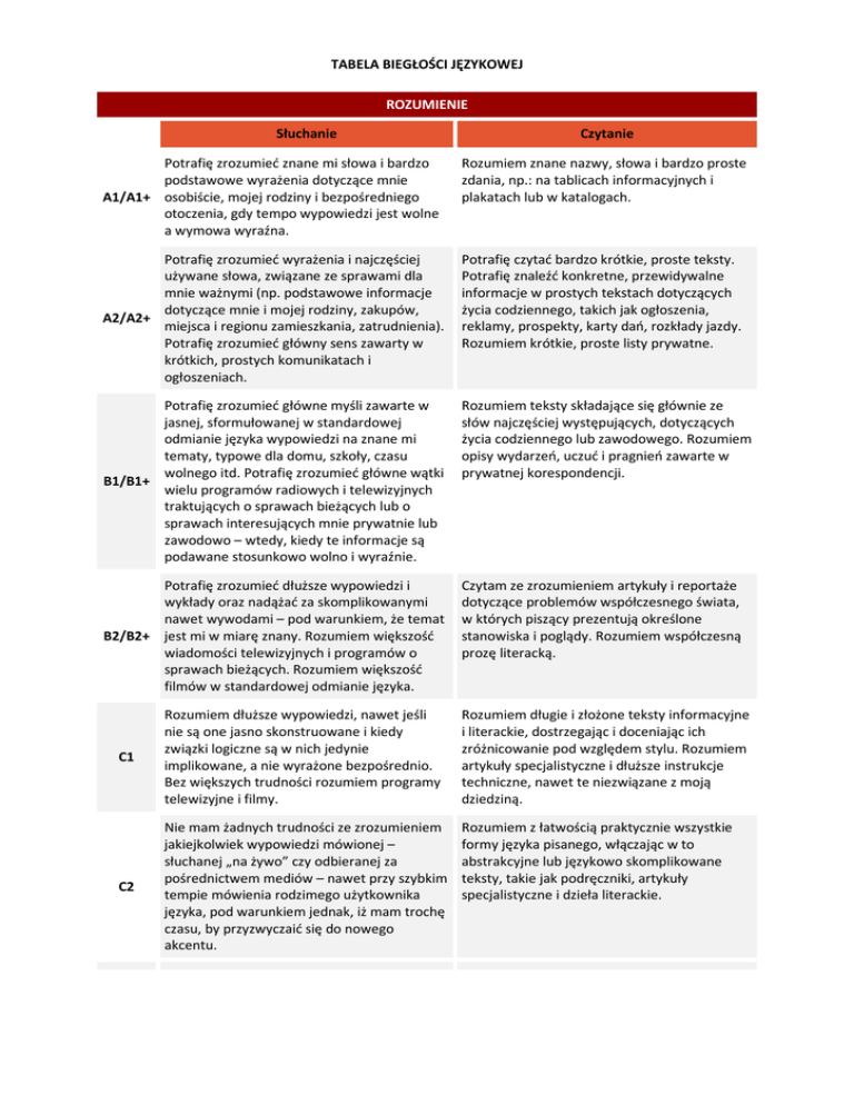 TABELA BIEGŁOŚCI JĘZYKOWEJ ROZUMIENIE Słuchanie Czytanie Potrafię zrozumieć znane mi słowa i bardzo podstawowe wyrażenia dotyczące mnie A1/A1+ osobiście, mojej rodziny i bezpośredniego otoczenia, gdy tempo wypowiedzi jest wolne a wymowa wyraźna. Rozumiem znane nazwy, słowa i bardzo proste zdania, np.: na tablicach informacyjnych i plakatach lub w katalogach. Potrafię zrozumieć wyrażenia i najczęściej używane słowa, związane ze sprawami dla mnie ważnymi (np. podstawowe informacje dotyczące mnie i mojej rodziny, zakupów, A2/A2+ miejsca i regionu zamieszkania, zatrudnienia). Potrafię zrozumieć główny sens zawarty w krótkich, prostych komunikatach i ogłoszeniach. Potrafię czytać bardzo krótkie, proste teksty. Potrafię znaleźć konkretne, przewidywalne informacje w prostych tekstach dotyczących życia codziennego, takich jak ogłoszenia, reklamy, prospekty, karty dań, rozkłady jazdy. Rozumiem krótkie, proste listy prywatne. Potrafię zrozumieć główne myśli zawarte w jasnej, sformułowanej w standardowej odmianie języka wypowiedzi na znane mi tematy, typowe dla domu, szkoły, czasu wolnego itd. Potrafię zrozumieć główne wątki B1/B1+ wielu programów radiowych i telewizyjnych traktujących o sprawach bieżących lub o sprawach interesujących mnie prywatnie lub zawodowo – wtedy, kiedy te informacje są podawane stosunkowo wolno i wyraźnie. Rozumiem teksty składające się głównie ze słów najczęściej występujących, dotyczących życia codziennego lub zawodowego. Rozumiem opisy wydarzeń, uczuć i pragnień zawarte w prywatnej korespondencji. Potrafię zrozumieć dłuższe wypowiedzi i wykłady oraz nadążać za skomplikowanymi nawet wywodami – pod warunkiem, że temat B2/B2+ jest mi w miarę znany. Rozumiem większość wiadomości telewizyjnych i programów o sprawach bieżących. Rozumiem większość filmów w standardowej odmianie języka. Czytam ze zrozumieniem artykuły i reportaże dotyczące problemów współczesnego świata, w których piszący prezentują określone stanowiska i poglądy. Rozumiem współczesną prozę literacką. C1 Rozumiem dłuższe wypowiedzi, nawet jeśli nie są one jasno skonstruowane i kiedy związki logiczne są w nich jedynie implikowane, a nie wyrażone bezpośrednio. Bez większych trudności rozumiem programy telewizyjne i filmy. Rozumiem długie i złożone teksty informacyjne i literackie, dostrzegając i doceniając ich zróżnicowanie pod względem stylu. Rozumiem artykuły specjalistyczne i dłuższe instrukcje techniczne, nawet te niezwiązane z moją dziedziną. C2 Nie mam żadnych trudności ze zrozumieniem jakiejkolwiek wypowiedzi mówionej – słuchanej „na żywo” czy odbieranej za pośrednictwem mediów – nawet przy szybkim tempie mówienia rodzimego użytkownika języka, pod warunkiem jednak, iż mam trochę czasu, by przyzwyczaić się do nowego akcentu. Rozumiem z łatwością praktycznie wszystkie formy języka pisanego, włączając w to abstrakcyjne lub językowo skomplikowane teksty, takie jak podręczniki, artykuły specjalistyczne i dzieła literackie. MÓWIENIE Porozumiewanie się Samodzielne wypowiadanie się Potrafię brać udział w rozmowie pod warunkiem, że rozmówca jest gotów powtarzać lub inaczej formułować swoje myśli, mówiąc wolniej oraz pomagając mi ująć A1/A1+ w słowa to, co usiłuję opowiedzieć. Potrafię formułować proste pytania dotyczące najlepiej mi znanych tematów lub najpotrzebniejszych spraw – i odpowiadać na tego typu pytania. Potrafię używać prostych wyrażeń i zdań, aby opisać miejsce, gdzie mieszkam oraz ludzi, których znam. Potrafię brać udział w zwykłej, typowej rozmowie wymagającej prostej i bezpośredniej wymiany informacji na znane A2/A2+ mi tematy. Potrafię sobie radzić w bardzo krótkich rozmowach towarzyskich, nawet jeśli nie rozumiem wystarczająco dużo, by samemu podtrzymać rozmowę. Potrafię posłużyć się ciągiem wyrażeń i zdań, by w prosty sposób opisać swoją rodzinę, innych ludzi, warunki życia, swoje wykształcenie, swoją obecną i poprzednią pracę. Potrafię sobie radzić w większości sytuacji, w których można się znaleźć w czasie podróży po kraju lub regionie, gdzie mówi się danym językiem. Potrafię - bez uprzedniego B1/B1+ przygotowania – włączać się do rozmów na znane mi tematy prywatne lub dotyczące życia codziennego (np. rodziny, zainteresowań, pracy, podróżowania i wydarzeń bieżących). Potrafię łączyć wyrażenia w prosty sposób, by opisywać przeżycia i zdarzenia, a także swoje marzenia, nadzieje i ambicje. Potrafię krótko uzasadniać i objaśniać własne poglądy i plany. Potrafię relacjonować wydarzenia i opowiadać przebieg akcji książek czy filmów, opisując własne reakcje i wrażenia. Potrafię się porozumiewać na tyle płynnie i spontanicznie, że mogę prowadzić dość swobodne rozmowy z rodzimymi B2/B2+ użytkownikami języka. Potrafię brać czynny udział w dyskusjach na znane mi tematy, przedstawiając swoje zdanie i broniąc swoich poglądów. Potrafię formułować przejrzyste, rozbudowane wypowiedzi na różne tematy związane z dziedzinami, które mnie interesują. Potrafię wyjaśnić swój punkt widzenia w danej kwestii oraz podać argumenty za i przeciw względem możliwych rozwiązań. C1 Potrafię się wypowiadać płynnie i spontanicznie, bez zbyt widocznego namyślania się w celu znalezienia właściwych sformułowań. Potrafię skutecznie porozumiewać się w kontaktach towarzyskich i sprawach zawodowych. Potrafię precyzyjnie formułować swoje myśli i poglądy, zręcznie nawiązując do wypowiedzi rozmówców. Potrafię formułować przejrzyste i szczegółowe wypowiedzi dotyczące skomplikowanych zagadnień, rozwijać w nich wybrane podtematy lub poszczególne kwestie i kończyć je odpowiednią konkluzją. C2 Potrafię bez żadnego wysiłku brać udział w każdej rozmowie czy dyskusji. Dobrze