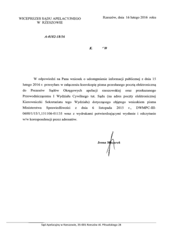 Rzeszów, dnia 16 lutego 2016 roku WICEPREZES SĄDU APELACYJNEGO W RZESZOWIE A-0182-18/16 K rW W odpowiedzi na Pana wniosek o udostępnienie informacji publicznej z dnia 15 lutego 2016 r. przesyłam w załączeniu kserokopię pisma przesłanego pocztą elektroniczną do Prezesów Sądów Okręgowych apelacji rzeszowskiej oraz przekazanego Przewodniczącemu I Wydziału Cywilnego tut. Sądu (na adres poczty elektronicznej Kierowniczki Sekretariatu tego Wydziału) dotyczącego objętego wnioskiem pisma Ministerstwa Sprawiedliwości z dnia 6 listopada 2015 r., DWMPC-III- 0600/1/15/1,151106-01135 wraz z wydrukami potwierdzającymi wysłanie i odczytanie w/w korespondencji przez adresatów. Sąd A p e la c y jn y w Rzeszow ie, 3 5 -0 0 1 R zeszów Al. Piłsudskiego 28 Rzeszów, dnia 12 listopada 2015 roku PREZES SĄDU APELACYJNEGO W RZESZOWIE A-41-17/15 (Pan <Prezes Sądu Okręgowego w <Rzeszoxvie, %fośnie, (Przemyślu, cIamo6rzegu W załączeniu przesyłam pismo Ministerstwa Sprawiedliwości z dnia 6 listopada 2015 r. nr DWMPC-III-0600-1/15/1 do wiadomości oraz stosownego wykorzystania. Jednocześnie proszę o przekazanie w/w pisma do podległych sądów rejonowych. Z poważaniem ; W1 Z6igniew ŚkigOłsfą -a zgodność z oryguim^. * * • Zastępca Ki Oddziału Admi. Maria Rzepka Temat: Załączniki: Sąd Apelacyjny w Rzeszowie [email protected]] 12 listopada 2015 13:23 '[email protected]'; '[email protected]'; '[email protected]'; '[email protected]' A-41-17/15 151112111618_0001.pdf; 151112111549_0001 .pdf; 151112132141_0001 .pdf Śledzenie: Adresat Odczyt '[email protected]' Czytaj: 2015-11-12 14:30 Od: Wysłano: Do: '[email protected]' '[email protected]' Czytaj: 2015-11-12 13:47 '[email protected]' Czytaj: 2015-11-12 14:49 Ewa Małecki - Sąd Okręgowy w Tarnobrzegu Czytaj: 2015-11-12 13:47 1 Maria Rzepka Od: Wysłano: Do: Temat: Załączniki: Maria Rzepka 12 listopada 2015 11:18 Maria Baryła A-41-17/15- SSA A. 151112111618_0001.pdf; 151112111549_0001.pdf Śledzenie: Adresat Maria Baryła Palacz Dostarczanie Odczyt Dostarczono: 2015-11-1211:18 1 Czytaj: 2015-11-1312:08