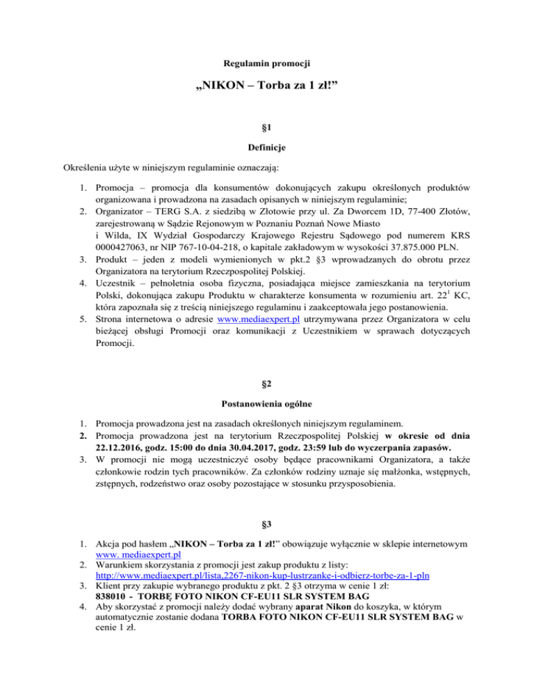 Regulamin promocji „NIKON – Torba za 1 zł!” §1 Definicje Określenia użyte w niniejszym regulaminie oznaczają: 1. Promocja – promocja dla konsumentów dokonujących zakupu określonych produktów organizowana i prowadzona na zasadach opisanych w niniejszym regulaminie; 2. Organizator – TERG S.A. z siedzibą w Złotowie przy ul. Za Dworcem 1D, 77-400 Złotów, zarejestrowaną w Sądzie Rejonowym w Poznaniu Poznań Nowe Miasto i Wilda, IX Wydział Gospodarczy Krajowego Rejestru Sądowego pod numerem KRS 0000427063, nr NIP 767-10-04-218, o kapitale zakładowym w wysokości 37.875.000 PLN. 3. Produkt – jeden z modeli wymienionych w pkt.2 §3 wprowadzanych do obrotu przez Organizatora na terytorium Rzeczpospolitej Polskiej. 4. Uczestnik – pełnoletnia osoba fizyczna, posiadająca miejsce zamieszkania na terytorium Polski, dokonująca zakupu Produktu w charakterze konsumenta w rozumieniu art. 221 KC, która zapoznała się z treścią niniejszego regulaminu i zaakceptowała jego postanowienia. 5. Strona internetowa o adresie www.mediaexpert.pl utrzymywana przez Organizatora w celu bieżącej obsługi Promocji oraz komunikacji z Uczestnikiem w sprawach dotyczących Promocji. §2 Postanowienia ogólne 1. Promocja prowadzona jest na zasadach określonych niniejszym regulaminem. 2. Promocja prowadzona jest na terytorium Rzeczpospolitej Polskiej w okresie od dnia 22.12.2016, godz. 15:00 do dnia 30.04.2017, godz. 23:59 lub do wyczerpania zapasów. 3. W promocji nie mogą uczestniczyć osoby będące pracownikami Organizatora, a także członkowie rodzin tych pracowników. Za członków rodziny uznaje się małżonka, wstępnych, zstępnych, rodzeństwo oraz osoby pozostające w stosunku przysposobienia. §3 1. Akcja pod hasłem „NIKON – Torba za 1 zł!” obowiązuje wyłącznie w sklepie internetowym www. mediaexpert.pl 2. Warunkiem skorzystania z promocji jest zakup produktu z listy: http://www.mediaexpert.pl/lista,2267-nikon-kup-lustrzanke-i-odbierz-torbe-za-1-pln 3. Klient przy zakupie wybranego produktu z pkt. 2 §3 otrzyma w cenie 1 zł: 838010 - TORBĘ FOTO NIKON CF-EU11 SLR SYSTEM BAG 4. Aby skorzystać z promocji należy dodać wybrany aparat Nikon do koszyka, w którym automatycznie zostanie dodana TORBA FOTO NIKON CF-EU11 SLR SYSTEM BAG w cenie 1 zł. 5. W przypadku zwrotu zakupionego produktu, zwrotowi podlega również produkt dodany, otrzymany wraz z produktem głównym. 6. W przypadku zakupu na raty w okresie obowiązywania akcji warunkiem skorzystania z aktualnych promocji ratalnych jest indywidualna ocena zdolności kredytowej Klienta przez bank. W przypadku negatywnej odpowiedzi banku na wniosek kredytowy Klienta zostaną zaproponowane inne alternatywne formy płatności. (Wysokość rat zaprezentowanych w akcji nie zawiera ubezpieczenia. RRSO dla kredytu w opcji bez ubezpieczenia wynosi 0%. Minimalna wartość brutto towaru nabywanego w systemie ratalnym wynosi 100zł. Ubezpieczenie spłaty kredytu ma charakter dobrowolny i stanowi zabezpieczenie pożyczki/kredytu w momencie zgody Klienta na zawarcie umowy ubezpieczenia kredytu. Stopa procentowa dla kredytu 0% w zakresie od 3 do 40 miesięcy wynosi od 0% do 32,6% w zależności od wybranego banku i rodzaju ubezpieczenia.) 7. Materiały reklamowe zaprezentowane na stronie www.mediaexpert.pl nie stanowią oferty w rozumieniu art.66§ 1K.C §4 Reklamacje 1. Reklamacje związane z Promocją mogą być zgłaszane mailowo na adres: [email protected]., przez cały czas trwania promocji, jednak nie później niż w terminie 21 dni od dnia jej zakończenia. 2. Reklamacje spóźnione nie będą rozpatrywane. Organizator rozpatruje reklamacje oraz przekazuje informacje zainteresowanemu w terminie do 14 (czternastu) dni od daty wpłynięcia reklamacji. Za przekazanie odpowiedzi na reklamację w terminie 14 uznaje się wysłanie listu poleconego w tym terminie. §5 Ochrona danych osobowych 1. Administratorem danych osobowych jest Organizator. 2. Dane osobowe Uczestników przetwarzane będą przy zachowaniu zasad określonych w ustawie z dnia 29 sierpnia 1997 r. o ochronie danych osobowych (Dz. U. 2002 Nr 101 poz. 926 z póź. zm.) w celu przeprowadzenia Promocji i wyłonienia osób nagrodzonych. Podanie danych osobowych jest dobrowolne, jednak jest niezbędne w celu wzięcia udziału w Promocji, przyznania i odbioru nagród i prezentów. Uczestnikowi przysługuje prawo wglądu do danych osobowych, ich poprawiania oraz żądania ich usunięcia. 3. Przetwarzanie danych osobowych obejmować będzie zakres danych wskazanych w formularzu rejestracyjnym. Za odrębną zgodą Uczestnika wyrażoną w zgłoszeniu Organizatorowi przysługiwać będzie prawo do przetwarzania danych osobowych w celach marketingowych oraz prawo przesyłania informacji handlowej drogą elektroniczną. 4. Uczestnik jest zobowiązany do informowania Organizatora na piśmie o każdej zmianie w zakresie danych osobowych. Niezależnie od innych postanowień niniejszego regulaminu, w przypadku nie dokonania aktualizacji danych osobowych przez Uczestnika Organizator nie ponosi odpowiedzialności za opóźnienie lub brak działania spowodowany brakiem takiej aktualizacji, a w szczególności za niemożność wydania nagrody w konkursie lub prezentu. §7 Postanowienia końcowe 1. Regulamin wchodzi w życie z dniem 22.12.2016 i będzie dostępny w okresie trwania Promocji w siedzibie Organizatora oraz na Stronie internetowej: http://www.mediaexpert.pl/lp,2267-nikon-kup-lustrzanke-i-odbierz-torbe-za-1-pln 2. Tytuły poszczególnych punktów regulaminu mają charakter informacyjny i nie stanowią części regulaminu. 3. We wszystkich sprawach dotyczących Promocji, a nieuregulowanych regulaminem mają zastosowanie przepisy prawa polskiego. 4. Niniejsza Promocja nie jest grą losową ani zakładem wzajemnym, których wynik zależy od przypadku (przeprowadzenie losowania) w rozumieniu art. 2 ustawy z dnia 19 listopada 2009 roku o grach hazardowych (Dz. U. Nr 201 poz.