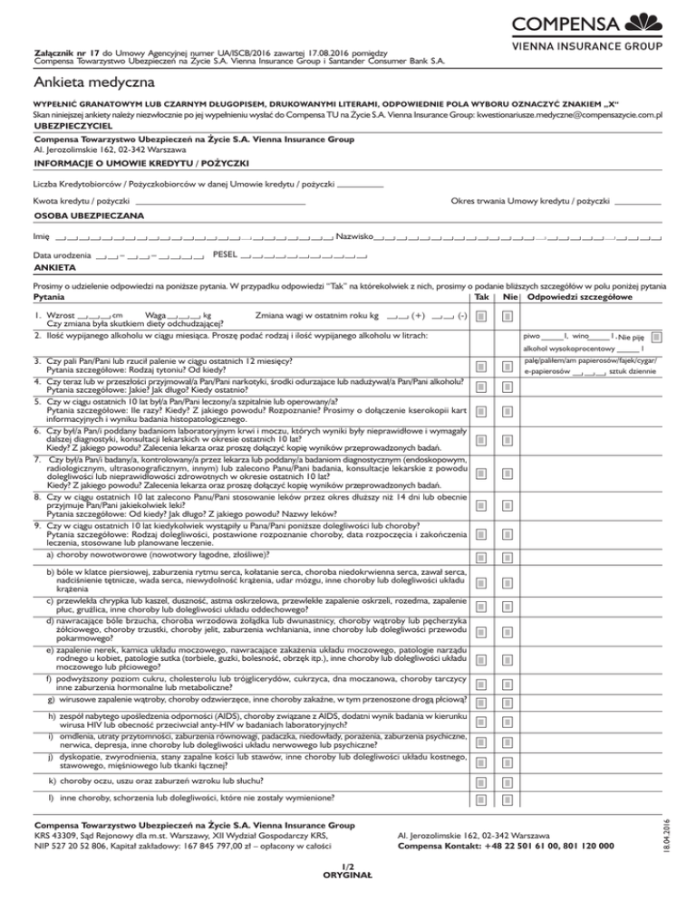 Załącznik nr 9 do Umowy ubezpieczenia zawartej 30.03.2015 r. pomiędzy Compensa Towarzystwo Ubezpieczeń na Życie S.A. Vienna Insurance Group i Santander Consumer Bank S.A., polisa nr 8401500007 Ankieta medyczna Załącznik nr 9 do Umowy ubezpieczenia zawartej 30.03.2015 r. pomiędzy Compensa Towarzystwo Załącznik nr 17 do Umowy Agencyjnej numer UA/ISCB/2016 zawartej 17.08.2016 pomiędzy Ubezpieczeń na Życie S.A. Vienna Insurance Group Santander Consumer S.A., polisa nr 8401500007 Compensa Towarzystwo Ubezpieczeń na Życie S.A. iVienna Insurance GroupBank i Santander Consumer Bank S.A. WYPE¸NIĆ GRANATOWYM LUB CZARNYM D¸UGOPISEM, DRUKOWANYMI LITERAMI, ODPOWIEDNIE POLA WYBORU OZNACZYĆ ZNAKIEM „X“ Skan niniejszej ankiety należy niezwłocznie po jej wypełnieniu wysłać do Compensa TU na Życie S.A. Vienna Insurance Group: [email protected] UBEZPIECZYCIEL Ankieta medyczna Compensa GRANATOWYM Towarzystwo Ubezpieczeń na Życie S.A. Vienna Insurance Group WYPE¸NIĆ LUB CZARNYM D¸UGOPISEM, DRUKOWANYMI LITERAMI, ODPOWIEDNIE POLA WYBORU OZNACZYĆ ZNAKIEM „X“ Al. Jerozolimskie 162,należy 02-342 Warszawapo jej wypełnieniu wysłać do Compensa TU na Życie S.A. Vienna Insurance Group: [email protected] Skan niniejszej ankiety niezwłocznie UBEZPIECZYCIEL UBEZPIECZAJĄCY Compensa Consumer Towarzystwo Ubezpieczeń na Życie S.A. Vienna Insurance Group Santander Bank S.A. Al. Strzegomska Jerozolimskie42c, 162,53-611 02-342Wrocław Warszawa ul. UBEZPIECZAJĄCY INFORMACJE O UMOWIE KREDYTU / POŻYCZKI Santander Consumer Bank S.A. Liczba Kredytobiorców / Pożyczkobiorców w danej Umowie kredytu / pożyczki ul. Strzegomska 42c, 53-611 Wrocław Kwota kredytu / O pożyczki INFORMACJE UMOWIE KREDYTU / POŻYCZKI Okres trwania Umowy kredytu / pożyczki OSOBA UBEZPIECZANA Liczba Kredytobiorców / Pożyczkobiorców w danej Umowie kredytu / pożyczki Imię kredytu / pożyczki Kwota Nazwisko Okres trwania Umowy kredytu / pożyczki OSOBA UBEZPIECZANA PESEL Data urodzenia ANKIETA Imię Nazwisko Prosimy o udzielenie odpowiedzi na poniższe pytania. W przypadku odpowiedzi “Tak” na którekolwiek z nich, prosimy o podanie bliższych szczegó∏ów w polu poniżej pytania PESEL Data urodzenia Pytania Tak Nie Odpowiedzi szczegółowe ANKIETA cm kg 1. Wzrost Waga Zmiana wagi w ostatnim roku kg (+) (-) Prosimy o udzielenie odpowiedzi na poniższe pytania. W przypadku odpowiedzi “Tak” na którekolwiek z nich, prosimy o podanie bliższych szczegó∏ów w polu poniżej pytania Czy zmiana była skutkiem diety odchudzającej? Pytania Tak Nie piwo Odpowiedzi szczegółowe 2. Ilość wypijanego alkoholu w ciągu miesiąca. Proszę podać rodzaj i ilość wypijanego alkoholu w litrach: l, wino l , Nie piję alkohol wysokoprocentowy l cm kg Wzrost Waga Zmiana wagi w ostatnim roku kg (+) (-) palę/pali∏em/am papierosów/fajek/cygar/ Czy pali Pan/Pani lub rzuci∏diety palenie w ciągu ostatnich 12 miesięcy? zmiana była skutkiem odchudzającej? Pytania szczegó∏owe: Rodzaj tytoniu? Od kiedy? e-papierosów sztuk Ilość wypijanego alkoholu w ciągu miesiąca. Proszę podać rodzaj i ilość wypijanego alkoholu w litrach: piwo l, wino l , Niedziennie piję Czy teraz lub w przesz∏ości przyjmowa∏/a Pan/Pani narkotyki, środki odurzajace lub nadużywa∏/a Pan/Pani alkoholu? alkohol wysokoprocentowy l Pytania szczegó∏owe: Jakie? Jak d∏ugo? Kiedy ostatnio? palę/pali∏em/am papierosów/fajek/cygar/ 3. Czy pali Pan/Pani lub rzuci∏ palenie w ciągu ostatnich 12 miesięcy? 5. Czy w ciągu ostatnich 10 lat by∏/a Pan/Pani leczony/a szpitalnie lub operowany/a? Pytania tytoniu? kiedy? powodu? Rozpoznanie? Prosimy o do∏ączenie kserokopii kart e-papierosów sztuk dziennie szczegó∏owe: Rodzaj Ile razy? Kiedy?Od Z jakiego Pytania szczegó∏owe: 4. informacyjnych Czy teraz lub w iprzesz∏ości wyniku badania przyjmowa∏/a histopatologicznego. Pan/Pani narkotyki, środki odurzajace lub nadużywa∏/a Pan/Pani alkoholu? Pytania szczegó∏owe: Jakie? Jak d∏ugo? Kiedy ostatnio? 6. Czy był/a Pan/i poddany badaniom laboratoryjnym krwi i moczu, których wyniki były nieprawidłowe i wymagały 5. dalszej Czy w ciągu diagnostyki, ostatnich konsultacji 10 lat by∏/a lekarskich Pan/Pani leczony/a w okresieszpitalnie ostatnichlub 10operowany/a? lat? Kiedy? PytaniaZszczegó∏owe: jakiego powodu? Ile Zalecenia razy? Kiedy? lekarza Z jakiego oraz proszę powodu? dołączyć Rozpoznanie? kopię wyników Prosimy przeprowadzonych o do∏ączenie kserokopii badań. kart i wyniku badania histopatologicznego. 7. informacyjnych Czy był/a Pan/i badany/a, kontrolowany/a przez lekarza lub poddany/a badaniom diagnostycznym (endoskopowym, 6. Czy radiologicznym, był/a Pan/i poddany ultrasonograficznym, badaniom laboratoryjnym innym) lub zalecono krwi i moczu, Panu/Pani których badania, wynikikonsultacje były nieprawidłowe lekarskiei zwymagały powodu dalszej dolegliwości diagnostyki, lub nieprawidłowości konsultacji lekarskich zdrowotnych w okresie w okresie ostatnich ostatnich 10 lat? 10 lat? Kiedy? Z jakiego powodu? Zalecenia lekarza oraz proszę dołączyć kopię wyników przeprowadzonych badań. 8. 7. Czy Czy w był/a ciągu Pan/i ostatnich badany/a, 10kontrolowany/a lat zalecono Panu/Pani przez lekarza stosowanie lub poddany/a leków przez badaniom okres diagnostycznym d∏uższy niż 14(endoskopowym, dni lub obecnie przyjmuje radiologicznym, Pan/Pani ultrasonograficznym, jakiekolwiek leki? innym) lub zalecono Panu/Pani badania, konsultacje lekarskie z powodu Pytania dolegliwości szczegó∏owe: lub nieprawidłowości Od kiedy? Jakzdrowotnych d∏ugo? Z jakiego w okresie powodu? ostatnich Nazwy10 leków? lat? jakiego powodu? Zalecenia lekarzawystąpi∏y oraz proszę dołączyć kopię wyników przeprowadzonych 9. Kiedy? Czy w Z ciągu ostatnich 10 lat kiedykolwiek u Pana/Pani poniższe dolegliwości lub choroby?badań. 8. Pytania Czy w ciągu szczegó∏owe: ostatnich Rodzaj 10 lat zalecono dol