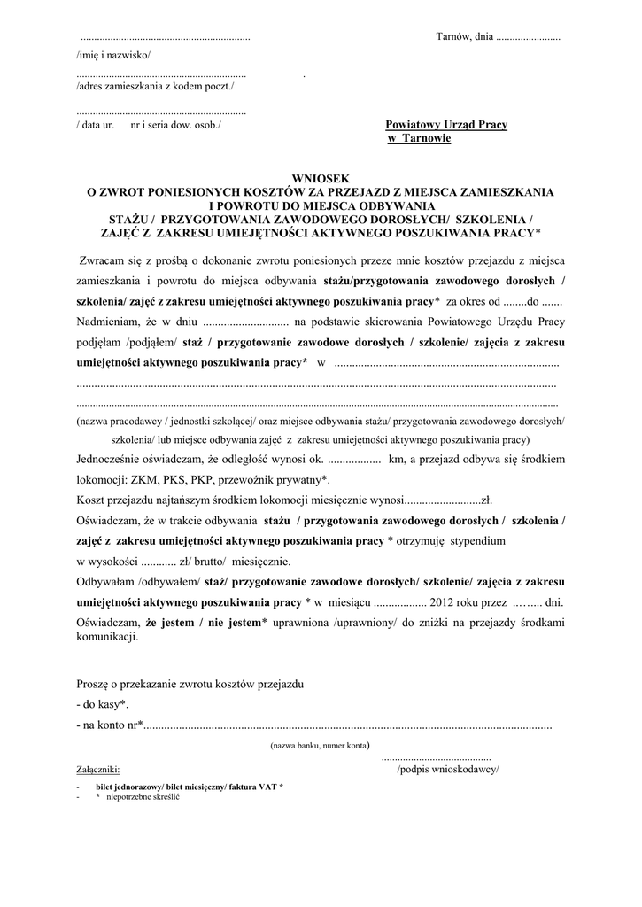 Tarnów, dnia ........................ ............................................................... /imię i nazwisko/ ............................................................... /adres zamieszkania z kodem poczt./ . ............................................................... / data ur. nr i seria dow. osob./ Powiatowy Urząd Pracy w Tarnowie WNIOSEK O ZWROT PONIESIONYCH KOSZTÓW ZA PRZEJAZD Z MIEJSCA ZAMIESZKANIA I POWROTU DO MIEJSCA ODBYWANIA STAŻU / PRZYGOTOWANIA ZAWODOWEGO DOROSŁYCH/ SZKOLENIA / ZAJĘĆ Z ZAKRESU UMIEJĘTNOŚCI AKTYWNEGO POSZUKIWANIA PRACY* Zwracam się z prośbą o dokonanie zwrotu poniesionych przeze mnie kosztów przejazdu z miejsca zamieszkania i powrotu do miejsca odbywania stażu/przygotowania zawodowego dorosłych / szkolenia/ zajęć z zakresu umiejętności aktywnego poszukiwania pracy* za okres od ........do ....... Nadmieniam, że w dniu ............................. na podstawie skierowania Powiatowego Urzędu Pracy podjęłam /podjąłem/ staż / przygotowanie zawodowe dorosłych / szkolenie/ zajęcia z zakresu umiejętności aktywnego poszukiwania pracy* w ............................................................................ .................................................................................................................................................................. ................................................................................................................................................................................... (nazwa pracodawcy / jednostki szkolącej/ oraz miejsce odbywania stażu/ przygotowania zawodowego dorosłych/ szkolenia/ lub miejsce odbywania zajęć z zakresu umiejętności aktywnego poszukiwania pracy) Jednocześnie oświadczam, że odległość wynosi ok. .................. km, a przejazd odbywa się środkiem lokomocji: ZKM, PKS, PKP, przewoźnik prywatny*. Koszt przejazdu najtańszym środkiem lokomocji miesięcznie wynosi..........................zł. Oświadczam, że w trakcie odbywania stażu / przygotowania zawodowego dorosłych / szkolenia / zajęć z zakresu umiejętności aktywnego poszukiwania pracy * otrzymuję stypendium w wysokości ............ zł/ brutto/ miesięcznie. Odbywałam /odbywałem/ staż/ przygotowanie zawodowe dorosłych/ szkolenie/ zajęcia z zakresu umiejętności aktywnego poszukiwania pracy * w miesiącu .................. 2012 roku przez ..….... dni. Oświadczam, że jestem / nie jestem* uprawniona /uprawniony/ do zniżki na przejazdy środkami komunikacji. Proszę o przekazanie zwrotu kosztów przejazdu - do kasy*. - na konto nr*.......................................................................................................................................... (nazwa banku, numer konta) Załączniki: - bilet jednorazowy/ bilet miesięczny/ faktura VAT * * niepotrzebne skreślić ......................................... /podpis wnioskodawcy/ /wypełnia pracownik PUP/ ROZLICZENIE faktycznie poniesionych kosztów za przejazd z miejsca zamieszkania i powrotu do miejsca odbywania stażu/ przygotowania zawodowego dorosłych / szkolenia / zajęć z zakresu umiejętności aktywnego poszukiwania pracy * w miesiącu........................... 2012 r. ....................................................................................................................................................... ....................................................................................................................................................... ....................................................................................................................................................... ....................................................................................................................................................... ....................................................................................................................................................... ....................................................................................................................................................... ....................................................................................................................................................... ....................................................................................................................................................... ....................................................................................................................................................... ....................................................................................................................................................... ....................................................................................................................................................... ....................................................................................................................................................... ....................................................................................................................................................... ....................................................................................................................................................... ....................................................................................................................................................... ....................................................................................................................................................... ....................................................................................................................................................... ....................................................................................................................................................... .......