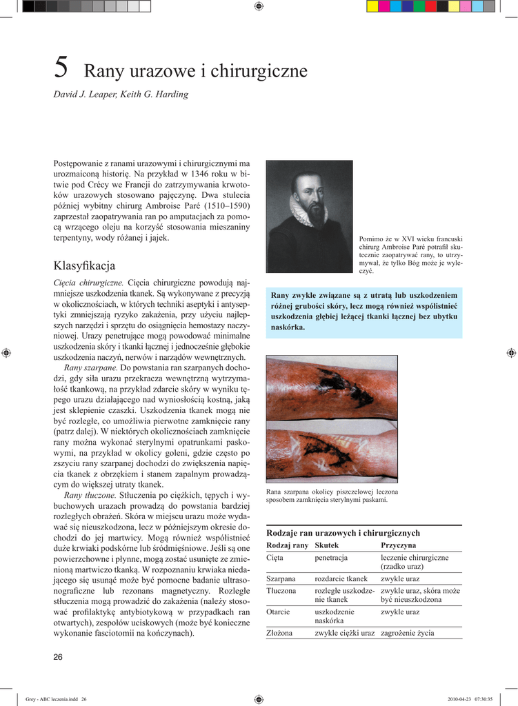 ABC Leczenie ran w praktyce 5 Rany urazowe i chirurgiczne David J. Leaper, Keith G. Harding Postępowanie z ranami urazowymi i chirurgicznymi ma urozmaiconą historię. Na przykład w 1346 roku w bitwie pod Crécy we Francji do zatrzymywania krwotoków urazowych stosowano pajęczynę. Dwa stulecia później wybitny chirurg Ambroise Paré (1510–1590) zaprzestał zaopatrywania ran po amputacjach za pomocą wrzącego oleju na korzyść stosowania mieszaniny terpentyny, wody różanej i jajek. Pomimo że w XVI wieku francuski chirurg Ambroise Paré potrafił skutecznie zaopatrywać rany, to utrzymywał, że tylko Bóg może je wyleczyć. Klasyfikacja Cięcia chirurgiczne. Cięcia chirurgiczne powodują najmniejsze uszkodzenia tkanek. Są wykonywane z precyzją w okolicznościach, w których techniki aseptyki i antyseptyki zmniejszają ryzyko zakażenia, przy użyciu najlepszych narzędzi i sprzętu do osiągnięcia hemostazy naczyniowej. Urazy penetrujące mogą powodować minimalne uszkodzenia skóry i tkanki łącznej i jednocześnie głębokie uszkodzenia naczyń, nerwów i narządów wewnętrznych. Rany szarpane. Do powstania ran szarpanych dochodzi, gdy siła urazu przekracza wewnętrzną wytrzymałość tkankową, na przykład zdarcie skóry w wyniku tępego urazu działającego nad wyniosłością kostną, jaką jest sklepienie czaszki. Uszkodzenia tkanek mogą nie być rozległe, co umożliwia pierwotne zamknięcie rany (patrz dalej). W niektórych okolicznościach zamknięcie rany można wykonać sterylnymi opatrunkami paskowymi, na przykład w okolicy goleni, gdzie często po zszyciu rany szarpanej dochodzi do zwiększenia napięcia tkanek z obrzękiem i stanem zapalnym prowadzącym do większej utraty tkanek. Rany tłuczone. Stłuczenia po ciężkich, tępych i wybuchowych urazach prowadzą do powstania bardziej rozległych obrażeń. Skóra w miejscu urazu może wydawać się nieuszkodzona, lecz w późniejszym okresie dochodzi do jej martwicy. Mogą również współistnieć duże krwiaki podskórne lub śródmięśniowe. Jeśli są one powierzchowne i płynne, mogą zostać usunięte ze zmienioną martwiczo tkanką. W rozpoznaniu krwiaka niedającego się usunąć może być pomocne badanie ultrasonograficzne lub rezonans magnetyczny. Rozległe stłuczenia mogą prowadzić do zakażenia (należy stosować profilaktykę antybiotykową w przypadkach ran otwartych), zespołów uciskowych (może być konieczne wykonanie fasciotomii na kończynach). Rany zwykle związane są z utratą lub uszkodzeniem różnej grubości skóry, lecz mogą również współistnieć uszkodzenia głębiej leżącej tkanki łącznej bez ubytku naskórka. Rana szarpana okolicy piszczelowej leczona sposobem zamknięcia sterylnymi paskami. Rodzaje ran urazowych i chirurgicznych Rodzaj rany Skutek Przyczyna Cięta penetracja leczenie chirurgiczne (rzadko uraz) Szarpana rozdarcie tkanek zwykle uraz Tłuczona rozległe uszkodze- zwykle uraz, skóra może nie tkanek być nieuszkodzona Otarcie uszkodzenie naskórka Złożona zwykle ciężki uraz zagrożenie życia zwykle uraz 26 Grey - ABC leczenia.indd 26 2010-04-23 07:30:35 5 Rany urazowe i chirurgiczne Duże otwarte rany. Takie rany mogą być pozostawione do „gojenia wtórnego” (czyli gojenia się rany od dna do góry w wyniku tworzenia się nowych tkanek) lub leczone za pomocą przeszczepu skórnego, zależnie od rozmiarów występującego ubytku. Dokładne badanie ran urazowych jest potrzebne w razie podejrzenia uszkodzenia naczyń lub nerwów, ze zwróceniem szczególnej uwagi na złamania i usunięcie martwych tkanek i ciał obcych. Otarcia. Otarcia są powierzchownymi ranami naskórka spowodowanymi siłami trącymi. W przypadku zmian rozległych może dochodzić do utraty płynów. Rany takie należy oczyścić w celu zminimalizowania ryzyka zakażenia oraz usunąć ciała obce (aby uniknąć szpecącego „wytatuowania”). Postępowanie Rany chirurgiczne powstają w warunkach optymalnych z pełnym zapleczem anestezjologicznym i operacyjnym. Rany urazowe zupełnie przeciwnie i dodatkowo mogą być połączone z bardziej poważnymi obrażeniami wewnętrznymi. Odpowiednia segregacja medyczna i resuscytacja muszą zostać wykonane przed rozpoczęciem ostatecznego leczenia rany. Krwawienie tętnicze jest łatwe do rozpoznania – pulsujące i jasnoczerwone – pod warunkiem, że jest wyraźne, natomiast jeśli jest niewidoczne (np. wynik przenikającego obrażenia aorty) może prowadzić do ciężkiego wstrząsu. Wymagane jest wczesne badanie i naprawa lub podwiązanie naczyń krwionośnych. Krwotok żylny charakteryzuje się ciągłym wypływem ciemnej krwi i może być kontrolowany za pomocą bezpośredniego ucisku. Dzięki temu nawet duże żyły mogą samoistnie przestać krwawić. Krwawienie z naczyń włosowatych charakteryzuje się sączeniem jasnoczerwonej krwi. Może prowadzić do wstrząsu, jeśli obrażenie jest rozległe, i nie powinno być bagatelizowane. Zmniejszenie ryzyka wystąpienia zakażenia ran urazowych można osiągnąć, stosując odpowiednie obmycie i oczyszczenie rany z martwych tkanek i ciał ob- W Anglii segregacja medyczna i resuscytacja powinny być wykonane według schematu ATLS (www.rcseng.ac.uk). Rodzaje ran chirurgicznych Rodzaj Przykład Rana czysta przepuklina, żylaki kończyn dolnych, operacje piersi zakładanie protez naczyniowych, ortopedycznych Rekomendacje stosowania antybiotyków nie stosować profilaktyka Rana czysta-skażona planowa cholecystek- profilaktyka tomia Rana skażona planowa operacja na jelicie grubym Rana brudna drenaż ropnia, kałowe leczenie zapalenie otrzewnej leczenie Opaska uciskowa jest rzadko konieczna w przypadku krwawienia po urazach – kontrola za pomocą bezpośredniego ucisku zapobiega nieodwracalnym zmianom niedokrwiennym i uszkodzeniom nerwów. Rany spowodowane wybuchem lub będące wynikiem postrzału z broni palnej nie powinny być zamykane szwem pierwotnym, ponieważ związa