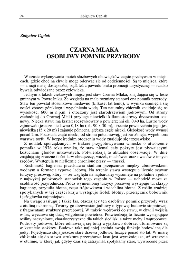 94 Zbigniew Cąplak Zbigniew Cąplak CZARNA MŁAKA OSOBLIWY POMNIK PRZYRODY W czasie wykonywania moich służbowych obowiązków często przebywam w miejscach, gdzie choć na chwilę mogę oderwać się od codzienności. Są to miejsca, które — z racji małej dostępności, bądź też z powodu braku promocji turystycznej — rzadko bywają odwiedzane przez człowieka. Jednym z takich ciekawych miejsc jest staw Czarna Młaka, znajdująca się w lesie gminnym w Powroźniku. Ze względu na małe rozmiary stanowi ona pomnik przyrody. Staw ten powstał stosunkowo niedawno (kilkaset lat temu), w wyniku osunięcia się części zbocza górskiego i wypełnienia wodą. Ten naturalny zbiornik znajduje się na wysokości 600 m n.p.m. i otoczony jest starodrzewiem jodłowym. Od strony zachodniej do Czarnej Młaki przylega niewielki kilkunastoarowy drzewostan sosnowy. Niecka stawu ma kształt soczewkowaty o powierzchni ok. 0,40 ha. Lustro wody zajmowało jeszcze niedawno 0,18 ha (ok. 90 x 30 m), obecnie powierzchnia jego jest niewielka (15 x 20 m) i zajmuje północną, głębszą część niecki. Głębokość wody wynosi ponad 2 m. Pozostała część niecki, od stronu południowej, jest zarośnięta, wypełniona warstwą torfu. W bezpośrednim otoczeniu wody znajduje się trzęsawisko. Z notatek sporządzanych w trakcie przygotowywania wniosku o utworzenie pomnika w 1976 roku wynika, że staw niemal cały pokryty jest pływającymi kożuchami glonów nitkowatych. Potwierdzają to aktualne obserwacje. W dnie znajdują się znaczne ilości larw chrząszczy, ważek, muchówek oraz owadów z innych rzędów. Występują tu nielicznie chronione płazy — traszki. Roślinność bagienna przedstawia stadium przejściowe między zbiorowiskiem wodnym a formacją typowo lądową. Na terenie stawu występuje licznie szuwar turzycy prosowej, który — ze względu na najbardziej wysunięte na południe i jedno z najwyżej położonych stanowisk tego zespołu w Polsce — uchodzić może za osobliwość przyrodniczą. Prócz wymienionej turzycy prosowej występuje tu: skrzyp bagienny, przytulia błotna, rzęsa trójrowkowa i wiechlina błotna. Z roślin rzadziej spotykanych w tej części kraju występuje fiołek błotny, przełącznik bobownik i jeżogłówka najmniejsza. Na uwagę zasługuje także las, otaczający ten osobliwy pomnik przyrody wraz z otuliną ochronną. Tworzy go drzewostan jodłowy o typowej budowie stopniowej, z fragmentami struktury przerębowej. W trakcie wędrówki do stawu, w chwili wejścia w las, wyczuwa się dużą wilgotność powietrza. Potwierdzają to licznie występujące rośliny naczyniowe, charakterystyczne dla takich siedlisk, a także mchy i wątrobowce. Podrosty jodłowe, które odnawiają się tutaj wyjątkowo dobrze, uformowane są w kształcie stożków. Budowa taka najlepiej spełnia swoją funkcję hodowlaną dla jodły. Pojedynczo stoją jeszcze stare drzewa jodłowe, liczące ponad sto lat. W miarę zbliżania się do stawu struktura przerębowa lasu jest wyraźniejsza, aż wreszcie w otulinie, w której jak gdyby czas się zatrzymał, spotykamy stare, wywrócone przez Czarna Młaka. Osobliwy pomnik przyrody 95 wiatr drzewa. W chwili, gdy z gęstwin wyłania się lustro wody, ciszę przerwać mogą zrywające się do lotu dzikie kaczki — po nich pozostaje tylko milczenie lasu. Miejsce to zachowało swój niesamowity, piękny obraz dzięki temu, że odwiedzają go nieliczni wędrowcy, choć w odległości około 100 metrów od stawu przebiega niebieski szlak turystyczny Powroźnik — Leluchów. Spokój i urok tego zakątka powoduje, że ci „nieliczni” chcą zachować go bez zmian — dla przyrody, dla siebie, dla następnego pokolenia... Staw Czarna Mlaka w latach siedemdziesiątych (fot. Stanisław Gajewski)