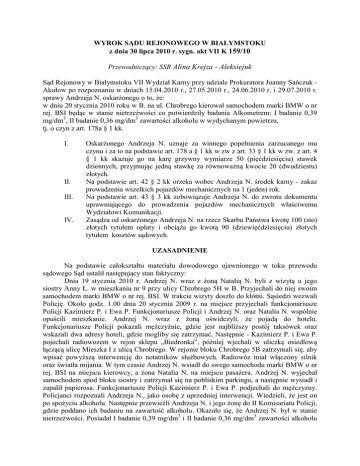 WYROK SĄDU REJONOWEGO W BIAŁYMSTOKU z dnia 30 lipca 2010 r. sygn. akt VII K 159/10 Przewodniczący: SSR Alina Krejza - Aleksiejuk Sąd Rejonowy w Białymstoku VII Wydział Karny przy udziale Prokuratora Joanny Sańczuk Akułow po rozpoznaniu w dniach 15.04.2010 r., 27.05.2010 r., 24.06.2010 r. i 29.07.2010 r. sprawy Andrzeja N. oskarżonego o to, że: w dniu 20 stycznia 2010 roku w B. na ul. Chrobrego kierował samochodem marki BMW o nr rej. BSI będąc w stanie nietrzeźwości co potwierdziły badania Alkometrem: I badanie 0,39 mg/dm3, II badanie 0,36 mg/dm3 zawartości alkoholu w wydychanym powietrzu, tj. o czyn z art. 178a § 1 kk. I. II. III. IV. Oskarżonego Andrzeja N. uznaje za winnego popełnienia zarzucanego mu czynu i za to na podstawie art. 178 a § 1 kk w zw z art. 33 § 1 kk w zw. z art. 4 § 1 kk skazuje go na karę grzywny wymiarze 50 (pięćdziesięciu) stawek dziennych, przyjmując jedną stawkę za równoważną kwocie 20 (dwudziestu) złotych. Na podstawie art. 42 § 2 kk orzeka wobec Andrzeja N. środek karny - zakaz prowadzenia wszelkich pojazdów mechanicznych na 1 (jeden) rok. Na podstawie art. 43 § 3 kk zobowiązuje Andrzeja N. do zwrotu dokumentu uprawniającego do prowadzenia pojazdów mechanicznych właściwemu Wydziałowi Komunikacji. Zasądza od oskarżonego Andrzeja N. na rzecz Skarbu Państwa kwotę 100 (sto) złotych tytułem opłaty i obciąża go kwotą 90 (dziewięćdziesięciu) złotych tytułem kosztów sądowych. UZASADNIENIE Na podstawie całokształtu materiału dowodowego ujawnionego w toku przewodu sądowego Sąd ustalił następujący stan faktyczny: Dnia 19 stycznia 2010 r. Andrzej N. wraz z żoną Natalią N. byli z wizytą u jego siostry Anny Ł. w mieszkaniu nr 9 przy ulicy Chrobrego 5H w B. Przyjechali do niej swoim samochodem marki BMW o nr rej. BSI. W trakcie wizyty doszło do kłótni. Sąsiedzi wezwali Policję. Około godz. 1.00 dnia 20 stycznia 2009 r. na miejsce przyjechali funkcjonariusze Policji Kazimierz P. i Ewa P. Funkcjonariusze Policji i Andrzej N. oraz Natalia N. wspólnie opuścili mieszkanie. Andrzej N. wraz z żoną oświdczyli, że pojadą do hotelu. Funkcjonariusze Policji pokazali mężczyźnie, gdzie jest najbliższy postój taksówek oraz wskazali dwa adresy hoteli, gdzie mogliby się zatrzymać. Następnie - Kazimierz P. i Ewa P. pojechali radiowozem w rejon sklepu „Biedronka”, później wjechali w uliczkę osiedlową łączącą ulicę Mieszka I z ulicą Chrobrego. W rejonie bloku Chrobrego 5B zatrzymali się, aby wpisać powyższą interwencję do notatników służbowych. Radiowóz miał włączony silnik oraz światła mijania. W tym czasie Andrzej N. wsiadł do swego samochodu marki BMW o nr rej. BSI na miejscu kierowcy, a żona Natalia N. na miejscu pasażera. Andrzej N. wyjechał samochodem spod bloku siostry i zatrzymał się na pobliskim parkingu, a następnie wysiadł i zapalił papierosa. Funkcjonariusze Policji Kazimierz P. i Ewa P. podjechali do mężczyzny. Policjanci rozpoznali Andrzeja N., jako osobę z uprzedniej interwencji. Wiedzieli, że jest on po spożyciu alkoholu. Następnie przewieźli Andrzeja N. i jego żonę do II Komisariatu Policji, gdzie poddano ich badaniu na zawartość alkoholu. Okazało się, że Andrzej N. był w stanie nietrzeźwości. Posiadał I badanie 0,39 mg/dm3 i II badanie 0,36 mg/dm3 zawartości alkoholu w wydychanym powietrzu. Zaś Natalia N. miała w I badaniu 0,54 mg/dm3 i w II badaniu 0,55 mg/dm3 zawartości alkoholu w wydychanym powietrzu. Powyższy stan faktyczny Sąd ustalił w oparciu o: notatkę urzędową (k. 1), protokoły użycia urządzenia kontrolno – pomiarowego (k. 2, 3), szkic (k. 47), kserokopie notatników służbowych (k. 94 – 101), zeznania świadków Kazimierza P. (k. 25v., 53 – 56), Ewy P. (k. 7v., 83 – 84) oraz częściowe zeznania świadków Anny Ł. (k. 78 – 79) i Natalii N. (k. 82 – 83, 84), a także częściowe wyjaśnienia oskarżonego Andrzeja N. (k. 14v., 51 – 52, 55, 82). Oskarżony Andrzej N. w toku postępowania przygotowawczego i sądowego nie przyznał się do popełnienia zarzuconego mu czynu. Wyjaśnił, że to nie on jechał samochodem będąc pod działaniem alkoholu, auto prowadziła jego żona Natalia N. Wskazał, że policja wcale nie jechała za nimi, tylko stała gdzieś z boku i dopiero po 20 sekundach jak już stali na parkingu, to policjanci do nich podjechali. Oskarżony podał, że stał na dworze, nie przebywał w samochodzie. W samochodzie po zaparkowaniu siedzieli z żoną około 20 sekund i po tym czasie podjechała policja, ale było to już po jak już się przesiedli i kiedy już wysiadł z samochodu (k. 14v.). Przed Sądem oskarżony wyjaśnił, że kiedy wyszli z mieszkania siostry, to mieli jechać taryfą, ale żona zgodziła się jechać samochodem. Podał, że podjechali kawałek, pokłócili się i kazał żonie zjechać na parking i zatrzymać auto. Nie mógł wysiąść z prawej strony z powodu skarpy śniegu, dlatego przesiedli się w samochodzie. Wskazał, że on usiadł na miejscu kierowcy, a żona na miejsce pasażera. Za chwilę wysiadł z auta, żeby zapalić papierosa. Postał może z 40 sekund i wtedy przyjechali policjanci. Następnie -funkcjonariusz policji polecił Andrzejowi N. wsiąść do radiowozu i tam stwierdził, że to on jechał samochodem.. Oskarżony wyjaśnił, że z prawej strony samochodu była skarpa śniegu, co było przyczyną, że musieli z żoną przesiąść się, aby w ten sposób oskarżony mógł wyjść z samochodu. Z żoną przesiedli się jednocześnie, to jest zamienili się miejscami (k. 51 – 52, 55, 82). Sąd zważył, co następuje: W niniejszej sprawie pozostawał bezspornym fakt, iż dniu 20 stycznia 2010 r. podczas badania na zawartość alkoholu w wydychanym powietrzu na II Komisariacie Policji w B. oskarżony Andrzej N. był w stanie nietrzeźwości. Miał w I badaniu - 0,39 mg/dm3 i II badaniu - 0,36 mg/dm3 zawartości alkoholu w wydychany