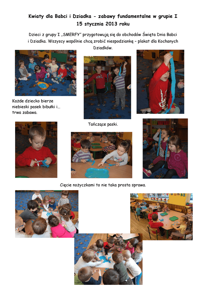 Kwiaty dla Babci i Dziadka - zabawy fundamentalne w grupie I 15 stycznia 2013 roku Dzieci z grupy I „SMERFY” przygotowują się do obchodów Święta Dnia Babci i Dziadka. Wszyscy wspólnie chcą zrobić niespodziankę – plakat dla Kochanych Dziadków. KaŜde dziecko bierze niebieski pasek bibułki i… trwa zabawa. Tańczące paski. Cięcie noŜyczkami to nie taka prosta sprawa. Kolorowe kwiaty z plasteliny.