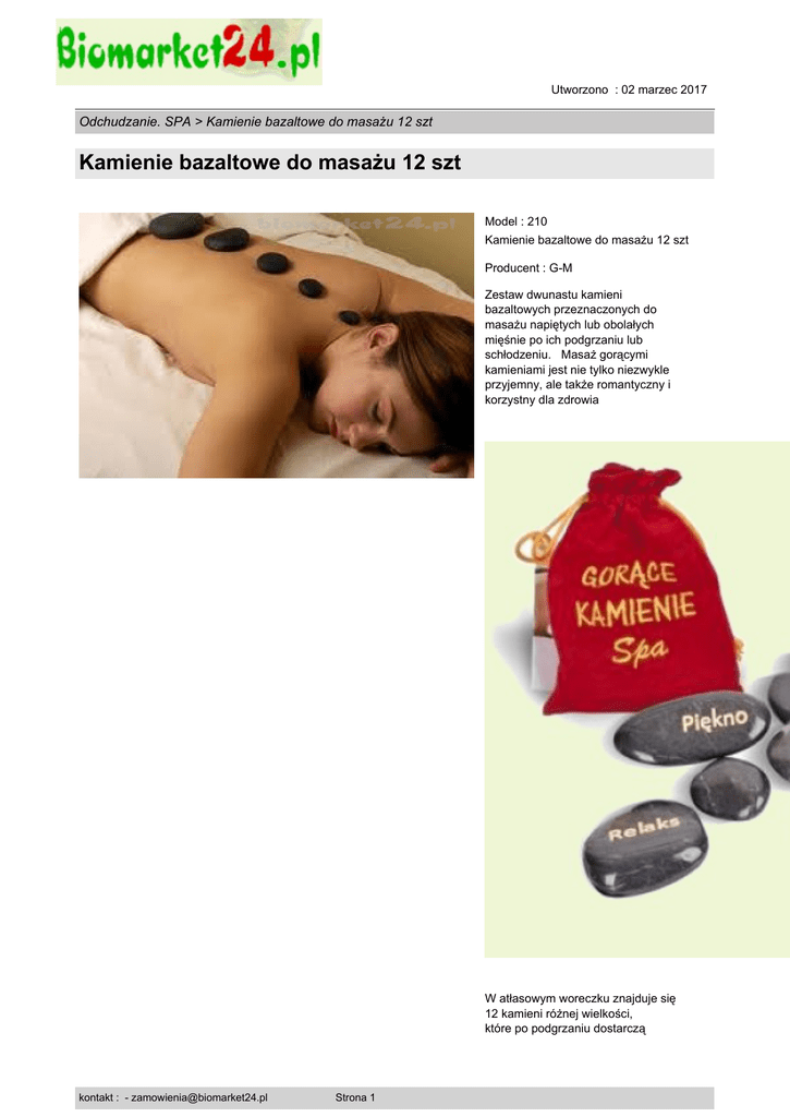 Utworzono : 02 marzec 2017 Odchudzanie. SPA > Kamienie bazaltowe do masażu 12 szt Kamienie bazaltowe do masażu 12 szt Model : 210 Kamienie bazaltowe do masażu 12 szt Producent : G-M Zestaw dwunastu kamieni bazaltowych przeznaczonych do masażu napiętych lub obolałych mięśnie po ich podgrzaniu lub schłodzeniu. Masaż gorącymi kamieniami jest nie tylko niezwykle przyjemny, ale także romantyczny i korzystny dla zdrowia W atłasowym woreczku znajduje się 12 kamieni różnej wielkości, które po podgrzaniu dostarczą kontakt : - [email protected] Strona 1 Utworzono : 02 marzec 2017 Odchudzanie. SPA > Kamienie bazaltowe do masażu 12 szt Kamienie bazaltowe do masażu 12 szt zmysłowych wrażeń. Gorące kamienie to także piękny i oryginalny prezent dla bliskiej osoby. Produkt w szczegółach: - zestaw 12 kamieni do masażu umieszczonych w atłasowym woreczku - 3 największe kamienie mają wygrawerowane napisy: Piękno, Spokój, Relaks - doskonały pomysł na prezent kontakt : - [email protected] Strona 2 Utworzono : 02 marzec 2017 Odchudzanie. SPA > Kamienie bazaltowe do masażu 12 szt Kamienie bazaltowe do masażu 12 szt kontakt : - [email protected] Strona 3 Utworzono : 02 marzec 2017 Odchudzanie. SPA > Kamienie bazaltowe do masażu 12 szt Kamienie bazaltowe do masażu 12 szt Cena : 24,99 zł Brutto ( 20,32 zł Netto) Dostępność: Produkt dostępny w naszym sklepie od 12 kwiecień 2011 kontakt : - [email protected] Strona 4