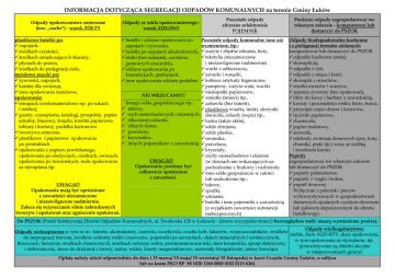 INFORMACJA DOTYCZĄCA SEGREGACJI ODPADÓW KOMUNALNYCH na terenie Gminy Łuków Odpady opakowaniowe zmieszane (tzw. „suche") - worek ŻÓŁTY plastikowe butelki po: napojach, środkach czystości, środkach zmiękczających tkaniny, płynach do prania, środkach do pielęgnacji ciała, metalowe puszki po: żywności, napojach, karmie dla zwierząt, inne opakowania metalowe, opakowania: tetrapack (wielomateriałowe np. po sokach i mleku), gazety, czasopisma, katalogi, prospekty, papier szkolny, biurowy, książki, torebki papierowe, tekturę i kartony, pudełka kartonowe. tworzywa sztuczne, plastikowe i papierowe opakowania po produktach opakowania z papieru powlekanego, opakowania po słodyczach, ciastkach, owocach, opakowania po mrożonkach, małe opakowania ze styropianu itp. Odpady ze szkła opakowaniowego worek ZIELONY Pozostałe odpady zbierane selektywnie POJEMNIK Pozostałe odpady komunalne inne niż wymienione, itp.: zużyte i zbędne ubrania, buty, tekstylia (niezamoczone i niezawilgocone nadmiernie) worki z odkurzacza, sznurki i wstążki, kobiece artykuły higieniczne, pampersy, zużyta wata, waciki niedopałki papierosów, NIE WRZUCAMY!!! zmiotki (śmieci) itp., Innego szkła gospodarczego np.: zabawki (bez baterii), talerzy, plastikowe wiadra, miski, skrzynki szyb samochodowych i okiennych, doniczki, szlaufy (węże) itp., stłuczonej szklanki, lustra (także zbite), zbitych luster, szkło zbrojone, porcelany, szkło płaskie, kryształów, ceramika, innych pojemników z zawartością porcelana, kryształy, szyby samochodowe i okienne UWAGA!!! (w ilościach nie wskazujących na Opakowania powinny być pochodzenie z budowy i rozbiórek) całkowicie opróżnione inne szkło gospodarcze w całości z zawartości. lub uszkodzone itp.: UWAGA!!! talerze, Opakowania mają być opróżnione spodki, z zawartości niezamoczone szklanki, i niezawilgocone nadmiernie. butelki i inne pojemniki z zawartością Zaleca się oczyszczanie silnie zabrudzonych (z wyjątkiem zawartości substancji tworzyw i opakowań oraz zgniecenie opakowań. niebezpiecznych) butelki i szklane opakowania po napojach i żywności, butelki po napojach alkoholowych, słoiki (bez nakrętek, zacisków, gumowych uszczelek), szklane opakowania po kosmetykach, perfumach, inne opakowania szklane podobne Poniższe odpady zagospodarować we własnym zakresie - kompostować lub dostarczyć do PSZOK Odpady biodegradowalne kuchenne i z pielęgnacji terenów zielonych: kompostować lub dostarczyć do PSZOK odpadki kuchenne (stałe), skorupki jaj, odpadki z ryb, odpadki z mięsa i kości, skorupki z orzechów, resztki owoców i warzyw, zepsuta żywność (bez opakowań), filtry do kawy i herbaty z zawartością, kwiaty i pozostałości roślin, liście, trawa, przycięte części drzew i krzewów, ręczniki papierowe, chusteczki, papier toaletowy, serwetki, odchody zwierząt domowych (psy, koty, chomiki, ptaki itp.) wraz ze ściółką i resztkami karmy . Popioły zagospodarować we własnym zakresie lub dostarczyć do PSZOK popioły paleniskowe, popioły z węgla i koksu, popiół drzewny. Wyłącznie z palenisk i pieców wykorzystywanych w gospodarstwach domowych opalanych czystym drewnem lub paliwem dopuszczonym do obrotu handlowego. Do PSZOK (Punkt Selektywnej Zbiórki Odpadów Komunalnych, ul. Świderska 128 w Łukowie - dawne wysypisko śmieci) bezwzględnie trafić muszą wymienione poniżej: Odpady wielkogabarytowe Odpady niebezpieczne w tym m in.: baterie, akumulatory, żarówki, świetlówki, resztki farb, lakierów, rozpuszczalników, środków meble, duże AGD-RTV, duże opakowania, do impregnacji drewna, środków ochrony roślin i nawozów, pojemniki po aerozolach, olejach mineralnych i syntetycznych, w tym opakowania ze styropianu, itp. tłuszczach, benzynie, środkach chemicznych, środkach ochrony roślin, przeterminowane leki, stare kosmetyki, sprzęt elektryczny (przewidywane są zbiórki akcyjne i elektroniczny, tusze do drukarek i tonery, taśmy wideo, kasety magnetofonowe, materiały fotograficzne, taśmy barwiące. w miejscowościach gminy) Opłatę należy uiścić odpowiednio do dnia ( 15 marca/ 15 maja/ 15 września/ 15 listopada) w kasie Urzędu Gminy Łuków, u sołtysa lub na konto PKO BP 88 1020 1260 0000 0102 0115 6264
