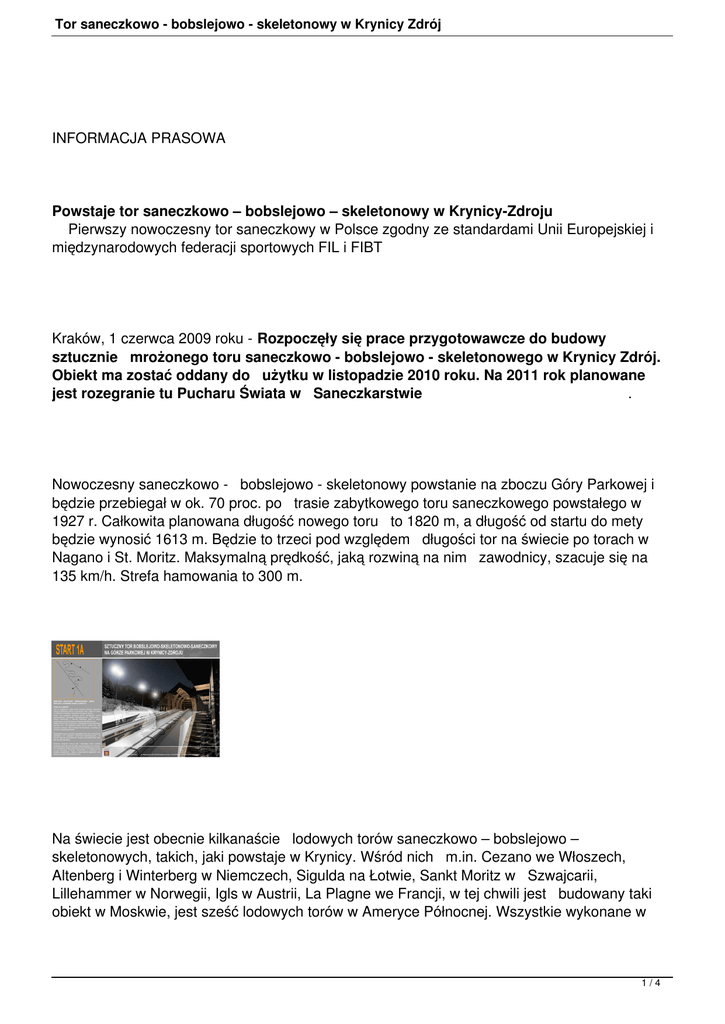 Tor saneczkowo - bobslejowo - skeletonowy w Krynicy Zdrój INFORMACJA PRASOWA Powstaje tor saneczkowo – bobslejowo – skeletonowy w Krynicy-Zdroju Pierwszy nowoczesny tor saneczkowy w Polsce zgodny ze standardami Unii Europejskiej i międzynarodowych federacji sportowych FIL i FIBT Kraków, 1 czerwca 2009 roku - Rozpoczęły się prace przygotowawcze do budowy sztucznie mrożonego toru saneczkowo - bobslejowo - skeletonowego w Krynicy Zdrój. Obiekt ma zostać oddany do użytku w listopadzie 2010 roku. Na 2011 rok planowane jest rozegranie tu Pucharu Świata w Saneczkarstwie . Nowoczesny saneczkowo - bobslejowo - skeletonowy powstanie na zboczu Góry Parkowej i będzie przebiegał w ok. 70 proc. po trasie zabytkowego toru saneczkowego powstałego w 1927 r. Całkowita planowana długość nowego toru to 1820 m, a długość od startu do mety będzie wynosić 1613 m. Będzie to trzeci pod względem długości tor na świecie po torach w Nagano i St. Moritz. Maksymalną prędkość, jaką rozwiną na nim zawodnicy, szacuje się na 135 km/h. Strefa hamowania to 300 m. Na świecie jest obecnie kilkanaście lodowych torów saneczkowo – bobslejowo – skeletonowych, takich, jaki powstaje w Krynicy. Wśród nich m.in. Cezano we Włoszech, Altenberg i Winterberg w Niemczech, Sigulda na Łotwie, Sankt Moritz w Szwajcarii, Lillehammer w Norwegii, Igls w Austrii, La Plagne we Francji, w tej chwili jest budowany taki obiekt w Moskwie, jest sześć lodowych torów w Ameryce Północnej. Wszystkie wykonane w 1/4 Tor saneczkowo - bobslejowo - skeletonowy w Krynicy Zdrój technologii sztucznie mrożonego toru z zachowaniem wszelkich możliwych wymogów dotyczących ochrony środowiska i zabezpieczeń środowiskowych. - Modernizacja legendarnego toru w Krynicy Zdrój i przekształcenie go w nowoczesny obiekt saneczkowo – bobslejowo – skeletonowy jest szansą na renesans dyscyplin sportów saneczkowych w naszym kraju, - mówi Jan Błoński, prezes Polskiego Związku Sportów Saneczkowych. – Teraz, nie mając własnego obiektu, polscy saneczkarze muszą jeździć trenować do Siguldy czy Lillehammer. Dysponując mrożonym torem możemy się spodziewać, że to do Polski przyjeżdżać będą sportowcy z Litwy, Łotwy, Węgier, Rosji, Ukrainy, Słowacji czy Rumunii. Powstanie w Krynicy nowoczesnego toru stworzyłoby nowe miejsce treningowe dla zawodników z całego regionu Europy Środkowowschodniej. Dodatkowym atutem przemawiającym za modernizacją toru jest deklaracja Międzynarodowej Federacji Sportów Saneczkowych, że w momencie gdy obiekt powstanie, to w Krynicy będą lokowane wydarzenia rangi mistrzostwa Europy i Świata, w tym corocznie zawody Pucharu Świata. Kompleks stanowi również ogromny potencjał dla rozwoju Krynicy. Znane uzdrowisko będzie słynąć nie tylko z właściwości leczniczych, ale również stanie się centrum sportów zimowych. Dzięki rozgrywaniu prestiżowych zawodów na poziomie pucharu Europy i świata, Krynica znów zasłynie na arenie międzynarodowej. Zwiększy się atrakcyjność turystyczna miejscowości, nastąpi rozwój lokalnego biznesu. Tory saneczkowo – bobslejowo skeletonowe nie tylko skupiają dyscypliny sportu związane z saneczkarstwem, ale też tworzą centra turystyczno-rekreacyjne. Generują inny typ funkcjonowania ośrodka, nadają nowego kolorytu miejscowości, w której są zlokalizowane. Poza formalnymi zawodami sportowymi obiekty te są miejscem organizowania bardzo różnych form rozrywek o charakterze masowo-sportowym, i to zarówno w lecie jak i zimie. Sztucznie mrożone tory saneczkowe dodatkowo są dużą atrakcją turystyczną dla regionu. Każdy turysta może przejechać się w ramach rozrywki sankami lub bobslejem za odpowiednią opłatą. Obiekty stanowią znaczące źródło zysku. W Europie Zachodniej jeden amatorski zjazd sankami kosztuje ok. 10 euro, za przejazd bobslejem trzeba zapłacić nawet 50 euro. Obok torów tworzone jest odpowiednie zaplecze, powstają hotele, restauracje, wypożyczalnie sprzętu, szkoły nauki jazdy. Powstają firmy proponujące nowe usługi np. taxi-bob, czyli zjazd bobslejem z doświadczonym trenerem. Kurorty turystyczne starają się przyciągnąć nowych amatorów tego sportu oferując im dodatkowe atrakcje np. możliwość zjazdów w nocy na sztucznie oświetlonych torach. - Utrzymanie toru na przykład w Koenigsee kosztuje 250 tys. euro. W całej Europie zjazd jednego saneczkarza kosztuje 20 euro, bobslejowej dwójki 40 euro, czwórki 50 euro. Musimy 2/4 Tor saneczkowo - bobslejowo - skeletonowy w Krynicy Zdrój to płacić wszyscy niezależnie gdzie jesteśmy. Wystarczy 12 500 ślizgów saneczkarzy i jest kwota potrzebna na utrzymanie toru. Na wspomnianych torze w Koenigsee oddaje się 30-36 tys. ślizgów w ciągu sezonu - mówi trener polskiej kadry olimpijskiej i narodowej saneczkarzy Marek Skowroński. Władze samorządowe Krynicy Zdrój rozpoczęły przygotowania do inwestycji w 2005 r. Mając na uwadze dobro środowiska naturalnego, przed podjęciem decyzji o modernizacji toru zlecono szereg badań i opracowań analitycznych. Zespoły pod kierunkiem uznanych naukowców w dziedzinie geologii i hydrologii wykonały ekspertyzy hydrologiczną oraz geologiczną. Następnie sporządzono projekt prac inżynierskich z wytycznymi, jakie warunki muszą zostać spełnione w celu zabezpieczenia bogactw mineralnych Góry Parkowej. Ministerstwa Sportu zdecydowało się na dotację w wysokości 30 mln zł, co stanowi prawie połowę kosztów budowy. W oparciu o projekt prac inżynierskich został wykonany projekt budowlany, który został pozytywnie zaopiniowany przez wszystkie wymagane w tym zakresie instytucje i wydano pozwolenie na budowę. Od początku XX wieku Krynica była liczącym się na świecie ośrodkiem saneczkarstwa, w 1909 roku powstała pierwsza w Polsce sekcja saneczkarska w Krynicy, a w 1919 roku rozpoczęto budowę toru saneczkowego na Górze Parkowej w Krynicy. W roku 1935 odbył