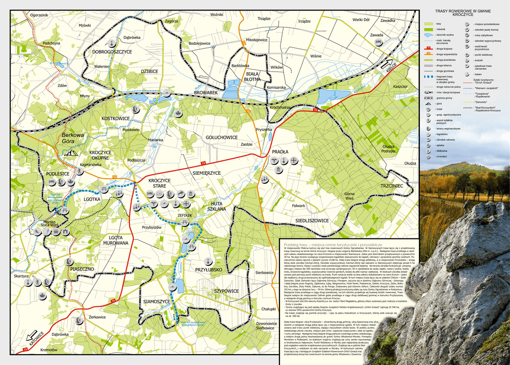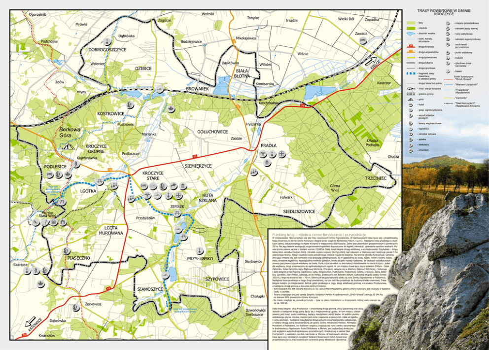 Przebieg trasy – miejsca cenne turystycznie i przyrodniczo W miejscowości Mokrus kończy się sieć tras rowerowych Gminy Ogrodzieniec. W Siamoszycach trasa łączy się z projektowaną trasą rowerową na ternie Gminy Kroczyce i biegnie przez wzgórze Bieńkówka (436 m. n.p.m.). Następnie trasa przebiega w okolicach zalewu zlokalizowanego na rzece Krztynia w miejscowości Siamoszyce. Zalew jest zbiornikiem przepływowym o powierzchni 20 ha. Na jego terenie występuje zorganizowane kąpielisko dopuszczone do kąpieli, rekreacji i uprawiania sportów wodnych. Powierzchnia zalewu łącznie z plażami wynosi 23,88 ha. Dalej trasa biegnie drogą asfaltową, a w miejscowości Przyłubsko – drogą leśną obok ośrodka Ciechan-Zdrój. Ośrodek wypoczynkowy Ciechan-Zdrój nad zalewem w Siamoszycach obejmuje ponad 5 ha zalesionego terenu. Klasę I czystości wody potwierdzają robione regularnie badania. Na terenie ośrodka funkcjonuje: camping oferujący miejsce dla 300 namiotów oraz przyczep campingowych, 50 m zjeżdżalnia do wody, kajaki, rowery wodne, łodzie, molo, strzeżone kąpielisko, wypożyczalnia rowerów górskich, boisko do piłki nożnej i siatkowej. W okolicach ośrodka zlokalizowany jest pierwszy punk widokowy na trasie. Punk roztacza widok na dwa zalewy zlokalizowane na rzece Krztyni – jeden dla wędkarzy, drugi przeznaczony do ogólnodostępnych kąpieli. W tym miejscu trasa łączy się ze szlakiem Żółtym – Szlak Zamonitu. Szlak Zamonitu łączy Dąbrowę Górniczą z Porajem; zaczyna się w dzielnicy Dąbrowy Górniczej - Gołonogu i dalej biegnie przez Pogorię, Ząbkowice, Łękę, Niegowonice, Hutki Kanki, Podzamcze, Giebło, Kroczyce, Zdów, Bobolice, Gorzków, Złoty Potok, Zaborze, aż do Poraja. Znakowany jest kolorem żółtym. Całkowita długość szlaku wynosi 102 km, z tego na obszarze Jury – 76 km. Główną atrakcją turystyczną szlaku są ruiny Zamku Ogrodzieniec w Podzamczu. Następnie trasa przebiega w ciągu drogi powiatowej, na tym odcinku projektuje się budowę ścieżki rowerowej. Trasa biegnie kolejno do miejscowości Zefirek gdzie przebiega w ciągu drogi asfaltowej gminnej w kierunku Przybyszowa, a następnie drogą gminną w kierunku centrum Kroczyc. - W Kroczycach stoi XIX wieczny Kościół p.w. św. Jacka i Marii Magdaleny, główny ołtarz wykonany jest z kalcytu w kształcie Groty z Lourdes. - Tereny znajdujące się pod opieką Zespołu Jurajskich Parków Krajobrazowych „Orlich Gniazd” zajmują 10 346 ha, co stanowi 94% powierzchni Gminy Kroczyce. - Na trasie znajduje się pomnik przyrody – Lipa na placu Kościelnym w Kroczycach, której wiek szacuje się na ok. 500 lat. Dalej trasa biegnie: ulicą Przybyszów – utwardzoną drogą gminną, ulicą Spacerową oraz ulicą Jeziorki a następnie drogą polną łączy się z miejscowością Lgotka. W tym miejscu zlokalizowany jest trzeci punkt widokowy, będący nieużytkiem wśród lasów. W pobliżu punktu widokowego płynie rzeczka, miejsce jest ciche i zapewnia wypoczynek z dala od zgiełku i ruchu ulicznego. Następnie trasa biegnie drogą polną do czwartego punktu widokowego, a kolejno drogą polną nieutwardzoną do granic Gminy Włodowice-Morsko. Pomiędzy Morskiem a Podlesiami, na skalistym wzgórzu znajdują się ruiny zamku nazywanego w średniowieczu Hąkowcem. Punkt Widokowy w Morsku jest najbardziej atrakcyjny pod względem walorów krajobrazowo-przyrodniczych. Znajduje się w paśmie Skał Kroczyckich, z widokiem na stok narciarski w Morsku. W końcowym odcinku trasa łączy się z istniejącym Jurajskim Szlakiem Rowerowym Orlich Gniazd oraz projektowaną siecią tras rowerowych na terenie gminy Włodowice i Zawiercia. Jaskinia Głęboka - długość 160m, deniwelacja 16,5m, wysokość otworu 380m n.p.m. Jaskinia turystyczna, ogólnodostępna, poziomy układ korytarzy. Zwiedzanie bez trudności. Szata naciekowa została zniszczona w wyniku eksploatacji kalcytu. Jaskinia znajduje się w Kruczych Skałach. Jaskinia Wielkanocna - długość 70m, głębokość 16m, otwór pionowy, wysokość otworu 380m n.p.m. Jaskinia rozpoczyna się pionową studnią o głębokości 12m. Dostępna wyłącznie przy użyciu sprzętu alpinistycznego. Wspinaczka Skały Kroczyckie Na zachód od Kroczyc rozciąga się pasmo wzniesień, które z racji znajdujących się na nich wielu ostańców skalnych nazwano Skałami Kroczyckimi. Najwyższym z nich jest Góra Zborów-Berkowa o wys. 462m n.p.m., będąca jednym z największych skupisk skał wapiennych na terenie Jury. Przybrały one różnorodne kształty przypominające postacie ludzkie Urząd Gminy 42-425 Kroczyce ul. Batalionów Chłopskich 29 tel. (34) 315 21 50-5 Przyłubsko - dwa zalewy zlokalizowane na rzece Krztyni, jeden dla wędkarzy, drugi ogólnodostępny do kąpieli. Powierzchnia 12,5ha. Teren niezagospodarowany, własność Skarbu Państwa. JUXSD Biała Błotna - kompleks stawów rybnych zlokalizowanych na rzece Białce. Powierzchnia 48,03ha. Właściciele prywatni. Siamoszyce - zalew zlokalizowany na rzece Krztyni. Zbiornik przepływowy, powierzchnia 20 ha, zor ganizowane kąpielisko. Nad zalewem położony jest Ośrodek Wypoczynkowy Ciechan-Zdrój dopuszczony do kąpieli, rekreacji i uprawiania sportów wodnych. Powierzchnia łącznie z plażami 23,88ha. Jaskinie Urząd Gminy 42-425 Kroczyce, ul. Batalionów Chłopskich 29, tel. (34) 315 21 50-5 e-mail: [email protected] Urząd Stanu Cywilnego 42-425 Kroczyce, ul. Batalionów Chłopskich 29, tel. (34) 315 21 50-5 Jaskinia Berkowa - długość 54m, wysokość otworów ok. 405m n.p.m. Jaskinia trudna do zwiedzania ze względu na zaciski. Posiada dwa otwory po przeciwnych stronach Góry Kołoczek. Dzibice - kompleks 4 zbiorników wodnych zlokalizowanych na rzece Białce. Jedno z najatrakcyjniejszych miejsc dla wędkarzy. Dwa zalewy, w tym jeden dostępny do kąpieli (niezagospodarowany). W sezonie można wynająć kajaki, łódki itp. na przystani przy zalewie. Powier