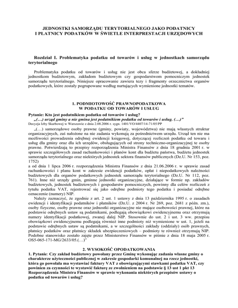 JEDNOSTKI SAMORZĄDU TERYTORIALNEGO JAKO PODATNICY I PŁATNICY PODATKÓW W ŚWIETLE INTERPRESTACJI URZĘDOWYCH Rozdział I. Problematyka podatku od towarów i usług w jednostkach samorządu terytorialnego Problematyka podatku od towarów i usług nie jest obca sferze budżetowej, a dokładniej jednostkom budżetowym, zakładom budżetowym czy gospodarstwom pomocniczym jednostek samorządu terytorialnego. Niniejsze opracowanie zawiera tezy i fragmenty orzecznictwa organów podatkowych, które zostały pogrupowane według nurtujących wymienione jednostki tematów. 1. PODMIOTOWOŚĆ PRAWNOPODATKOWA W PODATKU OD TOWARÓW I USŁUG Pytanie: Kto jest podatnikiem podatku od towarów i usług? „(…) urząd gminy a nie gmina jest podatnikiem podatku od towarów i usług. (…)” Decyzja Izby Skarbowej w Warszawie z dnia 2.08.2006 r. sygn. 1401/VO/4407/14-71/05/PP „(…) samorządowe osoby prawne (gminy, powiaty, województwa) nie mają własnych struktur organizacyjnych, zaś nałożone na nie zadania wykonują za pośrednictwem urzędu. Urząd ten nie ma możliwości prowadzenia odrębnej ewidencji księgowej, dotyczącej rozliczeń podatku od towaru i usług dla gminy oraz dla ich urzędów, obsługujących od strony techniczno-organizacyjnej te osoby prawne. Potwierdzają to przepisy rozporządzenia Ministra Finansów z dnia 18 grudnia 2001 r. w sprawie szczegółowych zasad rachunkowości i planów kont dla budżetu państwa, budżetu jednostek samorządu terytorialnego oraz niektórych jednostek sektora finansów publicznych (Dz.U. Nr 153, poz. 1752) a od dnia 1 lipca 2006 r. rozporządzenia Ministra Finansów z dnia 21.06.2006 r. w sprawie zasad rachunkowości i planu kont w zakresie ewidencji podatków, opłat i niepodatkowych należności budżetowych dla organów podatkowych jednostek samorządu terytorialnego (Dz.U. Nr 112, poz. 761). Inne niż urzędy gmin, gminne jednostki organizacyjne, działające w formie np. zakładów budżetowych, jednostek budżetowych i gospodarstw pomocniczych, powinny dla celów rozliczeń z tytułu podatku VAT, rejestrować się jako odrębne podmioty tego podatku i posiadać odrębne oznaczenie (numery) NIP. Należy zaznaczyć, że zgodnie z art. 2 ust. 1 ustawy z dnia 13 października 1995 r. o zasadach ewidencji i identyfikacji podatników i płatników (Dz.U. z 2004 r. Nr 269, poz. 2681 z późn. zm.), osoby fizyczne, osoby prawne oraz jednostki organizacyjne nie mające osobowości prawnej, które na podstawie odrębnych ustaw są podatnikami, podlegają obowiązkowi ewidencyjnemu oraz otrzymują numery identyfikacji podatkowej, zwanej dalej NIP. Stosownie do ust. 2 i ust. 3 ww. przepisu obowiązkowi ewidencyjnemu podlegają również inne podmioty niż wymienione w ust. 1, jeżeli na podstawie odrębnych ustaw są podatnikami, a w szczególności zakłady (oddziały) osób prawnych, płatnicy podatków oraz płatnicy składek ubezpieczeniowych – podmioty te również otrzymują NIP. Podobne stanowisko zostało zajęte przez Ministerstwo Finansów w piśmie z dnia 18 maja 2005 r. OS5-065-171-MG/2633/05.(…)” 2. WYSOKOŚĆ OPODATKOWANIA 1. Pytanie: Czy zakład budżetowy powołany przez Gminę wykonując zadania własne gminy o charakterze użyteczności publicznej w zakresie gospodarki komunalnej na rzecz jednostki, która go powołała ma wystawiać faktury VAT z obowiązującymi stawkami podatku VAT, czy powinien za czynności te wystawić fakturę ze zwolnieniem na podstawie § 13 ust 1 pkt 13 Rozporządzenia Ministra Finansów w sprawie wykonania niektórych przepisów ustawy o podatku od towarów i usług? ,, (…) Zakład budżetowy – świadcząc usługi z zakresu użyteczności publicznej na rzecz macierzystej Gminy nie może korzystać ze zwolnienia przewidzianego w § 13 ust. 1 pkt 12 i pkt 13 rozporządzenia z dnia 4 kwietnia 2011 r. usługi, jak i usługi podlegają opodatkowaniu podatkiem od towarów i usług na zasadach ogólnych z zastosowaniem właściwej stawki(…)’’. Postanowienie Urzędu Skarbowego w Katowicach z dnia 24.08.2012 r. sygn. IBPP3/443-523/12/AŚ ,, (…) W świetle art. 15 ust. 1 ustawy, podatnikami są osoby prawne, jednostki organizacyjne niemające osobowości prawnej oraz osoby fizyczne, wykonujące samodzielnie działalność gospodarczą, o której mowa w ust. 2, bez względu na cel i rezultat takiej działalności. Działalność gospodarcza – mocą art. 15 ust. 2 ustawy – obejmuje wszelką działalność producentów, handlowców lub usługodawców, w tym podmiotów pozyskujących zasoby naturalne oraz rolników, a także działalność osób wykonujących wolne zawody, również wówczas, gdy czynność została wykonana jednorazowo w okolicznościach wskazujących na zamiar wykonywania czynności w sposób częstotliwy. Działalność gospodarcza obejmuje również czynności polegające na wykorzystywaniu towarów lub wartości niematerialnych i prawnych w sposób ciągły dla celów zarobkowych. Podstawowa stawka podatku – na mocy art. 41 ust. 1 ustawy – wynosi 22%, z zastrzeżeniem ust. 2-12c, art. 83, art. 119 ust. 7, art. 120 ust. 2 i 3, art. 122 i art. 129 ust. 1. Natomiast stosownie do treści art. 146a pkt 1 ustawy, w okresie od dnia 1 stycznia 2011r. do dnia 31 grudnia 2013r., z zastrzeżeniem art. 146f, stawka podatku, o której mowa w art. 41 ust. 1 i ust. 13, art. 109 ust. 2 i art. 110, wynosi 23%. Jednakże zarówno w treści ustawy, jak i w przepisach wykonawczych do niej, ustawodawca przewidział opodatkowanie niektórych czynności stawkami obniżonymi lub zwolnienie od podatku. Na podstawie § 13 ust. 1 pkt 12 obowiązującego od dnia 6 kwietnia 2011r. rozporządzenia Ministra Finansów z dnia 4 kwietnia 2011r. w sprawie wykonania niektórych przepisów ustawy o podatku od towarów i usług (Dz. U. Nr 73, poz. 392 ze zm.) zwalnia się od podatku czynności związane z wykonywaniem zadań publicznych nałożonych odrębnymi przepisami, wykonywane w imieniu własnym i n