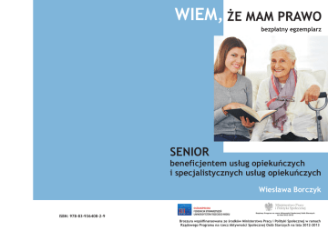 WIEM, ŻE MAM PRAWO bezpłatny egzemplarz SENIOR beneficjentem usług opiekuńczych i specjalistycznych usług opiekuńczych Wiesława Borczyk Ministerstwo Pracy i Polityki Społecznej ISBN: 978-83-936408-2-9 Rządowy Program na rzecz Aktywności Społecznej Osób Starszych na lata 2012-2013 Broszura współfinansowana ze środków Ministerstwa Pracy i Polityki Społecznej w ramach Rządowego Programu na rzecz Aktywności Społecznej Osób Starszych na lata 2012-2013 WIEM, ŻE MAM PRAWO SENIOR beneficjentem usług opiekuńczych i specjalistycznych usług opiekuńczych Wiesława Borczyk Nowy Sącz, grudzień 2013 OPRACOWANIE: Wiesława Borczyk WYDAWCA: Ogólnopolska Federacja Stowarzyszeń Uniwersytetów Trzeciego Wieku ADRES WYDAWCY: ul. Jagiellońska 18, 33-300 Nowy Sącz, tel./fax (+48 18) 443 57 08 e-mail: [email protected] www.federacjautw.pl KOREKTA: Joanna Jachimowicz ZDJĘCIE NA OKŁADCE: prawa autorskie - © Robert Kneschke - Fotolia.com skład i druk: Drukarnia NOWODRUK s.c. tel. (+48 18) 443 56 69 ISBN: 978-83-936408-2-9 NAKŁAD: 2000 sztuk Egzemplarz bezpłatny Broszura współfinansowana ze środków Ministerstwa Pracy i Polityki Społecznej w ramach Rządowego Programu na rzecz Aktywności Społecznej Osób Starszych na lata 2012-2013 2 SPIS TREŚCI: 1. Wybrane definicje...................................................................5 2. Usługi opiekuńcze i specjalistyczne usługi opiekuńcze.......................6 3. Postępowanie w sprawach przyznania usług opiekuńczych...................7 4. Minimalny zakres czynności w ramach świadczonych usług opiekuńczych i specjalistycznych usług opiekuńczych. Kwalifikacje osób świadczących usługi opiekuńcze................................................................. 13 5. Wymagania dotyczące świadczenia usług opiekuńczych (również przez podmioty niepubliczne), „Standard usług opiekuńczych dla osób starszych”.......................................................................... 17 6. Usługi opiekuńcze świadczone przez organizacje pozarządowe i inne podmioty . ........................................................................ 22 7. Przydatne informacje i strony internetowe................................... 23 3 4 1. WYBRANE DEFINICJE Pomoc społeczna jest instytucją polityki społecznej państwa. Ma na celu umożliwienie osobom, w tym również osobom starszym i rodzinom, przezwyciężanie trudnych sytuacji życiowych, których nie są w stanie pokonać, wykorzystując własne uprawnienia, zasoby i możliwości. Podstawowymi źródłami prawa w tym zakresie są: ustawa z dnia 2 marca 2004 r. o pomocy społecznej1 oraz akty wykonawcze. Pomocy społecznej udziela się m.in. osobom starszym i ich rodzinom z powodu ubóstwa, bezdomności, bezrobocia, niepełnosprawności, długotrwałej lub ciężkiej choroby, przemocy w rodzinie, bezradności w sprawach opiekuńczo-wychowawczych i prowadzenia gospodarstwa domowego, zdarzenia losowego i sytuacji kryzysowej, klęski żywiołowej lub ekologicznej. Świadczenia z pomocy społecznej mają charakter świadczeń pieniężnych oraz świadczeń niepieniężnych.To wyróżnienie jest oparte na rodzaju wsparcia dla osoby fizycznej, beneficjenta - świadczeniobiorcy, podopiecznego. Przy świadczeniach pieniężnych pomoc sprowadza się do przekazywania, na rzecz świadczeniobiorcy, określonych kwot pieniężnych. W katalogu świadczeń niepieniężnych mamy do czynienia ze świadczeniami zaspakajającymi elementarne potrzeby i pomagającymi rozpocząć nowe samodzielne życie. Są wśród nich świadczenia adresowane do osób starszych, chorych, niepełnosprawnych oraz środowisk marginalizowanych. Obejmują pomoc rzeczową i usługi, udzielanie porad i pomoc w walce z przemocą2. 1 2 art. 2 ustawy z dnia 2 marca 2004 r. o pomocy społecznej (t. j. Dz. U z 2013 r.,poz.182) art.36 ustawy z dnia 2 marca 2004 r. o pomocy społecznej 5 Szczególnie istotne znaczenie dla osób starszych mają usługi opiekuńcze oraz specjalistyczne usługi opiekuńcze świadczone w miejscu ich zamieszkania, o czym będzie mowa w niniejszym poradniku. Usługi opiekuńcze są organizowane i świadczone przez gminę na jej terenie. Jest to zadanie własne gminy z zakresu pomocy społecznej o charakterze obowiązkowym. Realizacja usług opiekuńczych odbywa się w miejscu zamieszkania osoby starszej i w jej najbliższym otoczeniu. W uzasadnionych wypadkach wybrane usługi mogą być świadczone w miejscu czasowego pobytu osoby starszej na terenie gminy, w szczególności w miejscu zamieszkania członka rodziny, u którego osoba starsza przebywa czasowo, lub w szpitalu (jako uzupełnienie dostępnej tam oferty usług). Ośrodek pomocy społecznej (OPS) jest odpowiedzialny za realizację usług opiekuńczych oraz specjalistycznych usług opiekuńczych. Może zlecać wykonanie usług opiekuńczych organizacjom pozarządowym oraz firmom prywatnym (podmiotom niepublicznym, realizatorom usług). 2. USŁUGI OPIEKUŃCZE I SPECJALISTYCZNE USŁUGI OPIEKUŃCZE Osobie samotnej, która z powodu wieku, choroby lub innych przyczyn wymaga pomocy innych osób, a jest jej pozbawiona, przysługuje pomoc w formie usług opiekuńczych lub specjalistycznych usług opiekuńczych. Osobą samotną jest osoba prowadząca jednoosobowe gospodarstwo domowe, niepozostająca w związku małżeńskim i nie posiadająca wstępnych ani zstępnych. Usługi opiekuńcze lub specjalistyczne usługi opiekuńcze mogą być przyznane również osobie, która wymaga pomocy innych osób, a rodzina, a także wspólnie niezamieszkujący małżonek, 6 wstępni, zstępni nie mogą jej takiej pomocy zapewnić. Oznacza to, że osobie niebędącej osobą samotną można przyznać usługi opiekuńcze dopiero wówczas, gdy najbliżsi członkowie rodziny nie mogą jej zapewnić opieki. Obowiązki te ciążą na małżonku, rodzicach, dzieciach, wnukach, pomimo że nie zamieszkują oni wspólnie z taką osobą. Usługi opiek