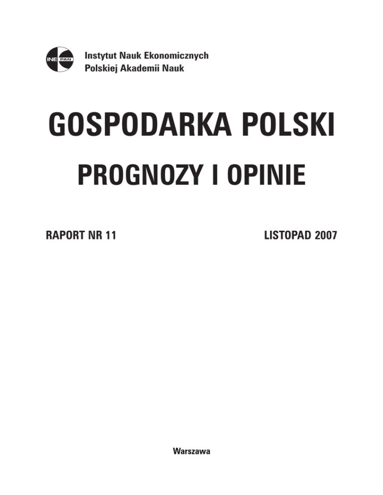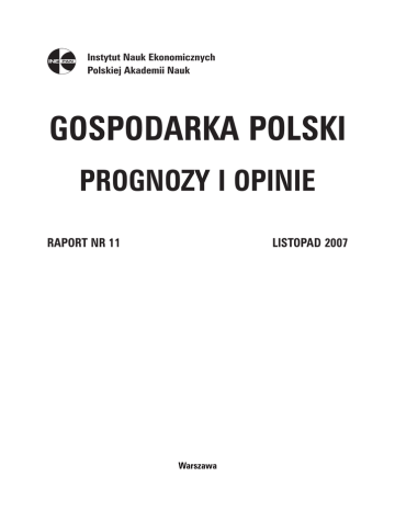 Instytut Nauk Ekonomicznych Polskiej Akademii Nauk GOSPODARKA POLSKI PROGNOZY I OPINIE RAPORT NR 11 LISTOPAD 2007 Warszawa Raport „Gospodarka Polski – Prognozy i Opinie” listopad 2007 przygotowa∏ Zespó∏ w sk∏adzie: KIEROWNIK ZESPO¸U I REDAKTOR NAUKOWY: Zbigniew Hockuba CZ¸ONKOWIE ZESPO¸U: Krzysztof Bartosik Iwona Fuda∏a-Poradziƒska ¸ukasz Hardt Stanis∏aw Kubielas Jerzy Mycielski Magdalena Olender-Skorek Les∏aw Pietrewicz Katarzyna Rosiak-Lada Cezary Wójcik Sylwia Zajàczkowska-Jakimiak Micha∏ Zajfert KONSULTACJA: Joanna Kotowicz-Jawor REDAKCJA: Krzysztof Kostro ISSN 1644-5430 © Copyright by Instytut Nauk Ekonomicznych PAN, 2007 MECENAT NAD RAPORTEM Realizacja wydawnicza Wydawnictwo Key Text sp. z o.o. ul. Górczewska 8, 01-180 Warszawa tel. 022 632 11 36, 022 632 11 39, fax 212 www.keytext.com.pl [email protected] Nak∏ad 500 egz. G ospodarka Polski ma za sobà kolejne pó∏rocze szybkiego wzrostu. Dynamika PKB w I kwartale bie˝àcego roku, gdy porównamy jà z danymi z kilku ostatnich lat, by∏a rekordowo wysoka – wynios∏a 7,4%. W II kwartale tempo wzrostu dochodu narodowego nieco spad∏o, dalej jednak przekracza∏o najwy˝sze wskaêniki z ubieg∏ego roku. Osiàgni´ty wzrost gospodarczy by∏ w g∏ównej mierze efektem du˝ej dynamiki popytu krajowego, na co sk∏ada∏y si´ szybkie przyrosty nak∏adów brutto na Êrodki trwa∏e i konsumpcji. Inwestycje wzrasta∏y w pierwszych dwóch kwarta∏ach 2007 roku w tempie oko∏o 25%, natomiast konsumpcja indywidualna o 6%. Wysoka dynamika PKB i szybko rosnàcy popyt krajowy doprowadzi∏y do znacznej przewagi importu nad eksportem, w rezultacie czego powi´ksza∏o si´ ujemne saldo na rachunku obrotów bie˝àcych. Nie stworzy∏o to jak dotàd zagro˝enia dla stabilnoÊci wzrostu. Dalsze korzystne zjawiska mia∏y miejsce na rynku pracy. Systematycznie mala∏o bezrobocie i dynamicznie ros∏a liczba nowo zatrudnionych. W przeciàgu 12 miesi´cy, od wrzeÊnia 2006 do wrzeÊnia 2007 roku stopa bezrobocia zmniejszy∏a si´ z ponad 15% do poni˝ej 12%, natomiast liczba zatrudnionych zwi´kszy∏a si´ o kilkaset tysi´cy. JednoczeÊnie pojawi∏o si´ nowe na polskim rynku pracy zjawisko, polegajàce na stosunkowo szybkim wzroÊcie wynagrodzeƒ, przewy˝szajàcym tempo wzrostu wydajnoÊci pracy. Do koƒca 2005 roku dynamika wydajnoÊci pracy by∏a wy˝sza od dynamiki wynagrodzeƒ, w zwiàzku z czym jednostkowe koszty pracy mala∏y. Rok 2006 przyniós∏ ich wzrost, pomimo tego inflacja utrzymywa∏a si´ przez ca∏y okres poni˝ej celu inflacyjnego NBP. W ostatnich miesiàcach lata, lipcu i sierpniu 2007, wynios∏a odpowiednio 2,3% i 1,5%. Niewykluczone, ˝e wyjaÊnienia relacji mi´dzy dynamikà jednostkowych kosztów pracy a inflacjà nale˝y szukaç w bardzo dobrej sytuacji finansowej przedsi´biorstw, a tak˝e w ich zachowaniach rynkowych w warunkach coraz to bardziej nasilajàcej si´ konkurencji. Przysz∏oÊç polskiej gospodarki, widziana przez pryzmat prognoz INE PAN, jest dobra. Wprawdzie lekkiemu obni˝eniu ulegnie tempo wzrostu PKB, lecz i tak wyniesie ono ponad 6% w po∏owie 2008 roku. W dalszym ciàgu motorem wzrostu b´dzie popyt krajowy, a w szczególnoÊci inwestycje przedsi´biorstw. Ich dynamiczny 20% przyrost przyczyni si´ w nieodleg∏ej przysz∏oÊci do zwi´kszenia mo˝liwoÊci produkcyjnych gospodarki Polski, które w tej chwili sà wykorzystane w ponad 80%. Wzrost produktu potencjalnego b´dzie z kolei skutkowa∏ ograniczeniem zagro˝eƒ zwiàzanych z inflacjà. Prognozowana na koniec 2007 roku i pierwsze pó∏rocze 2008 roku inflacja znajduje si´ w pobli˝u celu inflacyjnego NBP. Szybkie, choç zmniejszajàce si´ tempo wzrostu gospodarczego, przyniesie dalszy wzrost deficytu na rachunku obrotów bie˝àcych. Jest to zjawisko cz´sto wyst´pujàce w warunkach szybkiego rozwoju. Rzut oka w dalszà przysz∏oÊç rodzi pytanie o perspektywy utrzymania wysokiego tempa wzrostu. Polsce potrzebny jest wysoki wzrost, gdy˝ tylko on gwarantuje zmniejszenie dystansu ekonomicznego, jaki dzieli nas od wysokorozwini´tych krajów Europy i Êwiata. Jakkolwiek dalsze spowalnianie wzrostu, przewidywane przez szereg instytutów i oÊrodków prognostycznych jest mo˝liwe, to jednak nie powinno byç ono du˝e. Polska ma szans´ na trwa∏y, zrównowa˝ony, relatywnie wysoki wzrost, w szczególnoÊci wówczas, gdy w polityce gospodarczej stanie si´ on priorytetem. W Polsce istnieje potencja∏ wzrostu, którego pe∏ne wyzwolenie hamujà liczne bariery, ograniczajàce przedsi´biorczoÊç i swobod´ dzia∏alnoÊci gospodarczej. Reforma instytucji i regulacji, a tak˝e odpowiednie dostrojenie polityk makroekonomicznych, mogà staç si´ ko∏em zamachowym dalszego rozwoju polskiej gospodarki. Zbigniew Hockuba SPIS TREÂCI 1. Streszczenie . . . . . . . . . . . . . . . . . . . . . . . . . . . . . . . . . . . . . . . . . . . . . . . . . . . . . . . . . . . . . 7 2. Prognozy INE PAN – Katarzyna Rosiak-Lada, Jerzy Mycielski . . . . . . . . . . . . . . . . . . . . . . 2.1. Produkt krajowy brutto . . . . . . . . . . . . . . . . . . . . . . . . . . . . . . . . . . . . . . . . . . . . . . . . 2.2. Bezrobocie i rynek pracy . . . . . . . . . . . . . . . . . . . . . . . . . . . . . . . . . . . . . . . . . . . . . . . 2.3. Stopa procentowa i inflacja . . . . . . . . . . . . . . . . . . . . . . . . . . . . . . . . . . . . . . . . . . . . . 9 9 13 14 3. Sytuacja makroekonomiczna – Cezary Wójcik . . . . . . . . . . . . . . . . . . . . . . . . . . . . . . . . . . . 16 4. Sektor gospodarstw domowych – Krzysztof Bartosik . . . . . . . . . . . . . . . . . . . . . . . . . . . . . . 4.1. Konsumpcja . . . . . . . . . . . . . . . . . . . . . . . . . . . . . . . . . . . . . . . . . . . . . . . . . . . . . . . . . 4.2. Wynagrodzenia i Êwiadczenia spo∏eczne . . . . . . . . . . . . . . . . . . . . . . . . . . . . . . . . . . . 4.3. Rynek pracy . . . . . . . . . . . . . . . . . . . . . . . . . . . .